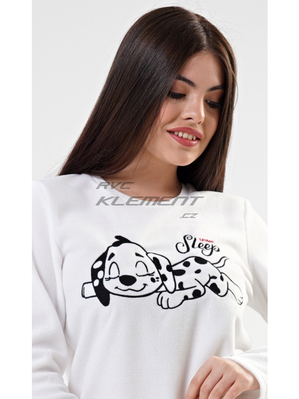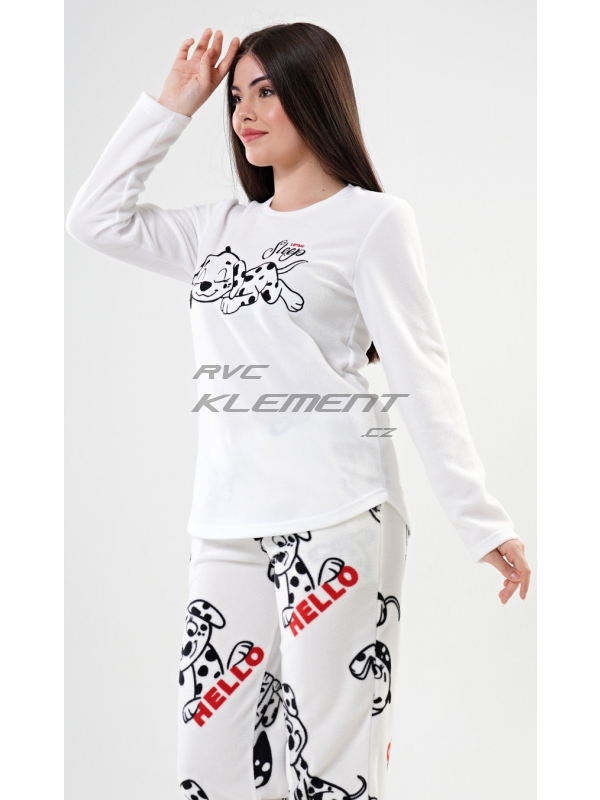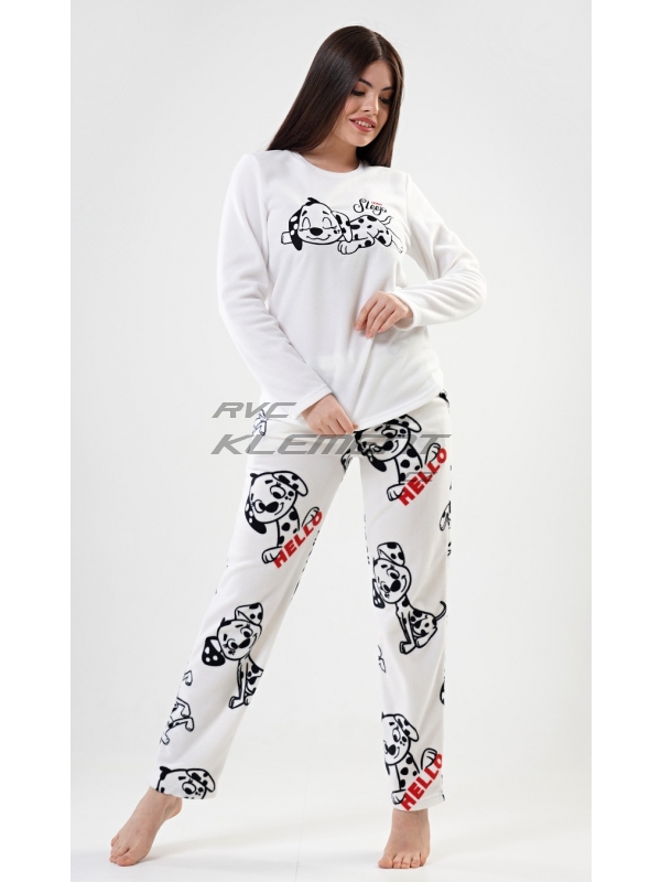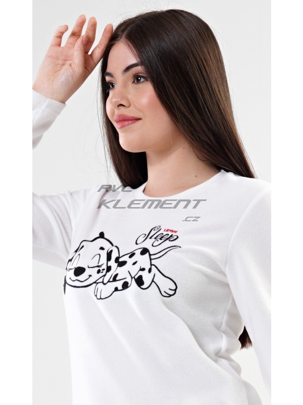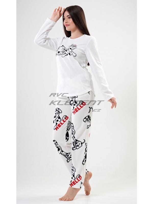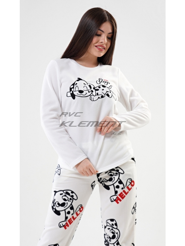 Dámské pyžamo dlouhé Sleep well. Dámské polarové dlouhé pyžamo Sleep well. Dámské pyžamo se skládá z trika s dlouhým rukávem a dlouhých kalhot. Triko je ozdobené aplikací - obrázkem spícího Dalmatina. Polarový materiál je hřejivý a příjemný na dotek. Vzorované kalhoty jsou do gumy, mají šňůrku na stažení a praktické kapsy, také jsou vyrobeny z polaru. Toto pyžamko je díky hřejivosti vhodné i jako domácí oblečení pro chladné dny. Pokyny pro údržbu: - 100% polyester Míry naměřené na výrobku: