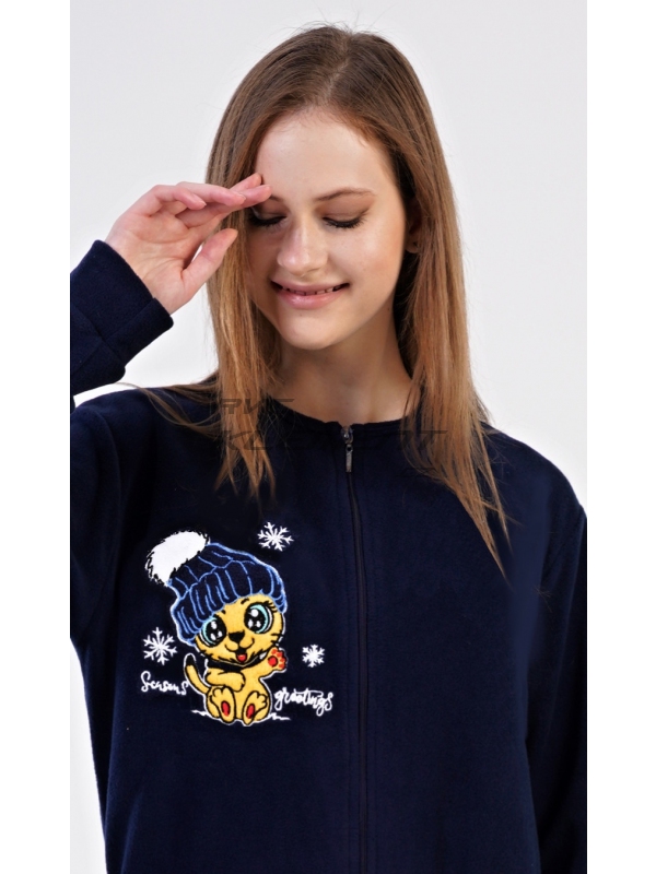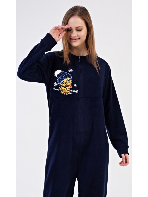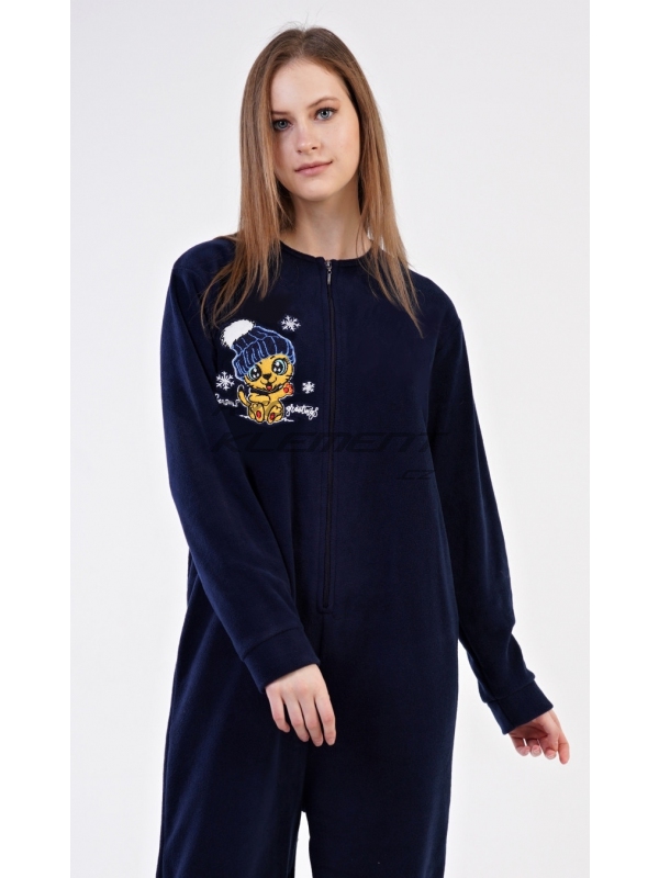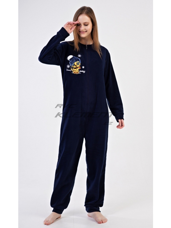 Dámský polarový overal Tygřík. Dámský overal má kulatý výstřih a zapínání na zip. Rukávy a kalhoty jsou zakončeny praktickými lemy. Decentní overal zdobí aplikace s motivem malého tygra, který má na sobě čepici s velkou bambulí. Na tmavě modrém podkladu je vyšitý nápis. Použitý materiál je hřejivý a poddajný na dotek, obzvláště ho oceníte v chladných zimních dnech.