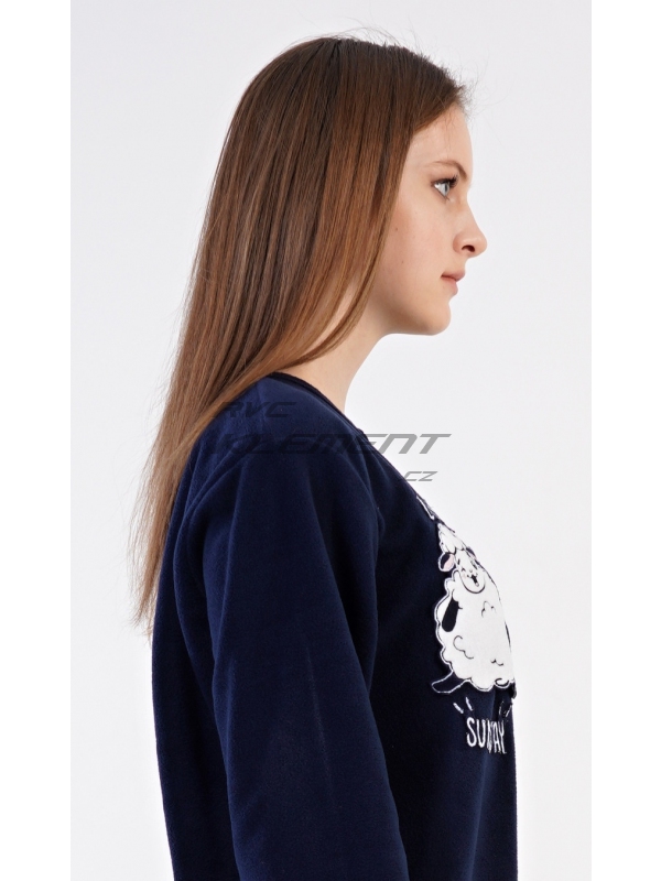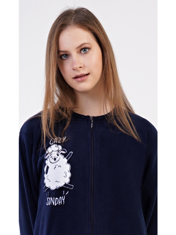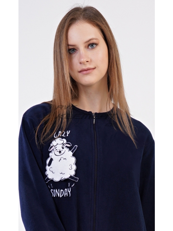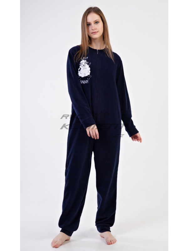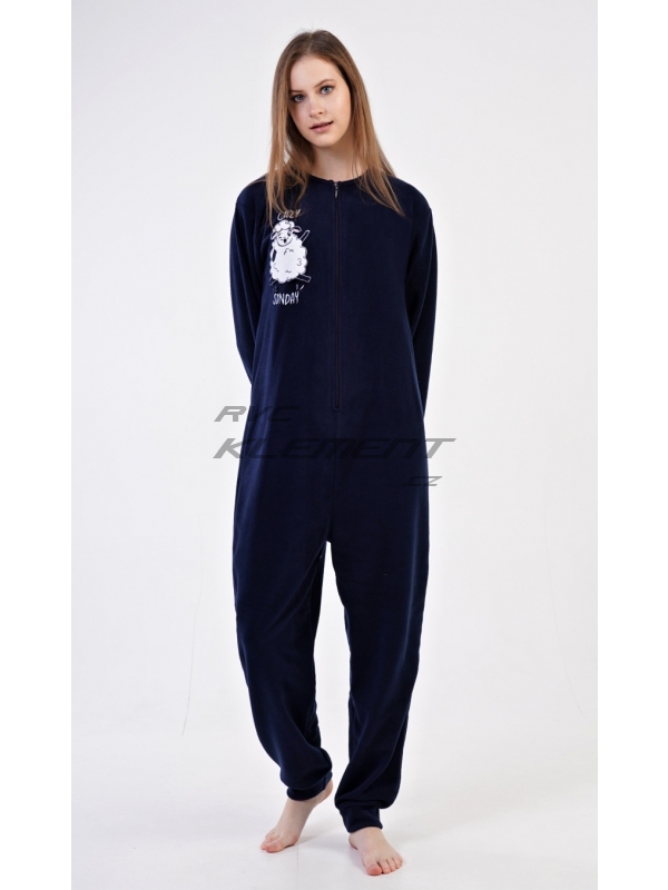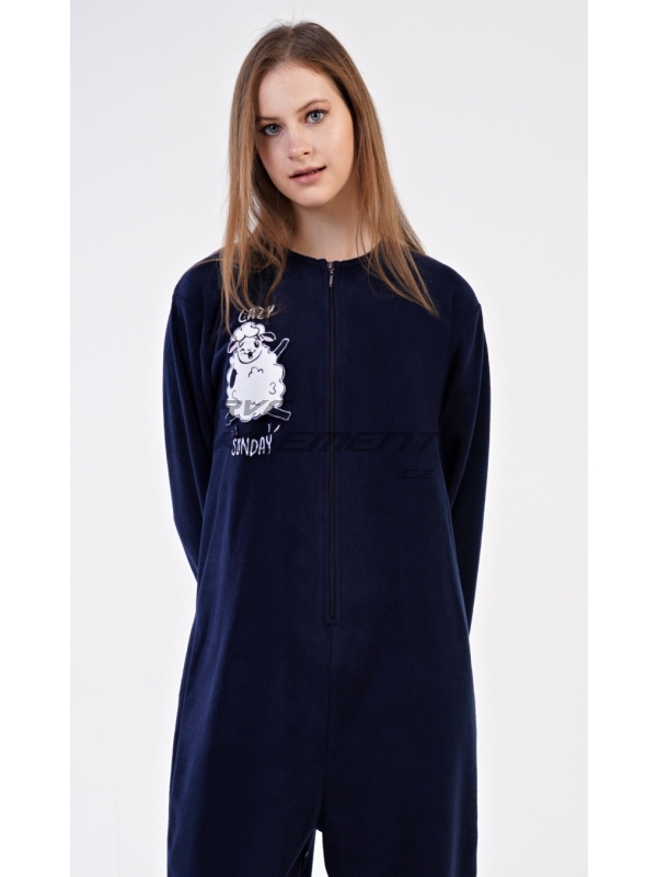 Dámský polarový overal Ovečka. Dámský polarový overal Ovečka. Dámský overal má kulatý výstřih a zapínání na zip. Rukávy a kalhoty jsou zakončeny praktickými lemy. Decentní overal zdobí aplikace s motivem veselé ovečky. Na tmavě modrém podkladu je vyšitý nápis ’Lazy sunday’. Použitý materiál je hřejivý a poddajný na dotek, obzvláště ho oceníte v chladných zimních dnech. Pokyny pro údržbu: - 100% polyester