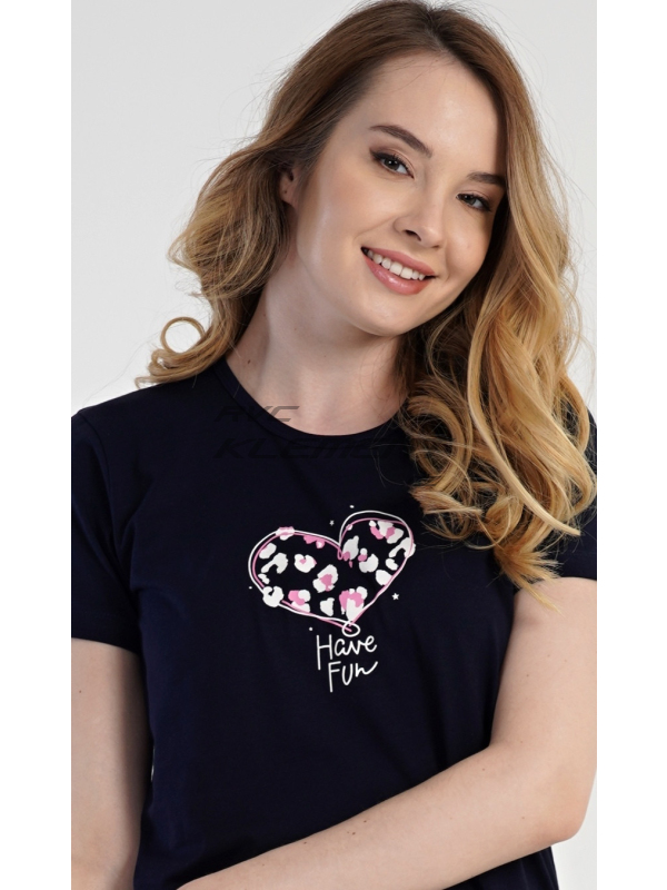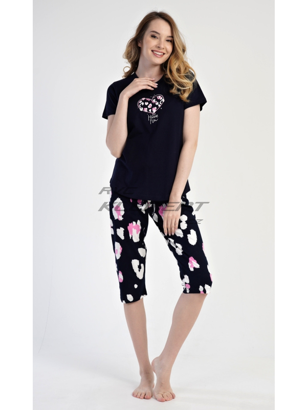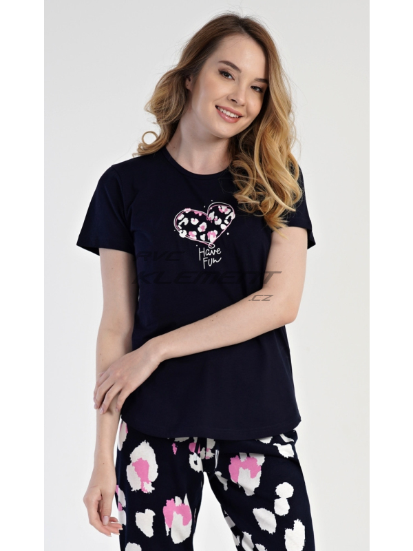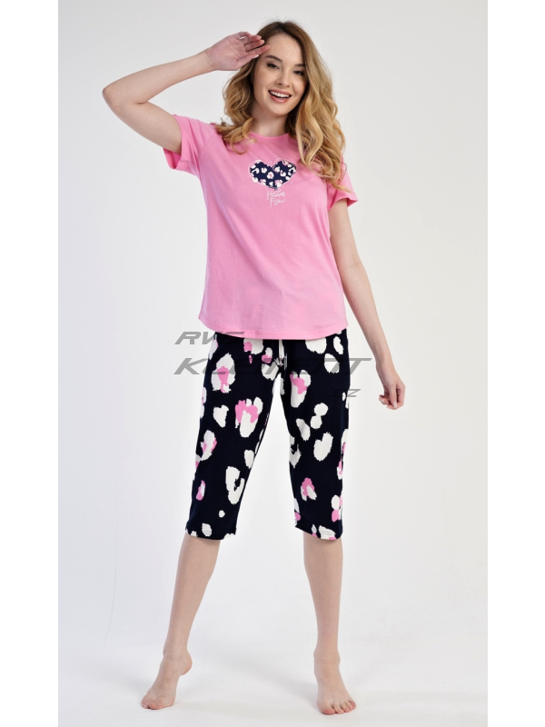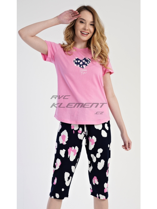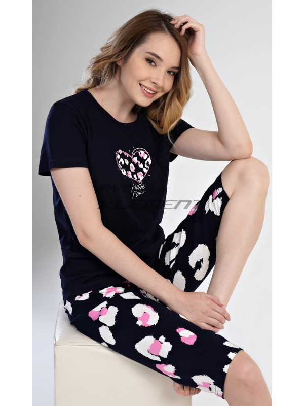 Dámské pyžamo kapri Jana. Dámské bavlněné kapri pyžamo Jana. Pyžamo se skládá z trička s krátkým rukávem a tříčtvrtečních kalhot. Tričko s kulatým výstřihem má na hrudi obrázek ve tvaru srdce. Kapri kalhoty mají v pase gumu a šňůrku na stáhnutí, nemají kapsy. Použitý materiál je příjemný a poddajný na dotek. Obsah bavlny u trička i u kalhot je 100%. Pokyny pro údržbu: - 100% bavlna Míry naměřené na výrobku:
