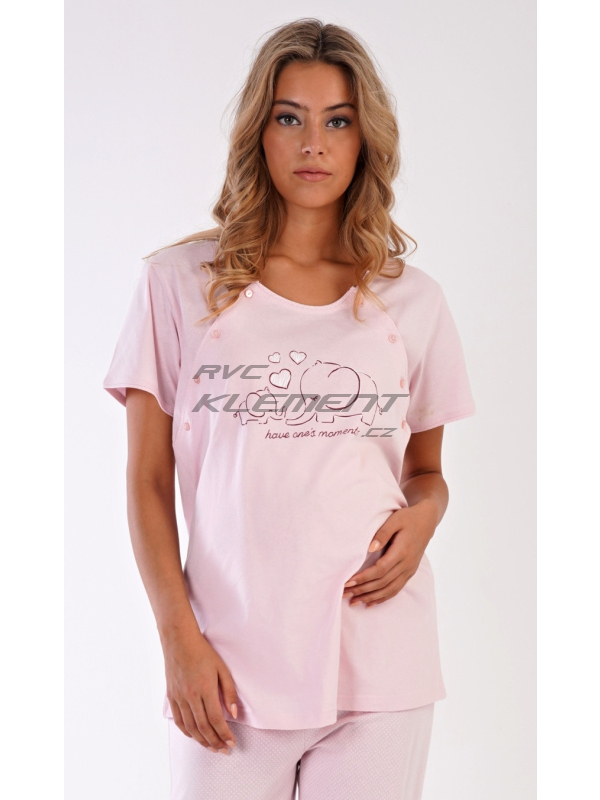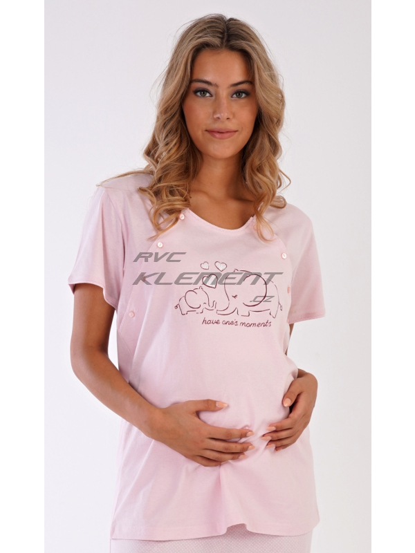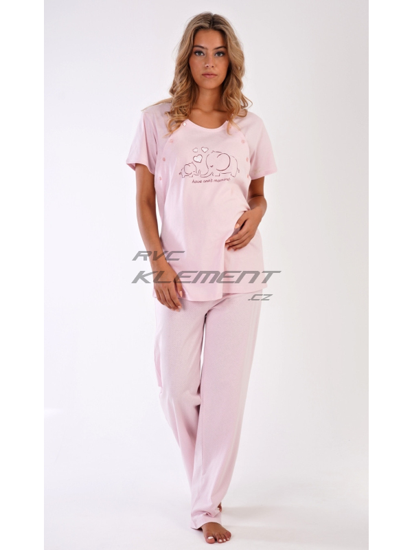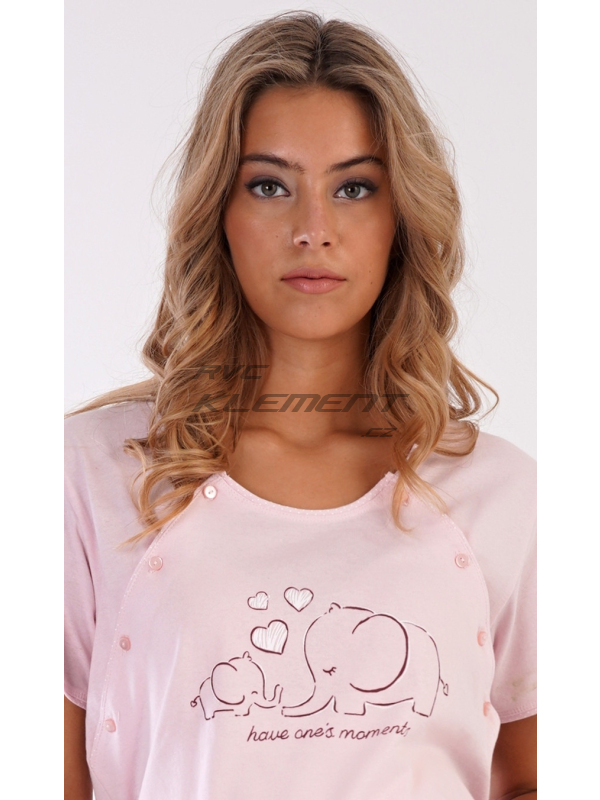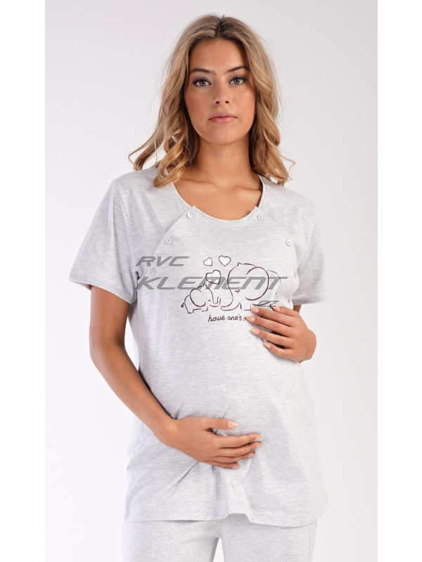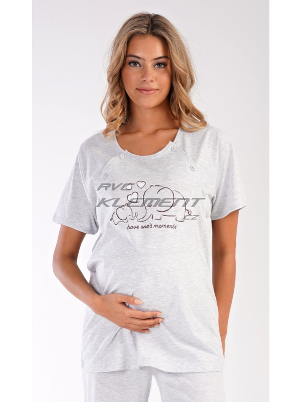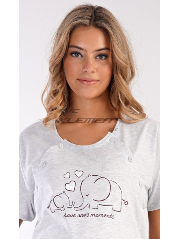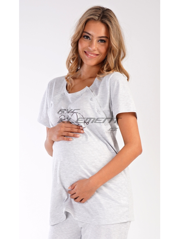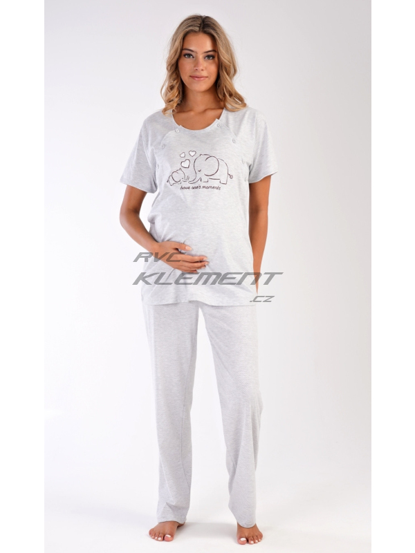 Dámské pyžamo mateřské Slůně. Dámské mateřské pyžamo Slůně. Pyžamo se skládá z trička s krátkým rukávem a dlouhých kalhot. Tričko je volněnjší, má kulatý výstřih a praktické průstřihy na kojení, které se zapínají na knoflíčky. Zdobí ho obrázek sloní maminky se slůnětem. Kalhoty jsou volnější v pase, mají gumu a šňůrku ke stažení a jsou potištěny jemnými puntíky. Toto pyžamko je vhodné do porodnice a po dobu kojení. U lososové barvy je podíl bavlny 100%, u šedé 70%. Materiál je příjemný a poddajný na dotek. Pokyny pro údržbu: -70% bavlna, 30% polyester Míry naměřené na výrobku: