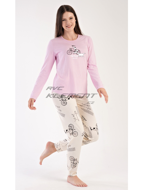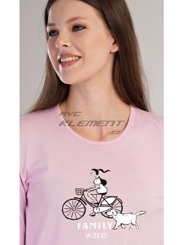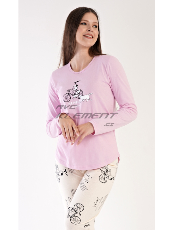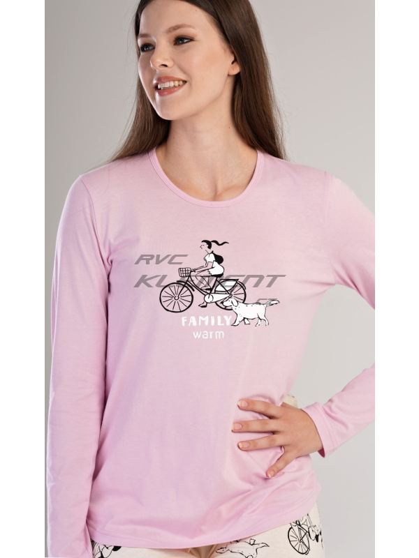 Dámské bavlněné pyžamo dlouhé Dívka na kole. Dámské bavlněné pyžamo dlouhé Dívka na kole. Dámské pyžamo se skládá z trika s dlouhým rukávem a dlouhých kalhot, které jsou zakončené patenty. Triko je jednobarevné, zdobené obrázkem dívky na kole a nápisem FAMILY WARM. Kalhoty jsou krémové, potištěné stejným motivem, mají v pase gumu a šňůrku na stažení. Použitý materiál je poddajný a příjemný na dotek. Kalhoty i triko je složeno ze 100% bavlnou. Pokyny pro údržbu: -100 % bavlna Míry naměřené na výrobku: