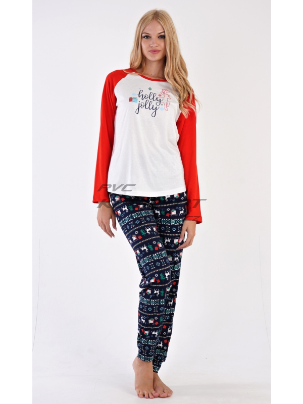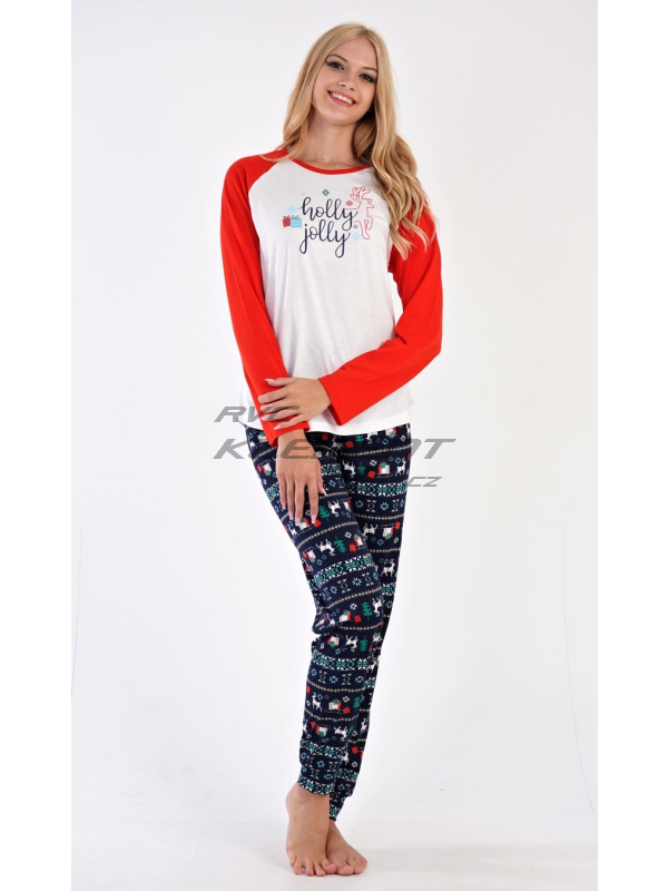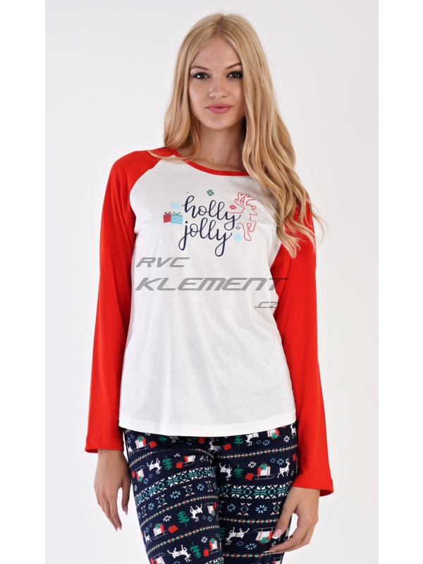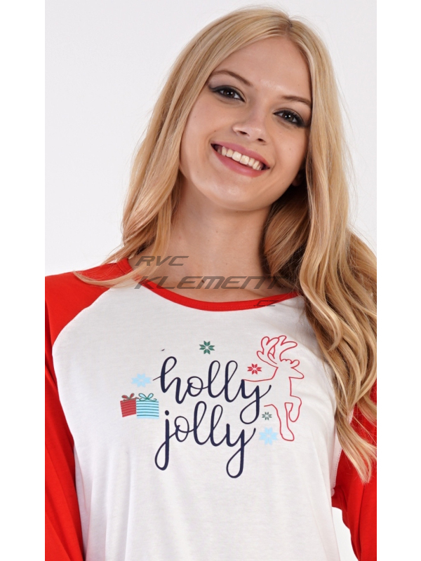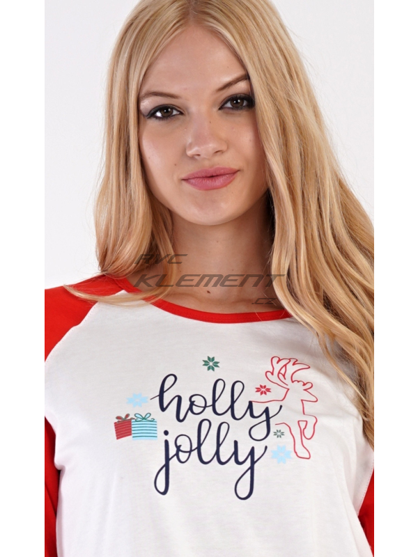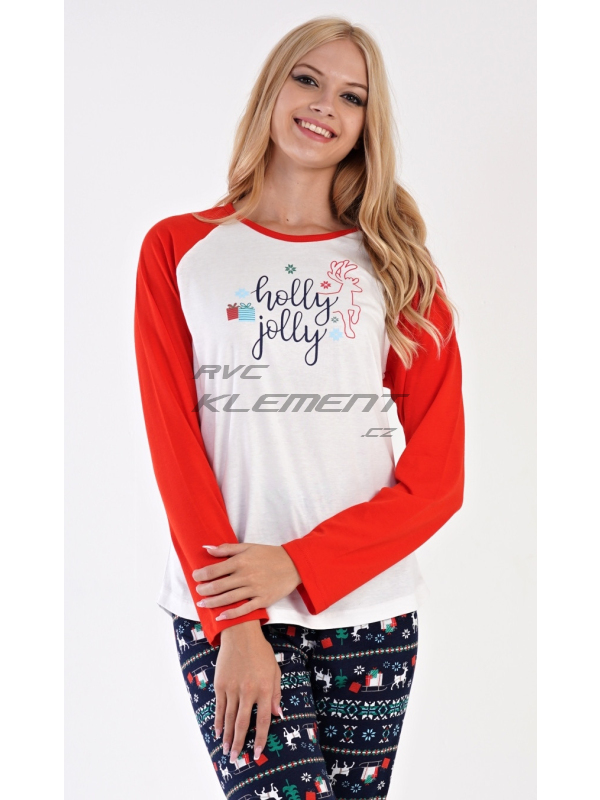 Dámské bavlněné pyžamo dlouhé Vánoční dárek. Dámské bavlněné pyžamo dlouhé Vánoční dárek. Dámské pyžamo se skládá z trika s dlouhým rukávem a dlouhých kalhot. Triko je ozdobené nápisem HOLLY JOLLY a obrázky vánočních dárků. Kalhoty jsou potištěné vánočními motivy. Kalhoty mají v pase gumu, šňůrku na stažení a jsou zakončené lemy. Použitý materiál je poddajný a jemný na dotek. Kalhoty i triko je složeno ze 100% bavlnou. Pokyny pro údržbu: -100% bavlna Míry naměřené na výrobku: