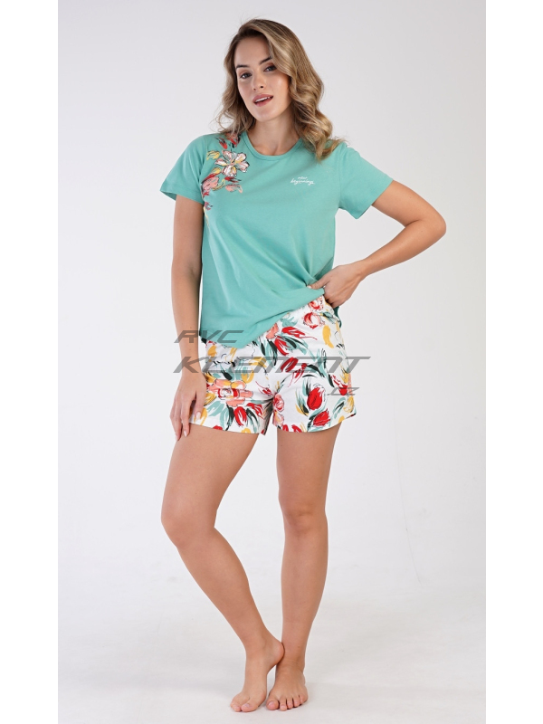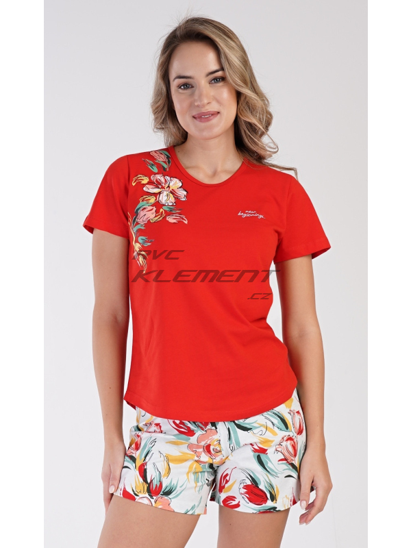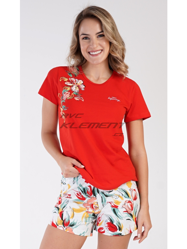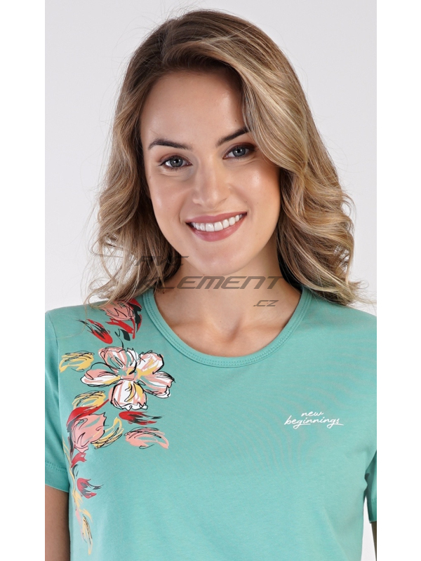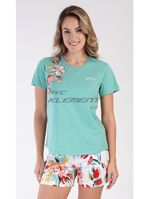 Dámské pyžamo šortky Sofie. Dámské bavlněné pyžamo šortky Sofie. Dámské pyžamo se skládá z trička s krátkým rukávem a šortkových kalhot. Na jednobarevném tričku je obrázek pestrých květů a nápis ’New beginnings’. Motiv květů se opakuje i na barevných šortkách. Šortky mají v pase gumu a šňůrku na stáhnutí, jsou bez kapes. Použitý bavlněný materiál je příjemný a poddajný na dotek. Pokyny pro údržbu: - 100% bavlna Míry naměřené na výrobku: