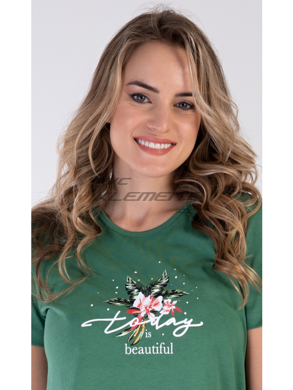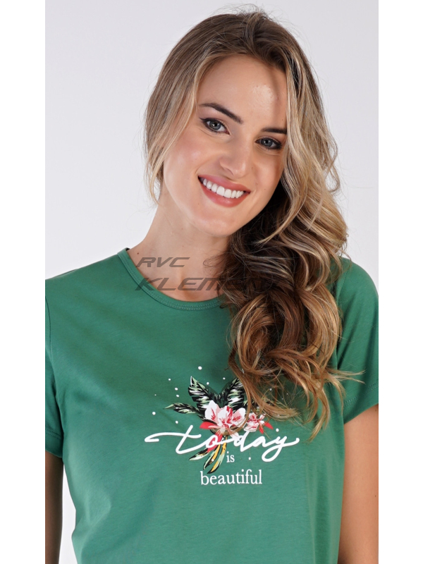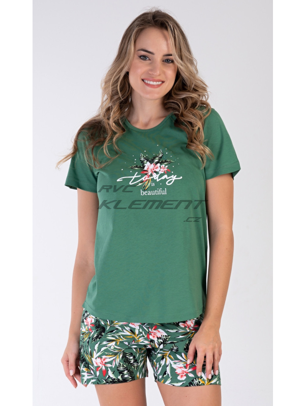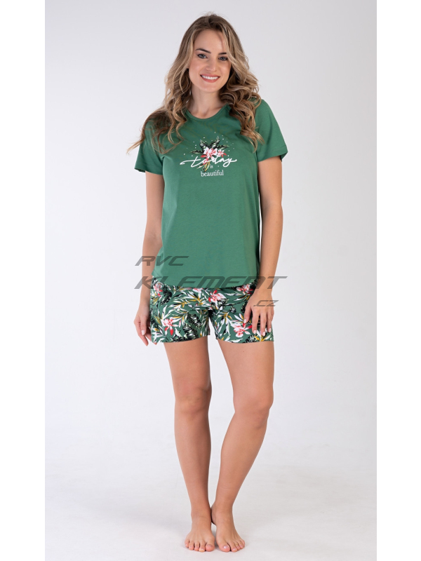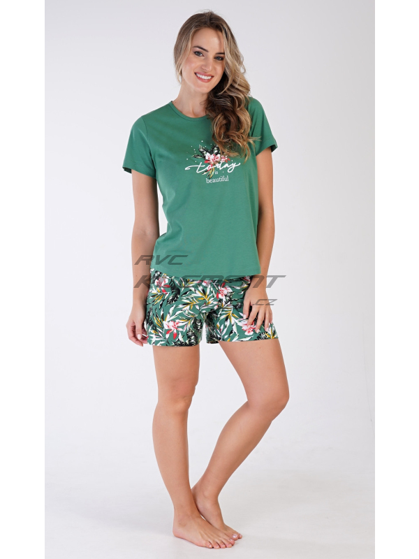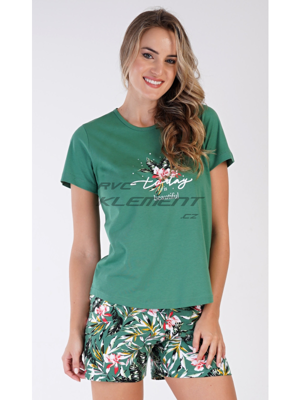Dámské pyžamo šortky Beautiful. Dámské bavlněné pyžamo šortky Beautiful. Dámské pyžamo se skládá z trička s krátkým rukávem a šortkových kalhot. Na jednobarevném tričku je obrázek pestrých květů a nápis ’Today is beautiful’. Motiv květů se opakuje i na barevných šortkách. Šortky mají v pase gumu a šňůrku na stáhnutí, jsou bez kapes. Použitý bavlněný materiál je příjemný a poddajný na dotek. Pokyny pro údržbu: - 100% bavlna Míry naměřené na výrobku: