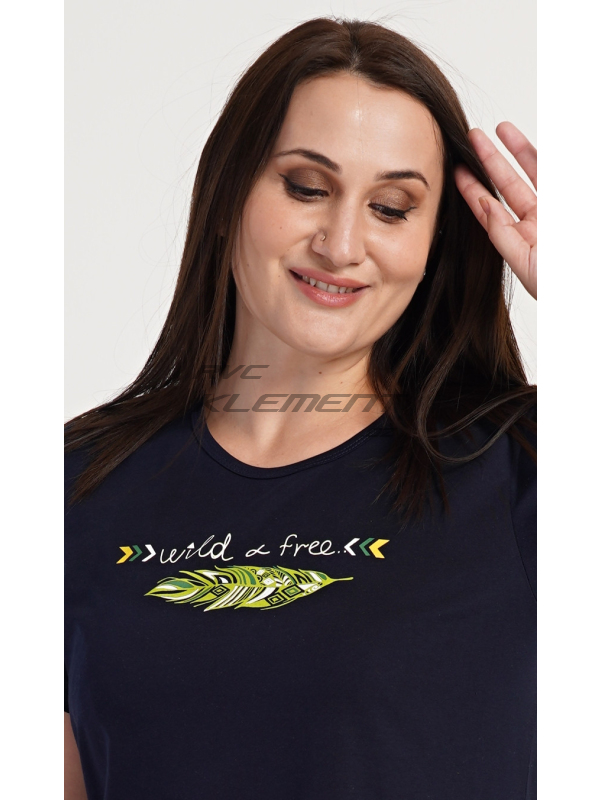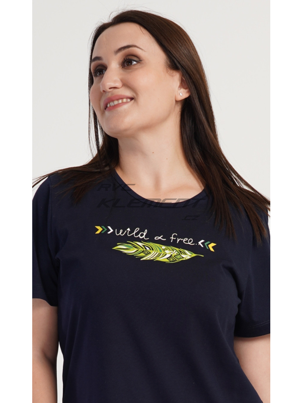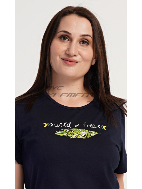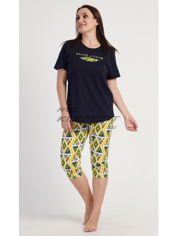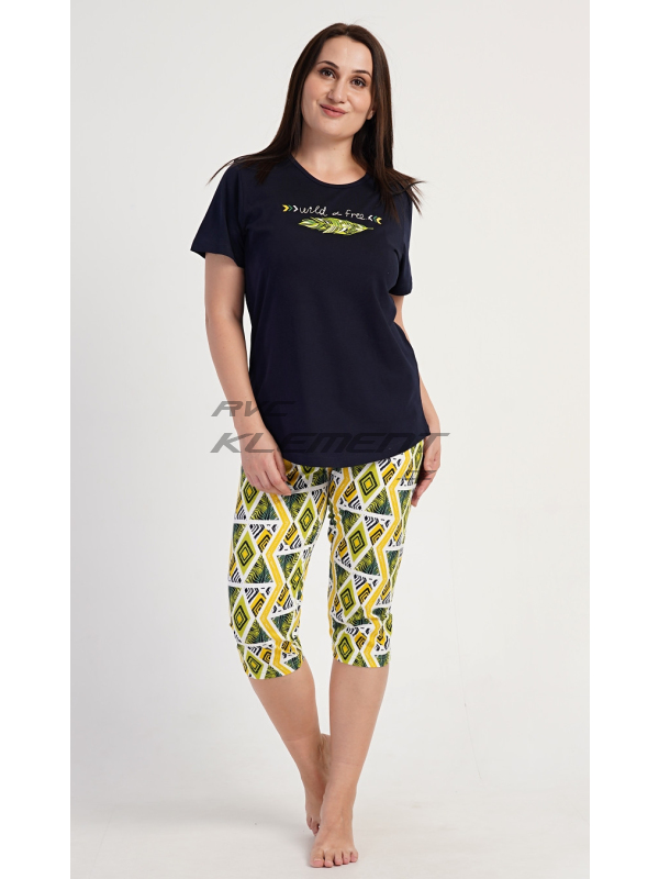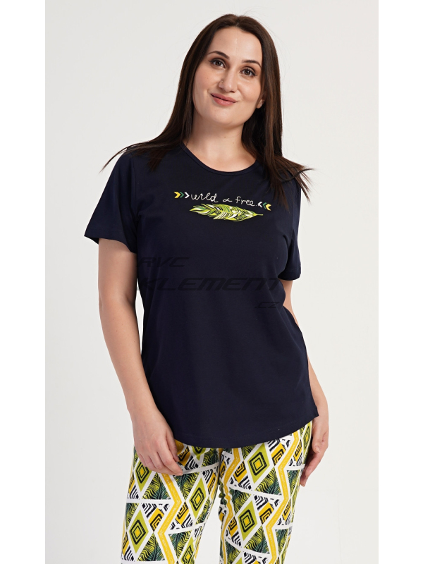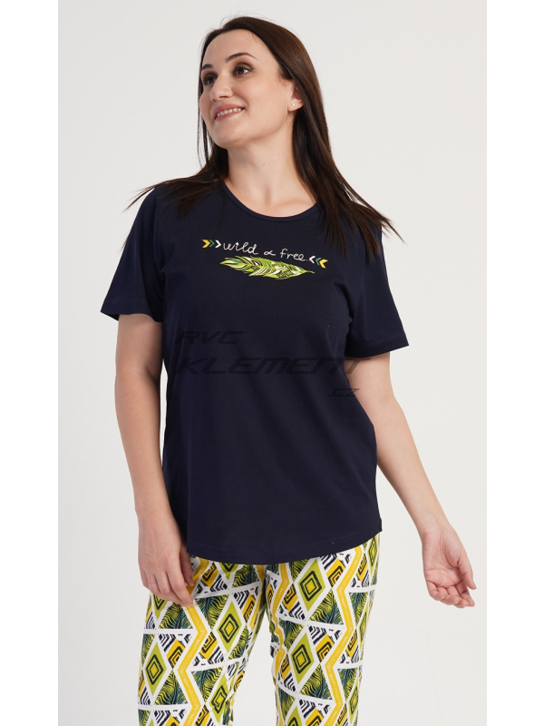Dámské pyžamo kapri Zuzka. Dámské bavlněné kapri pyžamo Zuzka. Kapri pyžamo se skládá z trička s krátkým rukávem a tříčtvrtečních kalhot. Tričko s kulatým výstřihem má na hrudi obrázek peříčka a nápis ’Wild and free’, kalhoty jsou potištěny pestrým vzorem v brazilském stylu. Kapri kalhoty mají v pase gumu a šňůrku na stáhnutí, nemají kapsy. Použitý materiál je příjemný a poddajný na dotek. Obsah bavlny u trička i u kalhot je 100%. Pokyny pro údržbu: - 100% bavlna Míry naměřené na výrobku: