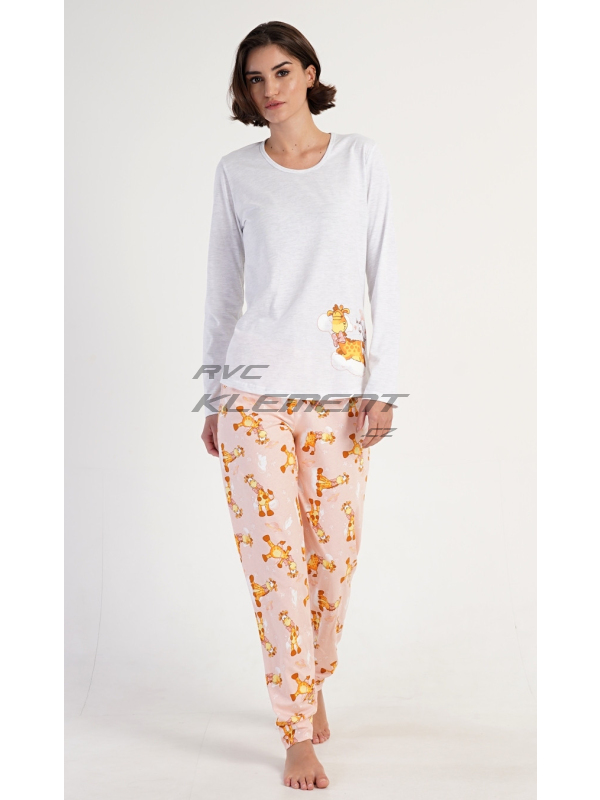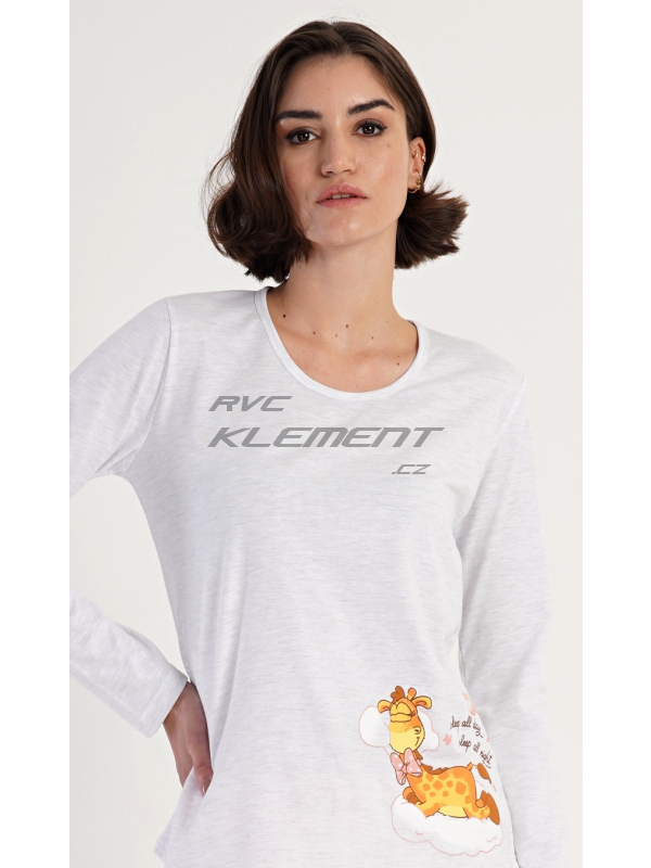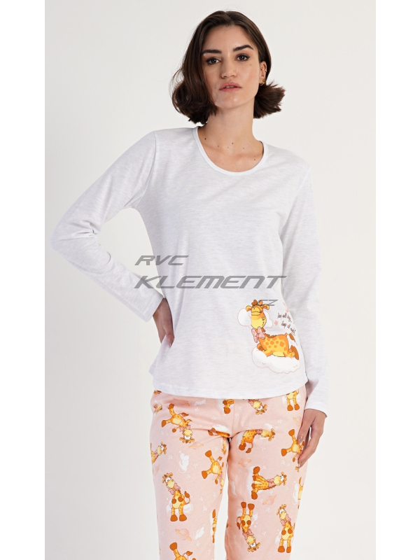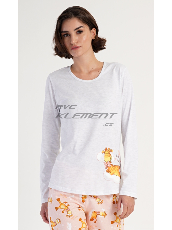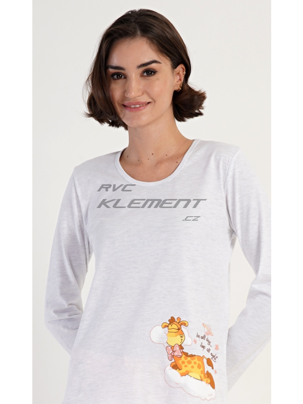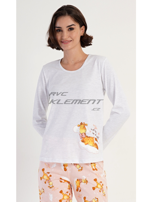 Dámské pyžamo dlouhé Žirafa. Dámské pyžamo dlouhé Žirafa. Dámské pyžamo se skládá z trika s dlouhým rukávem a dlouhých kalhot. Triko je jednobarevné, zdobené drobným nápisem a obrázkem spící žirafky. Stejný motiv se opakuje i na kalhotách, které mají v pase gumu a šňůrku na stažení, nemají kapsy. Světle šedé triko je složeno ze 70-ti % bavlnou, kalhoty jsou čistě bavlněné. Použitý materiál je poddajný a příjemný na dotek.