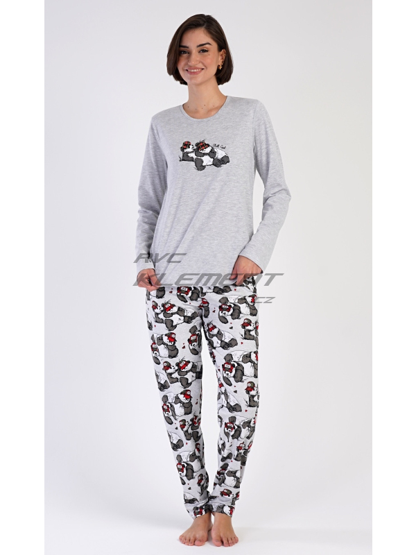 Dámské pyžamo dlouhé Enjoy. Dámské pyžamo dlouhé Enjoy. Dámské pyžamo se skládá z trika s dlouhým rukávem a dlouhých kalhot. Triko je jednobarevné, zdobené na hrudi drobným nápisem a obrázkem spících medvídků. Stejný motiv se opakuje i na kalhotách, které mají v pase gumu a šňůrku na stažení, nemají kapsy. Použitý materiál s obsahem bavlny 70% je poddajný a příjemný na dotek. | ||||||