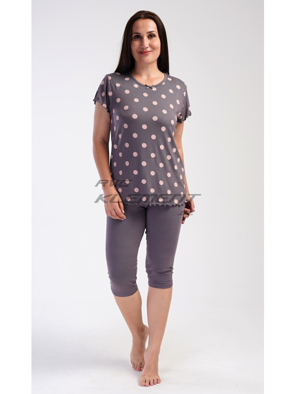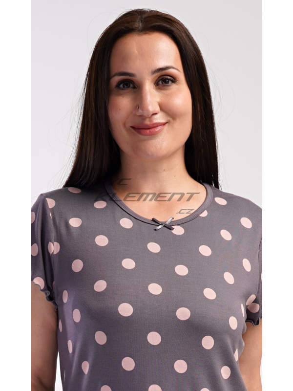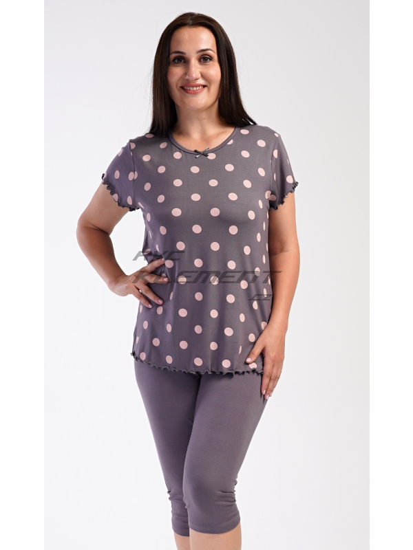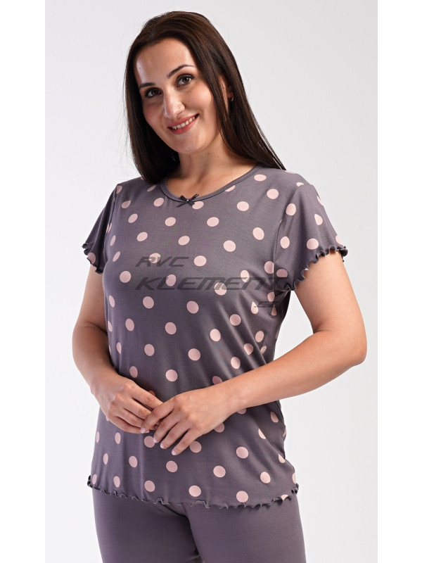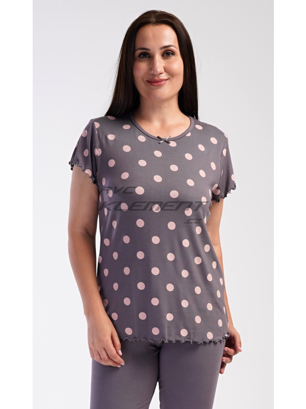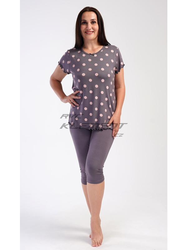 Dámské pyžamo kapri Puntík. Dámské kapri pyžamo Puntík. Dámské pyžamo se skládá z trička s krátkým rukávem a tříčtvrtečních kalhot. Jednobarevné tričko s kulatým výstřihem je zdobeno puntíky a ozdobným žlábkováním u rukávů a na spodním lemu. Tříčtvrteční elastické kalhoty mají v pase gumu. Použitý viskózový materiál s příměsí lycry je příjemný a poddajný na dotek. Pokyny pro údržbu: - 95% viskoza, 5% lycra - lze prát v pračce při teplotě do 30° Míry naměřené na výrobku: