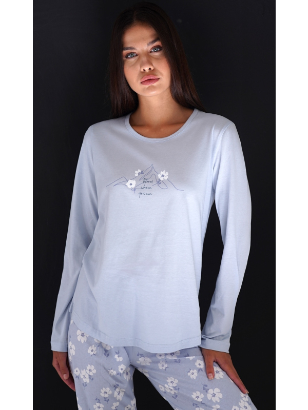 Dámské dlouhé pyžamo Nature. Dámské bavlněné dlouhé pyžamo Nature. Dámské pyžamo se skládá z trika s dlouhým rukávem a dlouhých kalhot. Triko je jednobarevné, zdobené obrázkem s květinovým motivem. Květinový potisk se opakuje i na kalhotách, které mají v pase gumu a šňůrku na stažení, nemají kapsy. Použitý bavlněný materiál je poddajný a příjemný na dotek. Pokyny pro údržbu: - 100% bavlna Míry naměřené na výrobku: