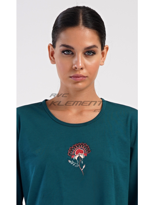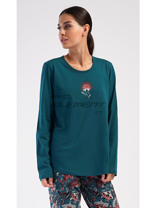 Dámské bavlněné dlouhé pyžamo Jasmína. Dámské pyžamo se skládá z trika s dlouhým rukávem a dlouhých kalhot. Triko je jednobarevné, zdobené obrázkem orientálního květu. Tento motiv se opakuje i na kalhotách, které mají v pase gumu a šňůrku na stažení, nemají kapsy. Použitý bavlněný materiál je poddajný a příjemný na dotek.