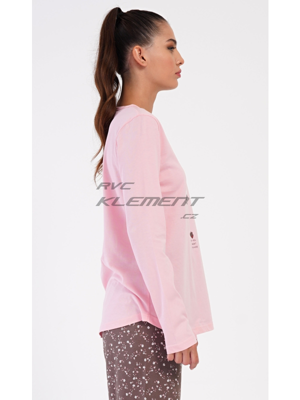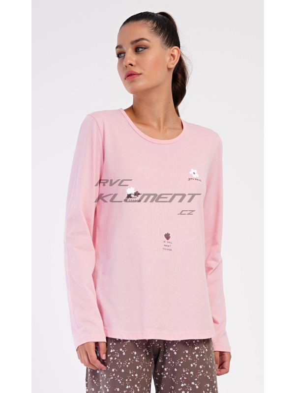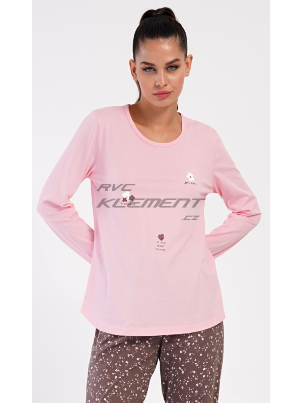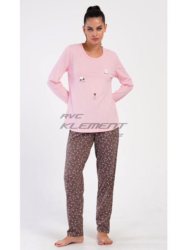 Dámské dlouhé pyžamo Flowers. Dámské bavlněné dlouhé pyžamo Flowers. Dámské pyžamo se skládá z trika s dlouhým rukávem a dlouhých kalhot. Triko je jednobarevné, zdobené obrázky květin. Květinový potisk se opakuje i na kalhotách, které mají v pase gumu a šňůrku na stažení, nemají kapsy. Použitý bavlněný materiál je poddajný a příjemný na dotek. Pokyny pro údržbu: - 100% bavlna Míry naměřené na výrobku: