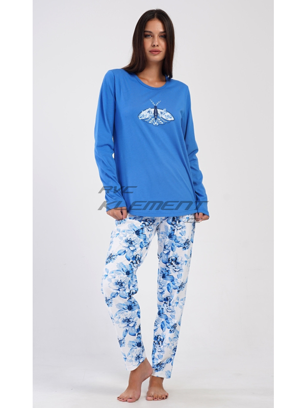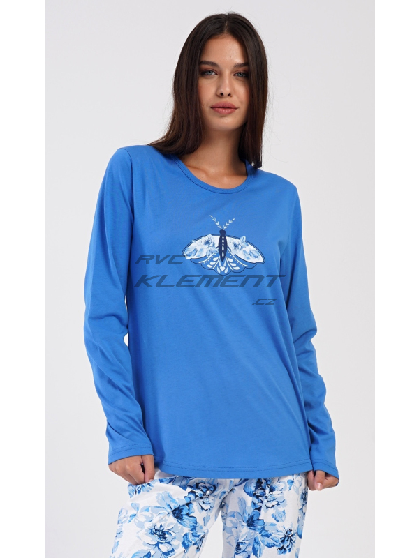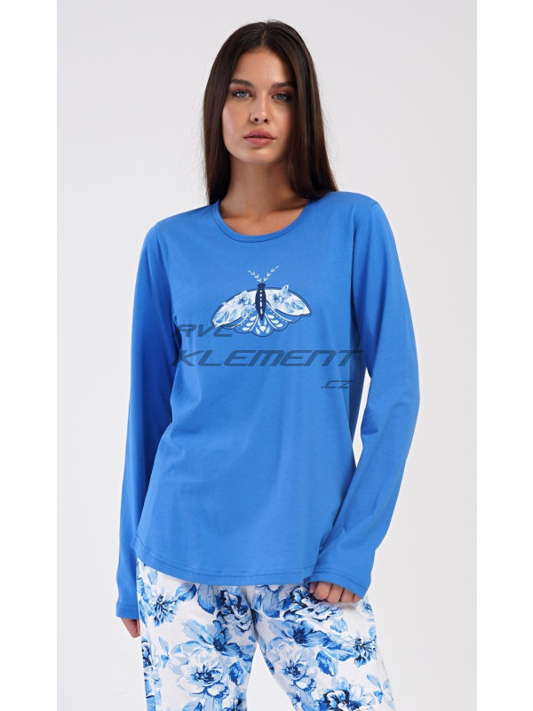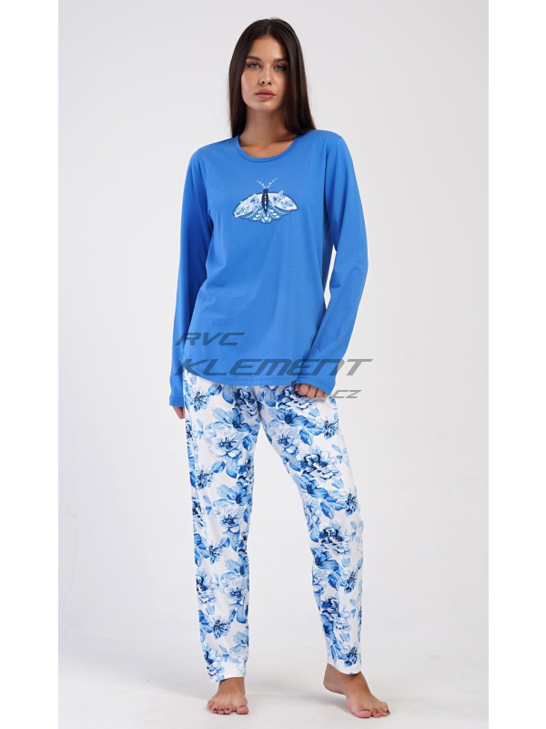 Dámské dlouhé bavlněné pyžamo Dominika. Dámské pyžamo se skládá z trika s dlouhým rukávem a dlouhých kalhot. Triko je jednobarevné, zdobené obrázkem motýla a květů. Květinový potisk se opakuje i na kalhotách, které mají v pase gumu a šňůrku na stažení, nemají kapsy. Použitý bavlněný materiál je poddajný a příjemný na dotek.