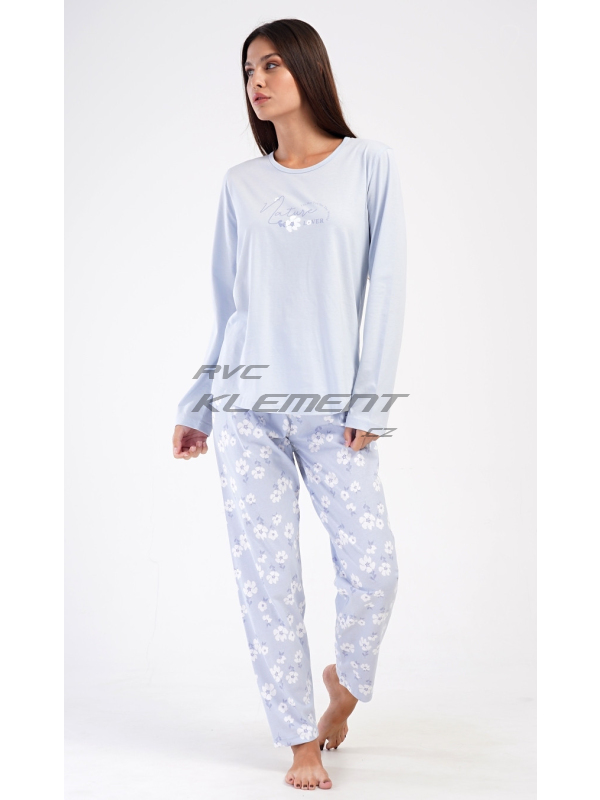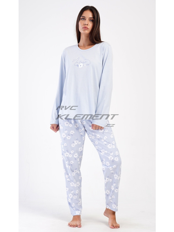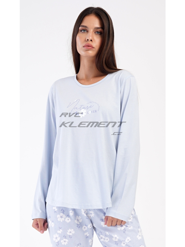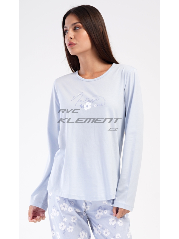 Dámské pyžamo dlouhé Nature lover. Dámské bavlněné dlouhé pyžamo Nature lover. Dámské pyžamo se skládá z trika s dlouhým rukávem a dlouhých kalhot. Triko je jednobarevné, zdobené obrázkem s květinovým motivem. Květinový potisk se opakuje i na kalhotách, které mají v pase gumu a šňůrku na stažení, nemají kapsy. Použitý bavlněný materiál je poddajný a příjemný na dotek. Pokyny pro údržbu: - 100% bavlna Míry naměřené na výrobku
