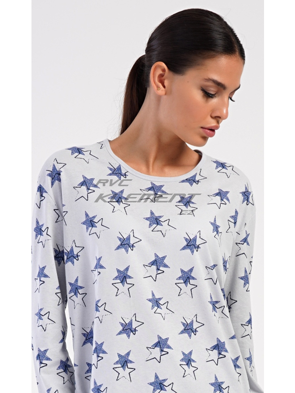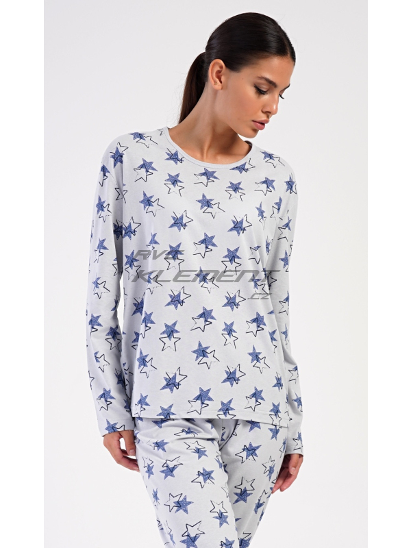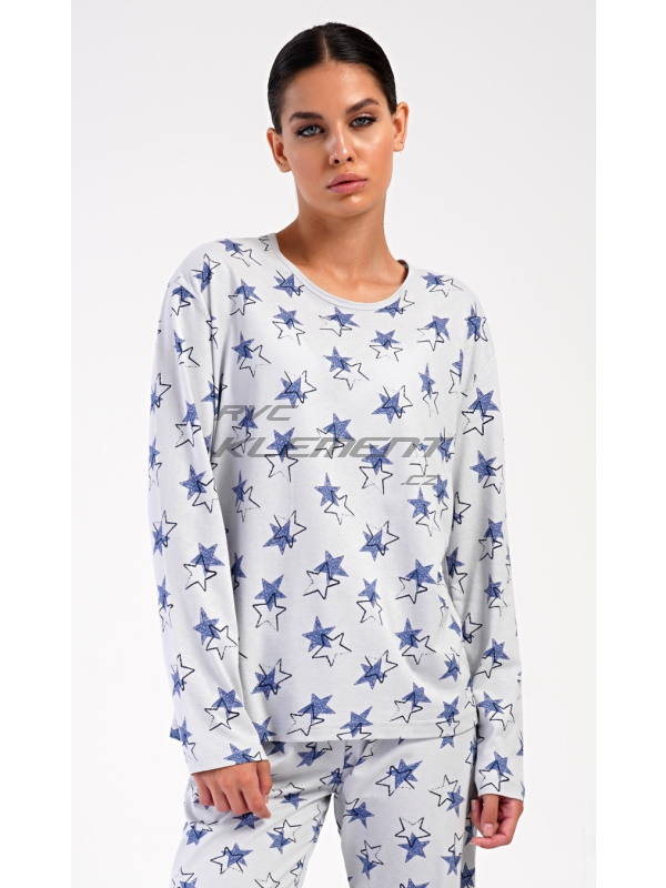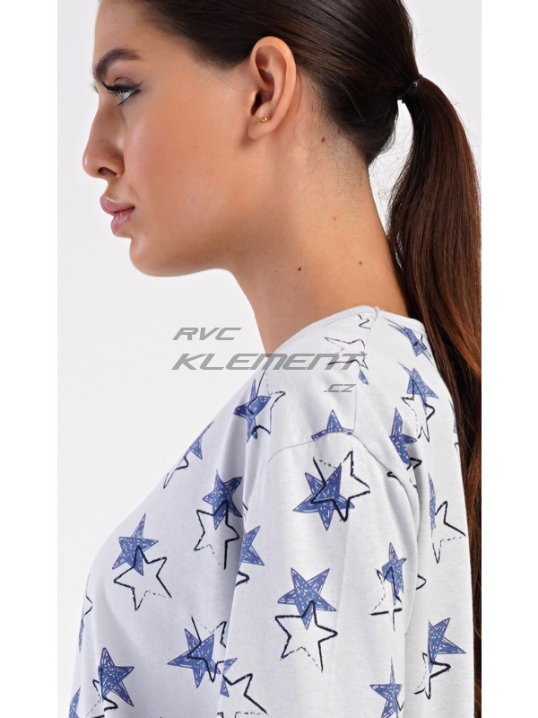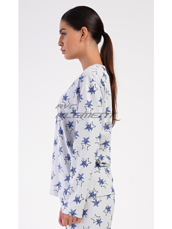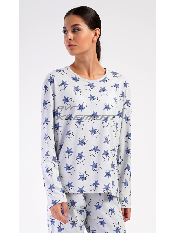 Dámské dlouhé pyžamo Stars. Dámské bavlněné dlouhé pyžamo Stars. Dámské pyžamo se skládá z trika s dlouhým rukávem a dlouhých kalhot. Triko je jednobarevné, potištěné hvězdami. Tento motiv se opakuje i na kalhotách, které mají v pase gumu a šňůrku na stažení, nemají kapsy. Použitý bavlněný materiál je poddajný a příjemný na dotek. Pokyny pro údržbu: - 100% bavlna Míry naměřené na výrobku: