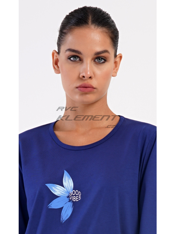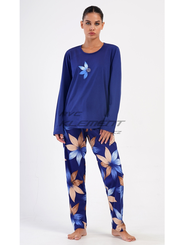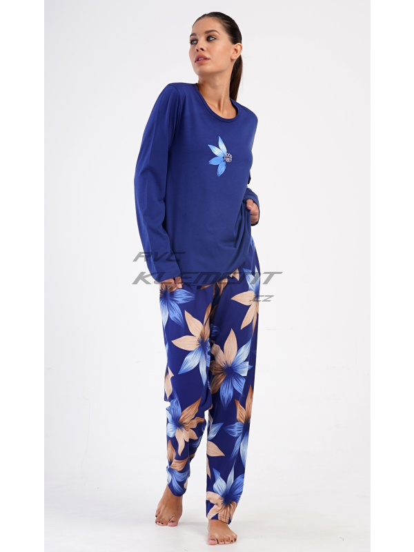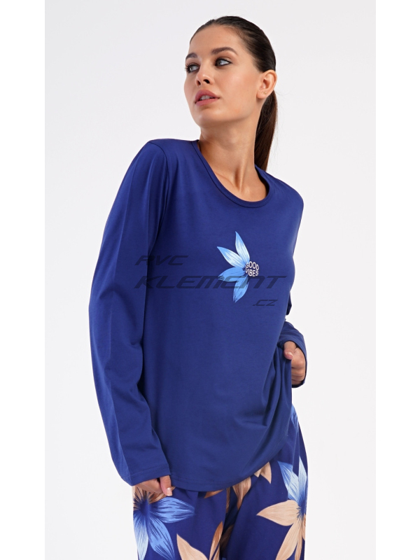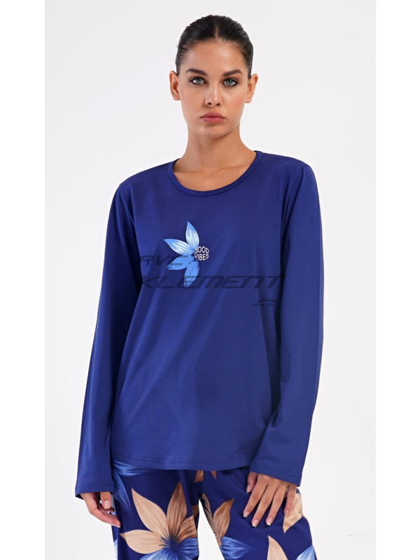 Dámské dlouhé pyžamo Sára. Dámské bavlněné dlouhé pyžamo Sára. Dámské pyžamo se skládá z trika s dlouhým rukávem a dlouhých kalhot. Triko je jednobarevné, zdobené obrázkem květu a drobným nápisem ’Good vibes’. Květinový potisk se opakuje i na kalhotách, které mají v pase gumu a šňůrku na stažení, nemají kapsy. Použitý bavlněný materiál je poddajný a příjemný na dotek. Pokyny pro údržbu: - 100% bavlna Míry naměřené na výrobku: