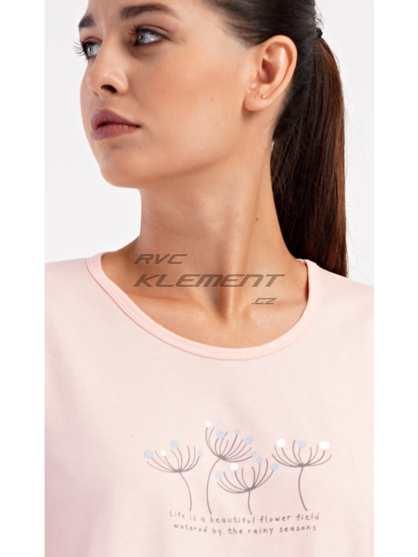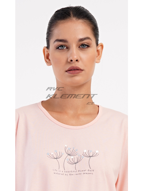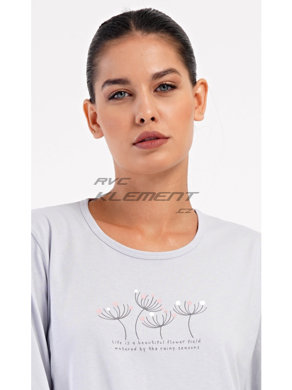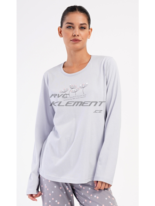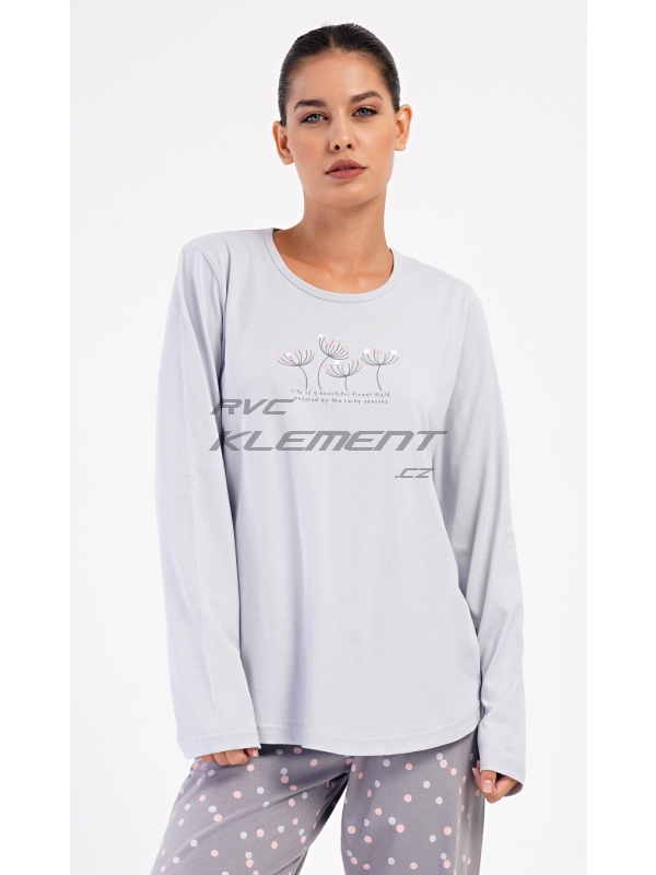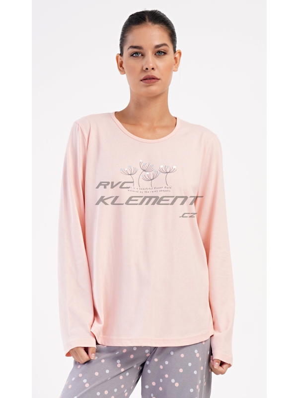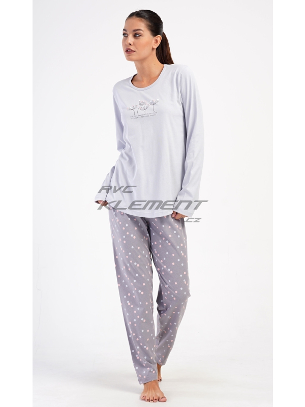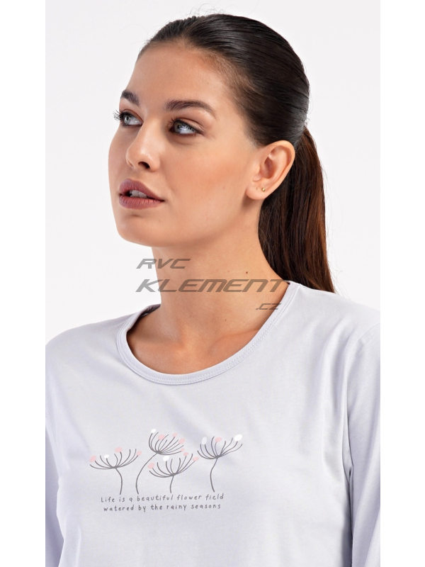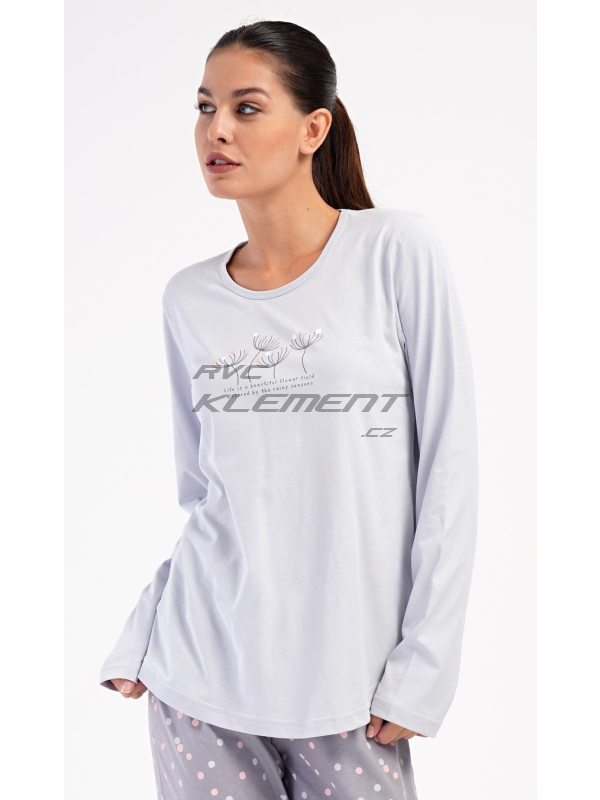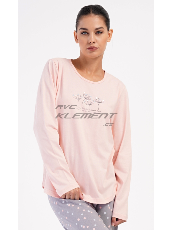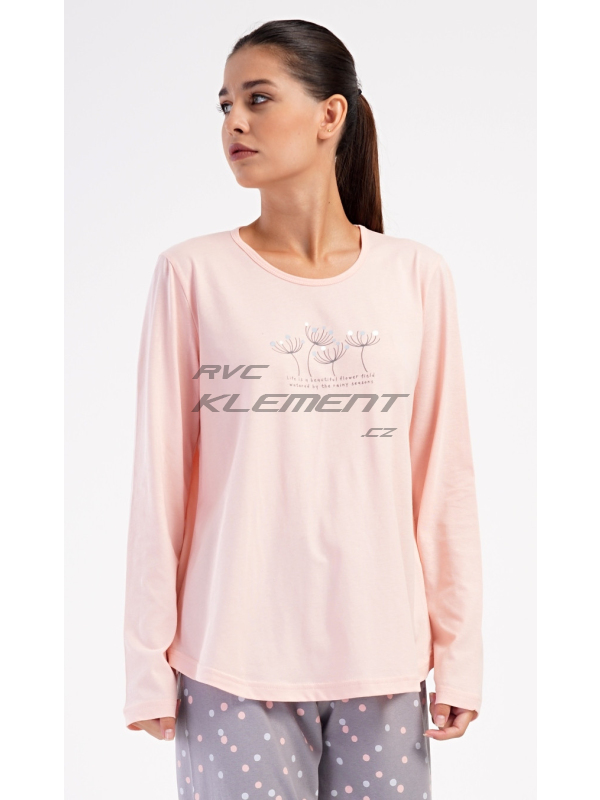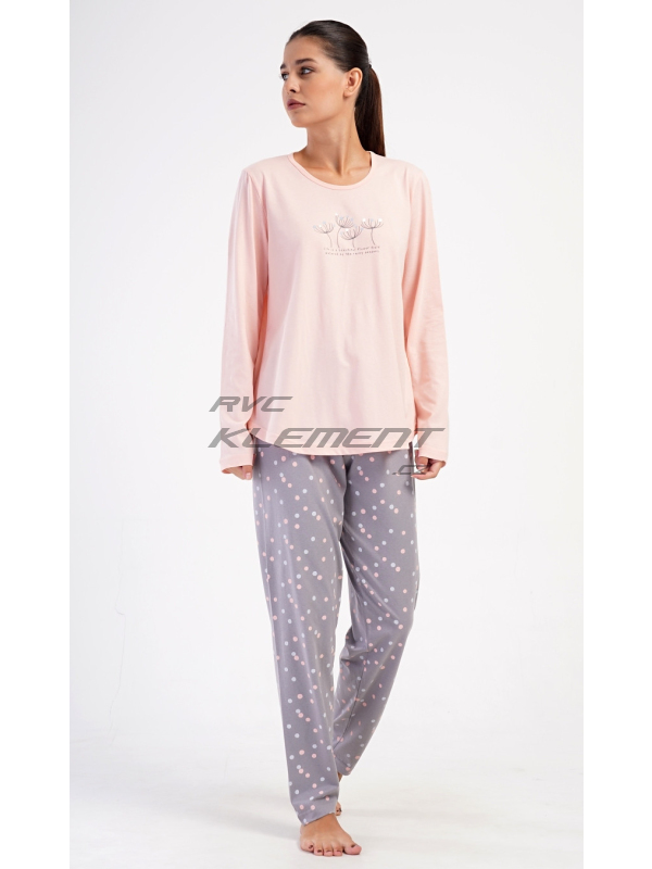 Dámské dlouhé pyžamo Petra. Dámské bavlněné dlouhé pyžamo Petra. Dámské pyžamo se skládá z trika s dlouhým rukávem a dlouhých kalhot. Triko je jednobarevné, zdobené obrázkem pampelišek a drobným nápisem. Kalhoty mají v pase gumu a šňůrku na stažení, nemají kapsy. Použitý bavlněný materiál je poddajný a příjemný na dotek. Pokyny pro údržbu: - 100% bavlna Míry naměřené na výrobku: