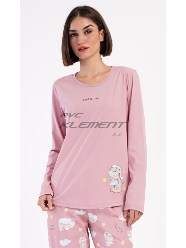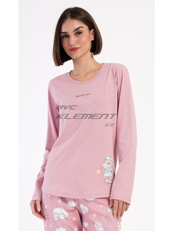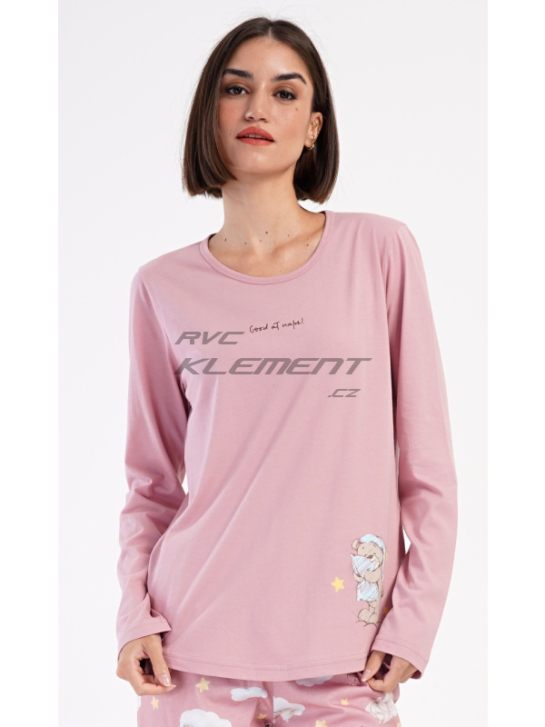 Dámské bavlněné dlouhé pyžamo Méďa s polštářem. Dámské pyžamo se skládá z trika s dlouhým rukávem a dlouhých kalhot. Triko je jednobarevné, zdobené obrázkem medvídka s polštářem. Obrázky medvídků se opakují i na kalhotách, které mají v pase gumu a šňůrku na stažení, nemají kapsy. Použitý bavlněný materiál je poddajný a příjemný na dotek.