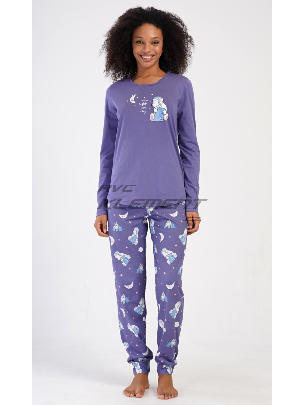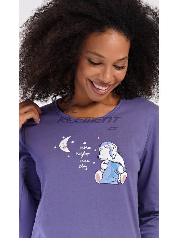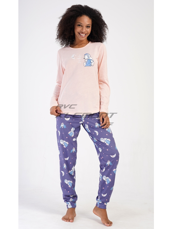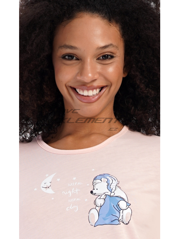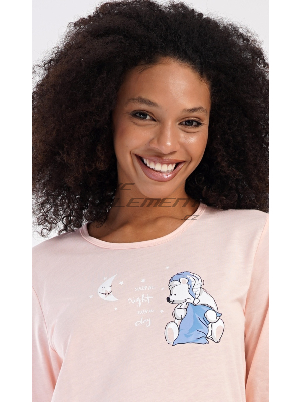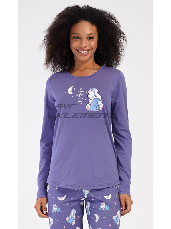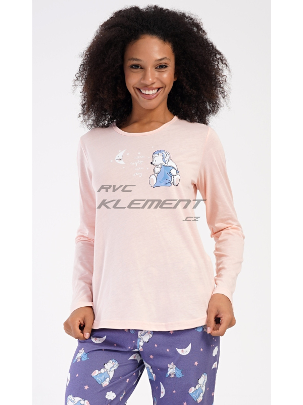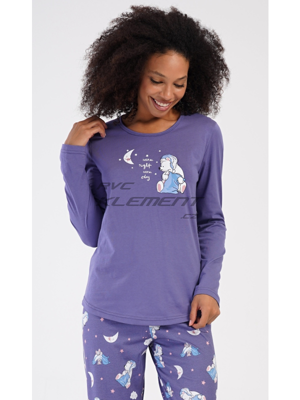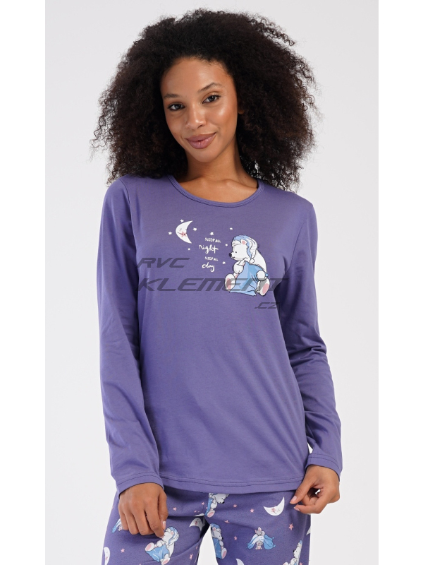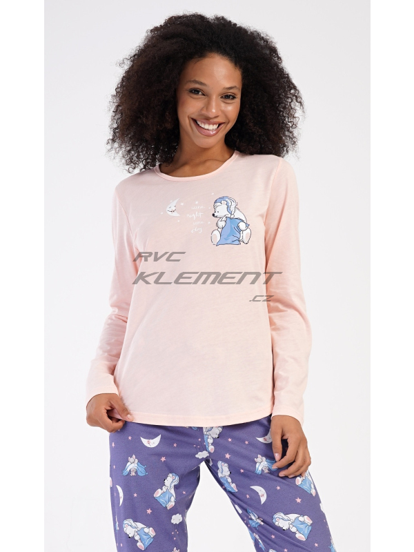 Dámské dlouhé pyžamo Good night. Dámské bavlněné dlouhé pyžamo Good night. Dámské pyžamo se skládá z trika s dlouhým rukávem a dlouhých kalhot. Triko je jednobarevné, zdobené obrázkem medvídka s polštářem. Obrázky medvídků se opakují i na kalhotách, které mají v pase gumu a šňůrku na stažení, nemají kapsy. Použitý bavlněný materiál je poddajný a příjemný na dotek. Pokyny pro údržbu: - 100% bavlna Míry naměřené na výrobku: