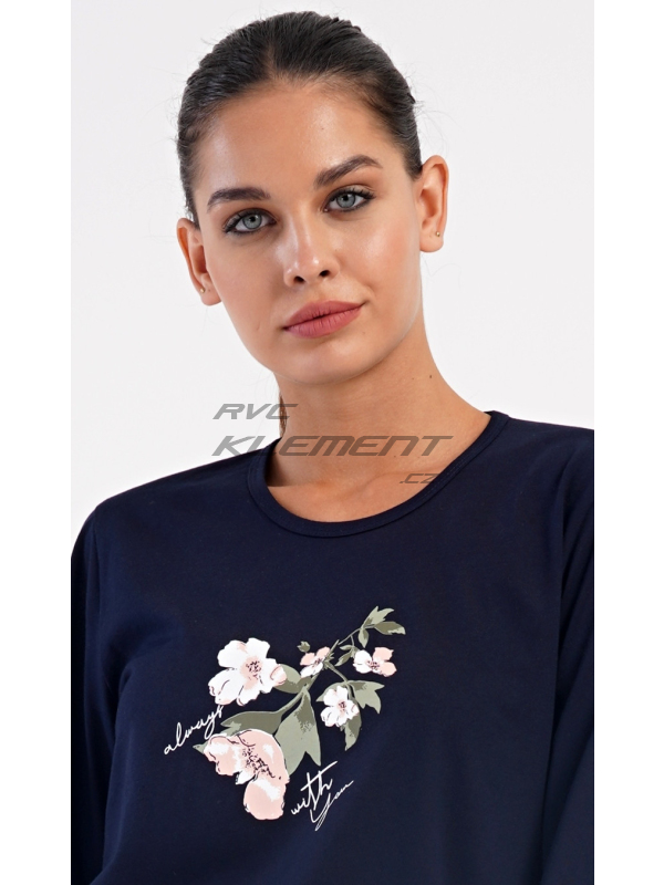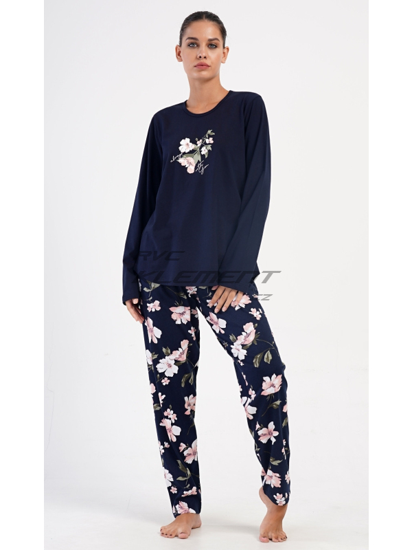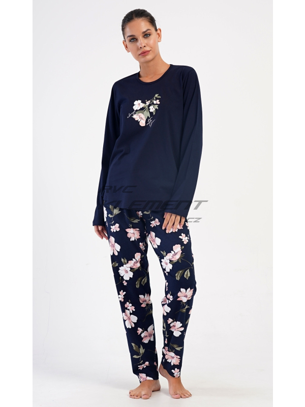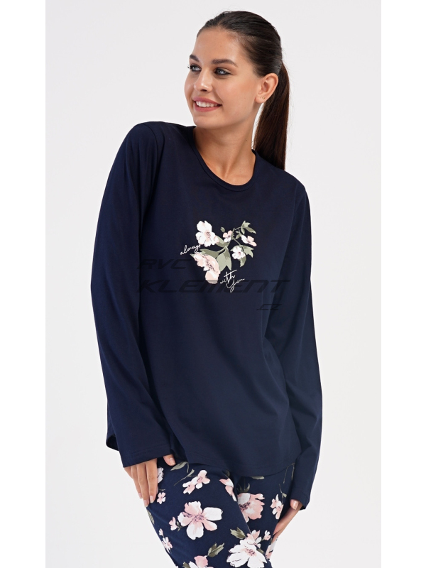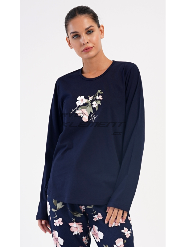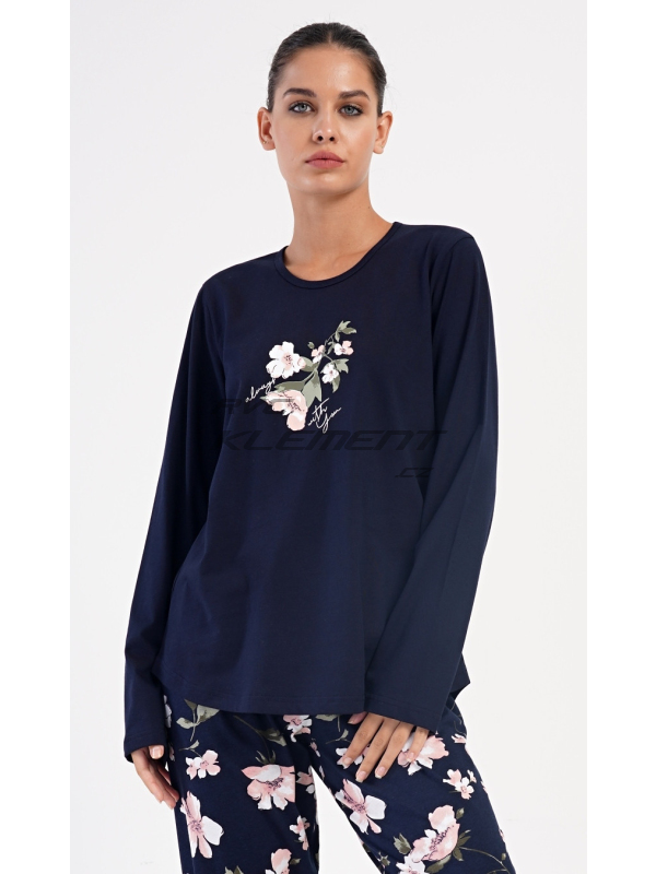 Dámské bavlněné dlouhé pyžamo Alice. Dámské bavlněné dlouhé pyžamo Alice. Dámské pyžamo se skládá z trika s dlouhým rukávem a dlouhých kalhot. Triko je jednobarevné, zdobené obrázkem květu a drobným nápisem. Květinový potisk se opakuje i na kalhotách, které mají v pase gumu a šňůrku na stažení, nemají kapsy. Použitý bavlněný materiál je poddajný a příjemný na dotek. Pokyny pro údržbu: - 100% bavlna Míry naměřené na výrobku: