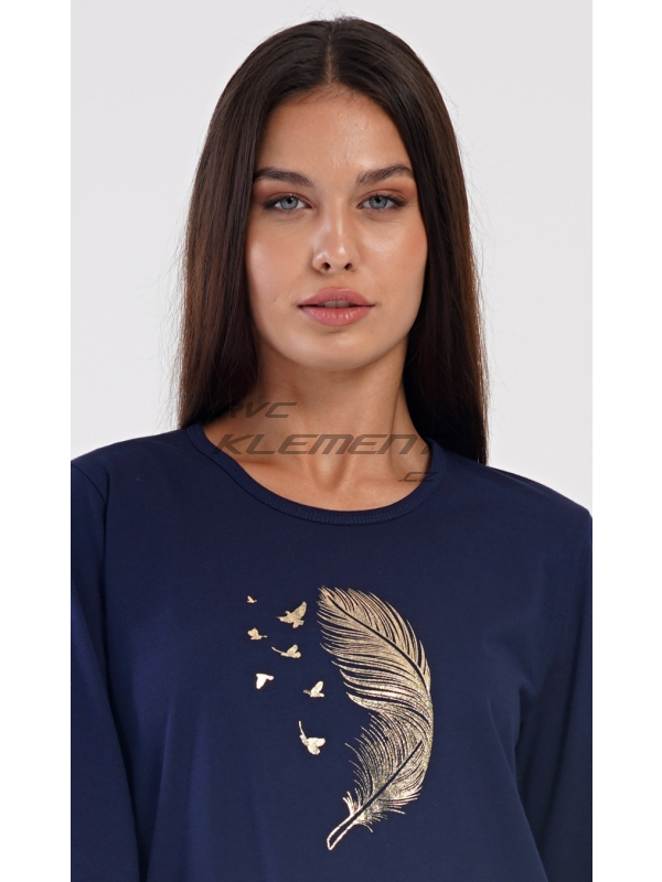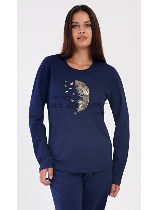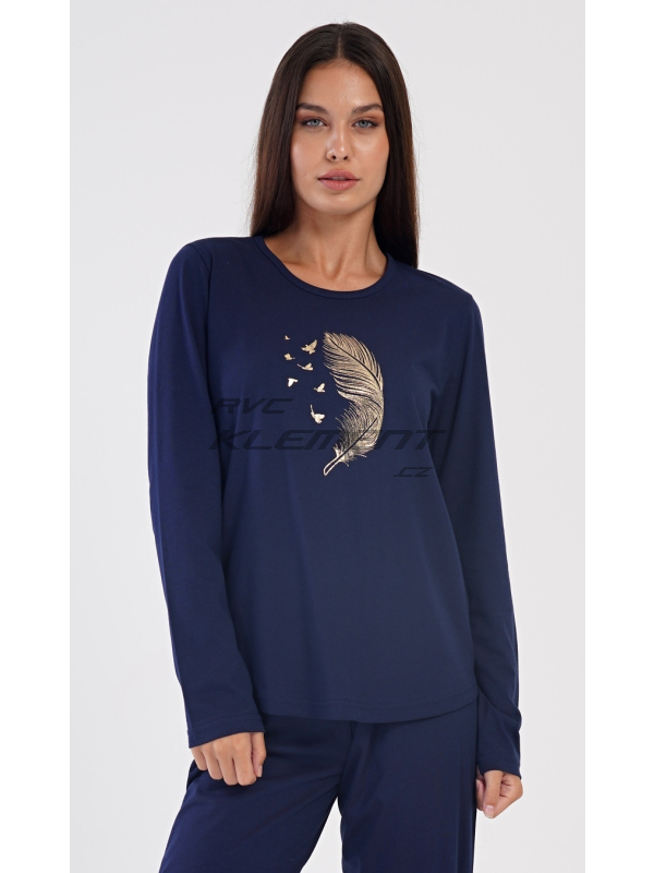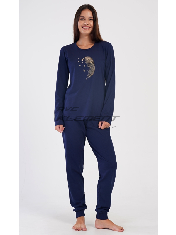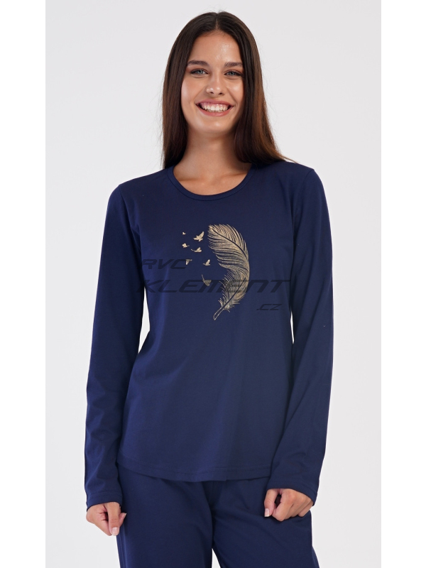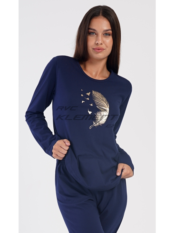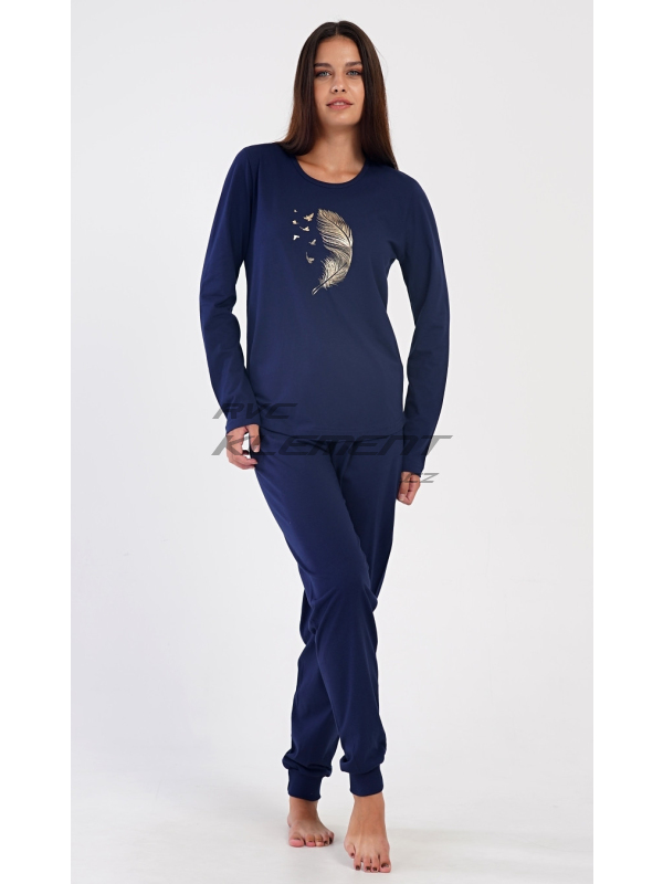 Dámské dlouhé pyžamo Peří. Dámské bavlněné dlouhé pyžamo Peří. Dámské pyžamo se skládá z trika s dlouhým rukávem a dlouhých kalhot. Triko je jednobarevné, zdobené obrázkem pírka ve zlaté barvě. Pyžamové dlouhé kalhoty mají v pase gumu a šňůrku na stažení, nemají kapsy. Nohavice jsou zakončeny patenty. Použitý bavlněný materiál je poddajný a příjemný na dotek. Pokyny pro údržbu: - 100% bavlna Míry naměřené na výrobku: