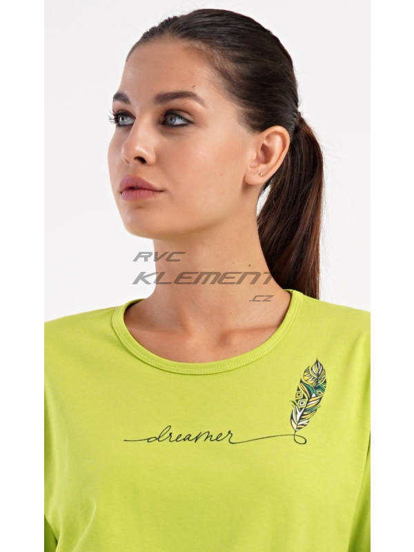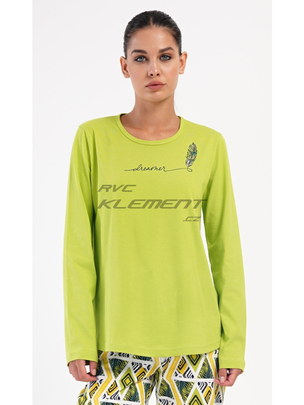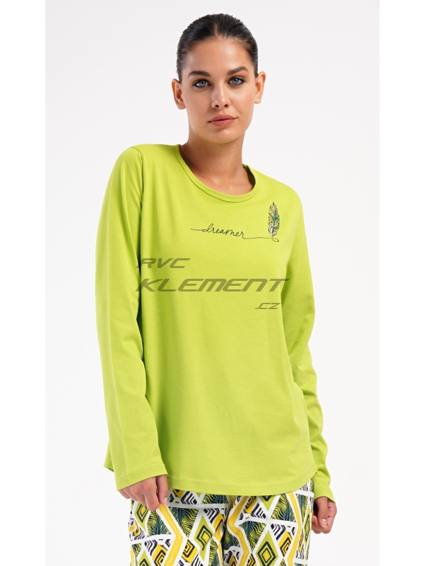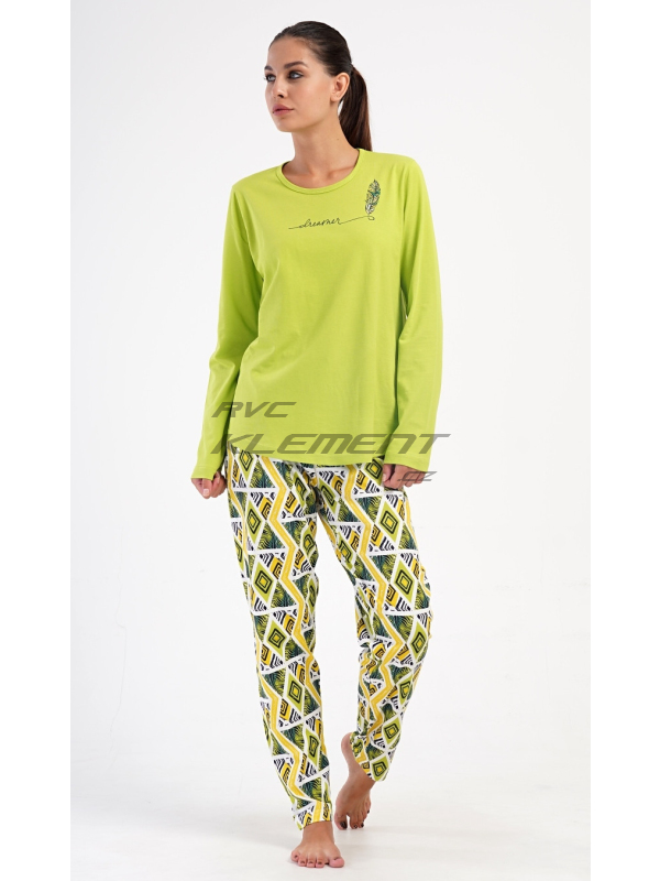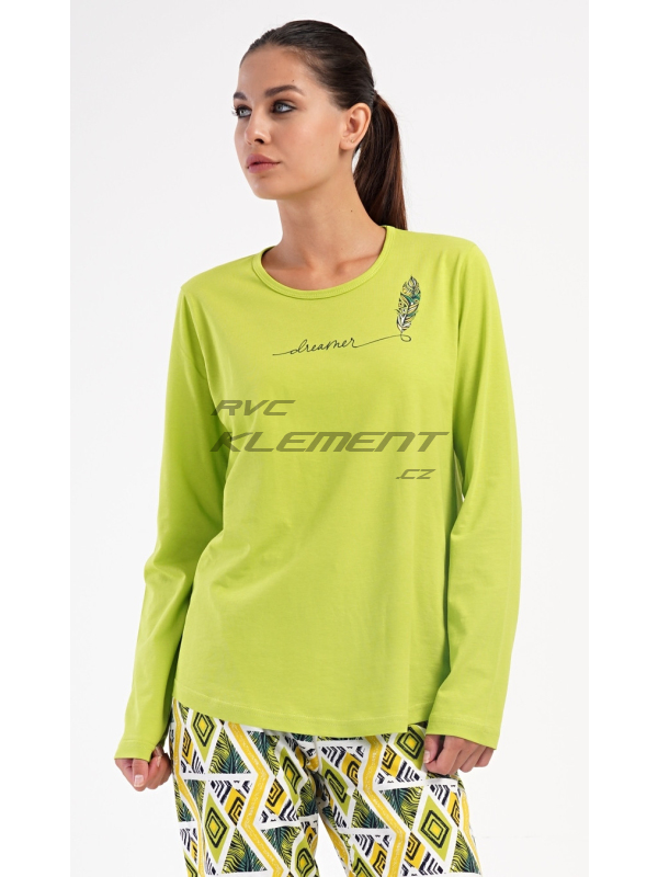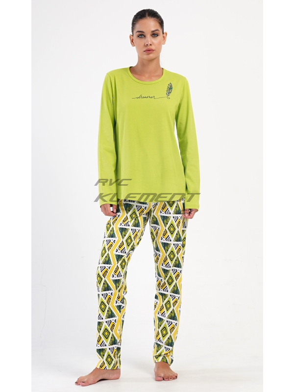 Dámské dlouhé pyžamo Zuzka. Dámské bavlněné dlouhé pyžamo Zuzka. Dámské pyžamo se skládá z trika s dlouhým rukávem a dlouhých kalhot. Triko je jednobarevné, zdobené obrázkem peříčka a nápisem ’Dreamer’. Kalhoty s pestrým potiskem mají v pase gumu a šňůrku na stažení, nemají kapsy. Použitý bavlněný materiál je poddajný a příjemný na dotek. Pokyny pro údržbu: - 100% bavlna Míry naměřené na výrobku: