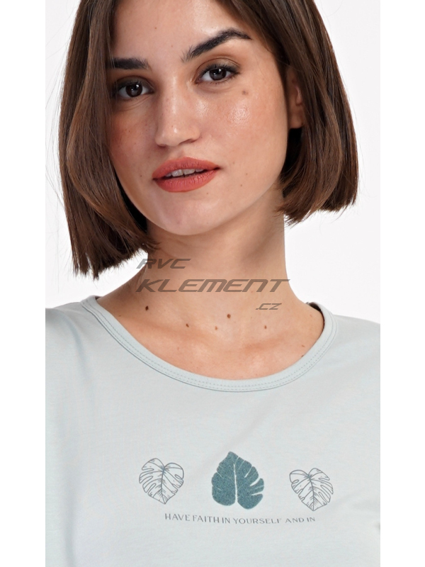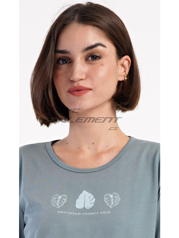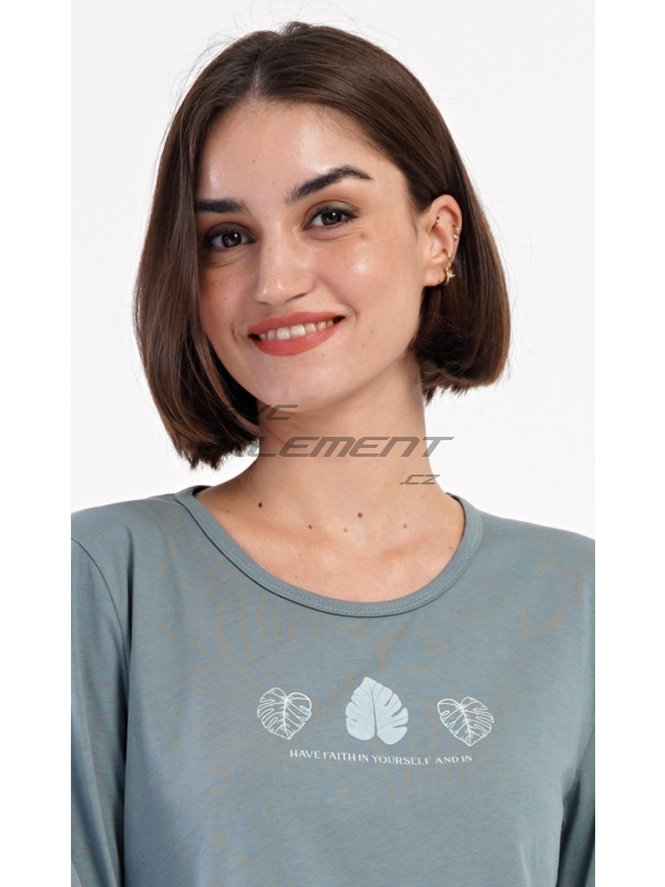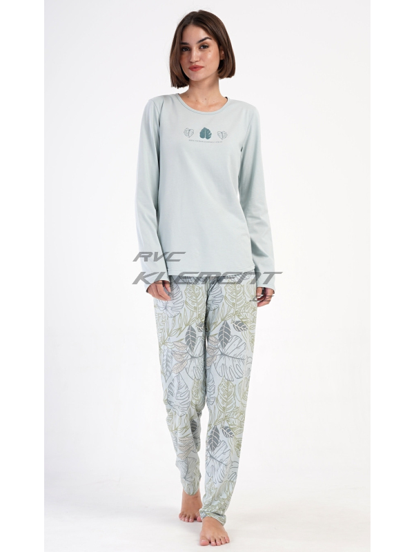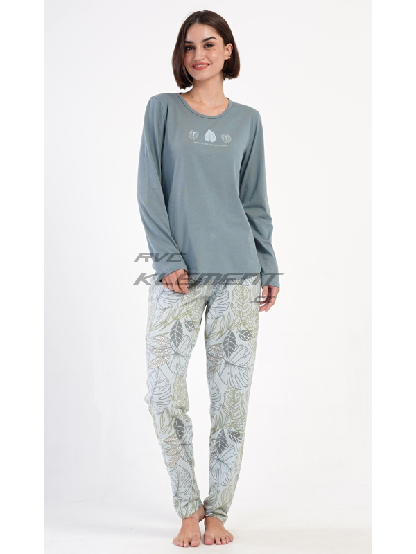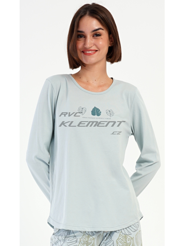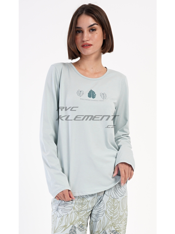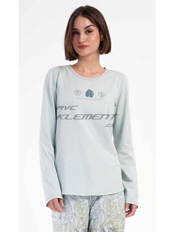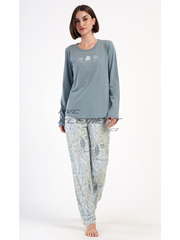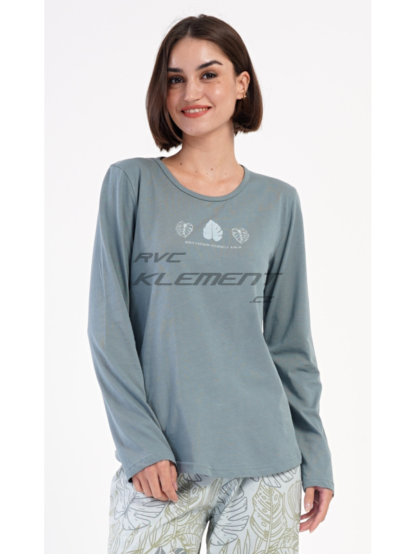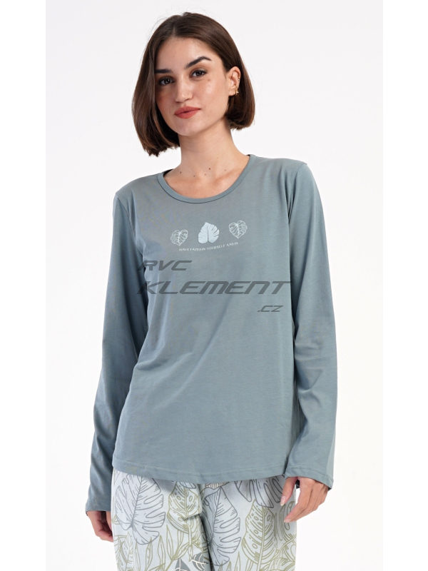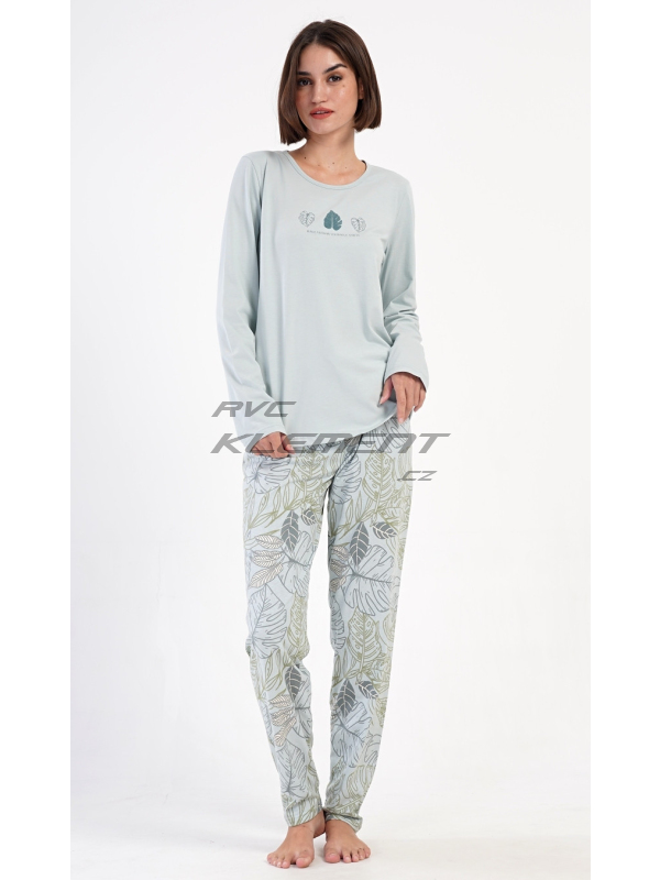 Dámské bavlněné dlouhé pyžamo Sofie. Dámské pyžamo se skládá z trika s dlouhým rukávem a dlouhých kalhot. Triko je jednobarevné, zdobené obrázkem listů a drobným nápisem. Motiv listů se opakuje i na kalhotách, které mají v pase gumu a šňůrku na stažení, nemají kapsy. Použitý bavlněný materiál je poddajný a příjemný na dotek.