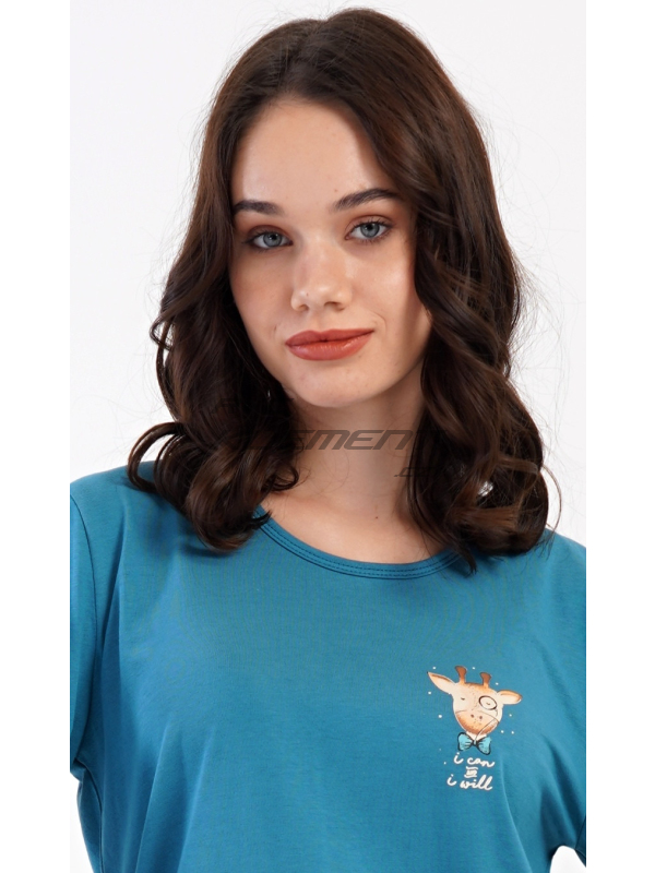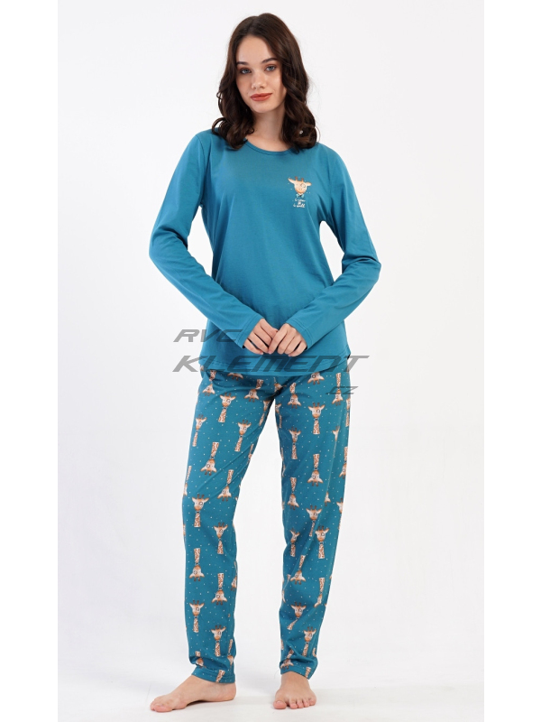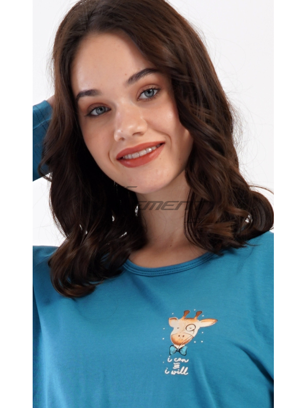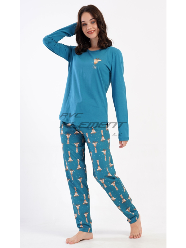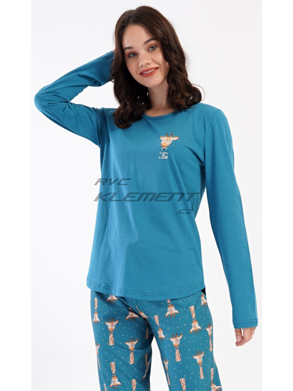 Dámské bavlněné dlouhé pyžamo Malá žirafa. Dámské pyžamo se skládá z trika s dlouhým rukávem a dlouhých kalhot. Triko je jednobarevné, zdobené obrázkem žirafí hlavičky. Obrázky malých žiraf se opakují i na kalhotách, které mají v pase gumu a šňůrku na stažení, nemají kapsy. Použitý bavlněný materiál je poddajný a příjemný na dotek.