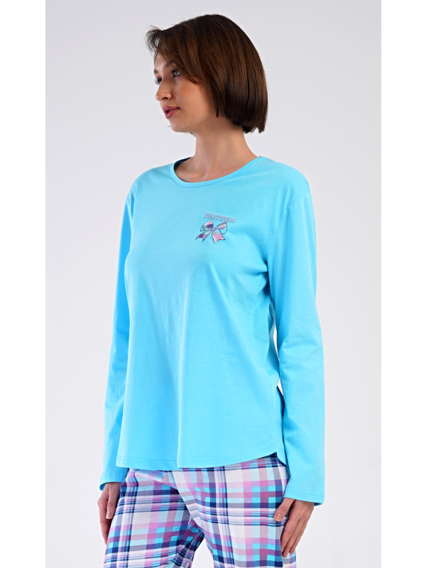Dámské bavlněné dlouhé pyžamo Happiness. Dámské pyžamo se skládá z trika s dlouhým rukávem a dlouhých kalhot. Triko je jednobarevné, zdobené obrázkem malé mašle a nápisem HAPPINESS. Kárované kalhoty mají v pase gumu a šňůrku na stažení, nemají kapsy. Použitý bavlněný materiál je poddajný a příjemný na dotek.