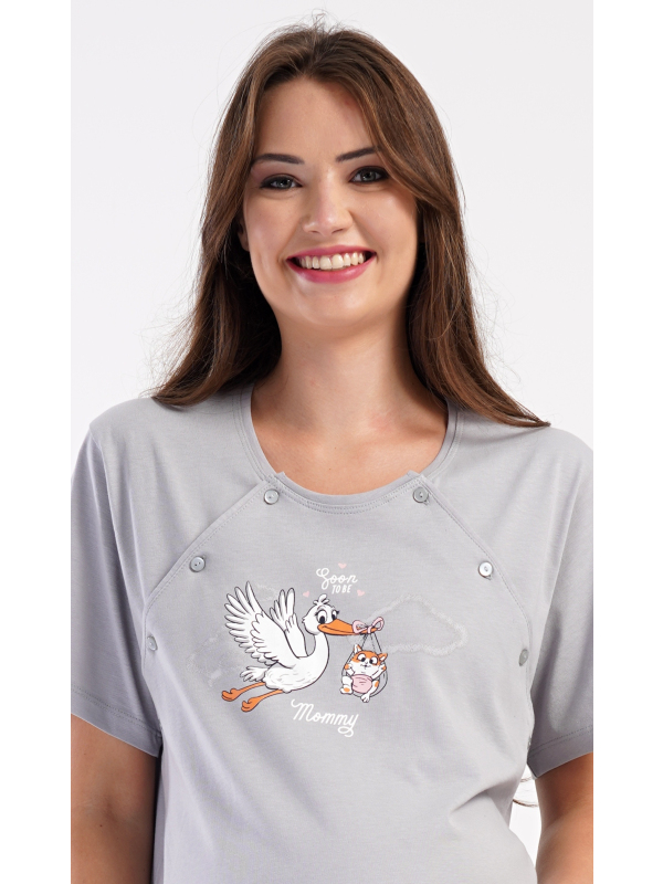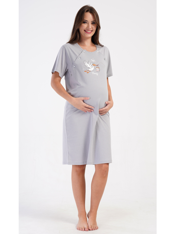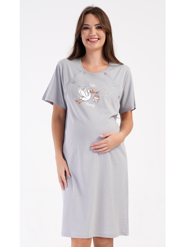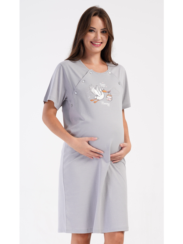 Dámská mateřská noční košile Čáp s miminkem. Dámská bavlněná mateřská noční košile Čáp s miminkem. Noční košile je svým střihem určená na dobu těhotenství, do porodnice i ke kojení. Ke kojení slouží průstřihy po stranách košile, které jsou uzavíratelné na knoflíky. Jednobarevná košile je na hrudi ozdobena obrázkem čápa, který nese v zobáku kotě. Použitý materiál s podílem bavlny 100% je příjemný a poddajný na dotek. Pokyny pro údržbu: - 100% bavlna Míry naměřené na výrobku: