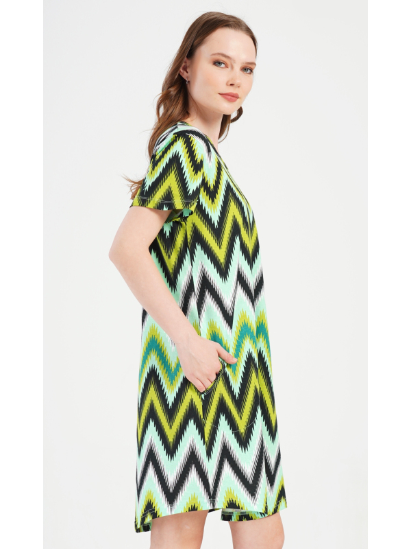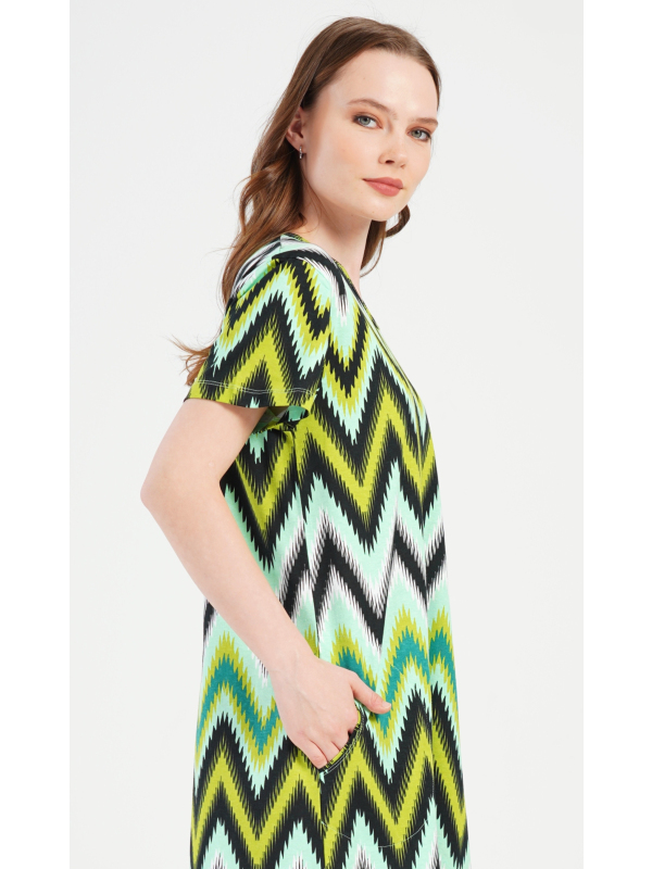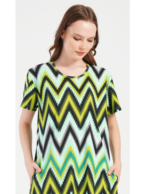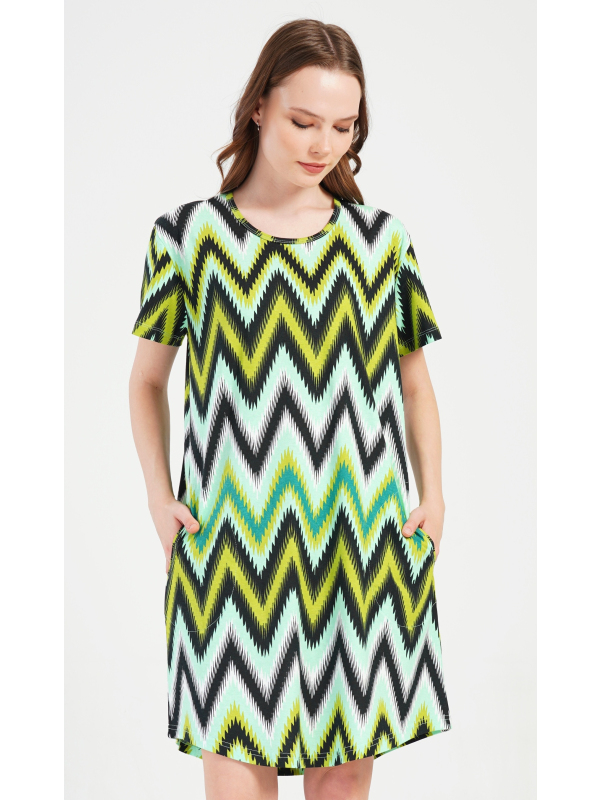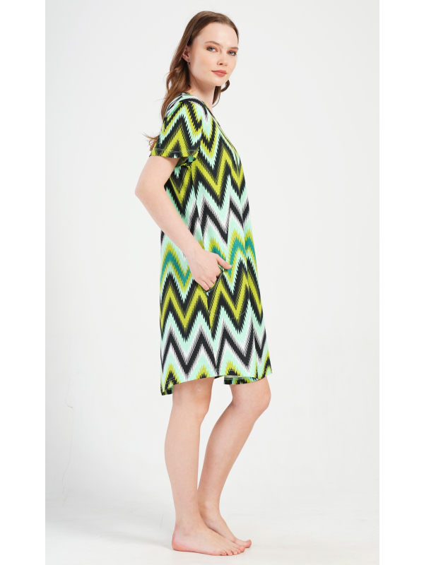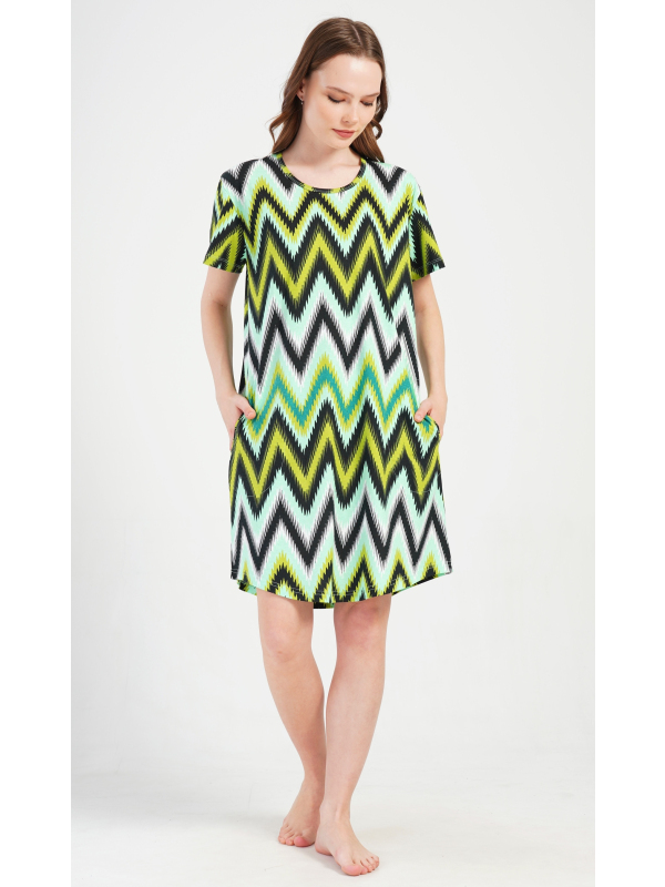 Dámské bavlněné domácí šaty s krátkým rukávem Zuzana. Domácí šaty s geometrickým zorem mají kulatý výstřih a praktické kapsy. Použitý bavlněný materiál je příjemný a poddajný na dotek. Šaty jsou pohodlné, využijete je téměř při všech volnočasových aktivitách. Jsou vhodné na spaní i na denní nošení.