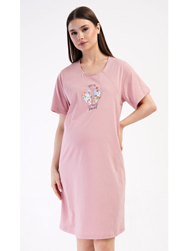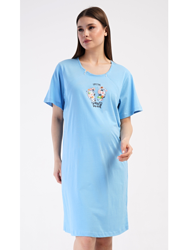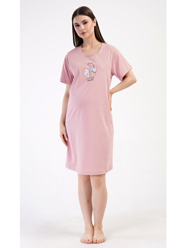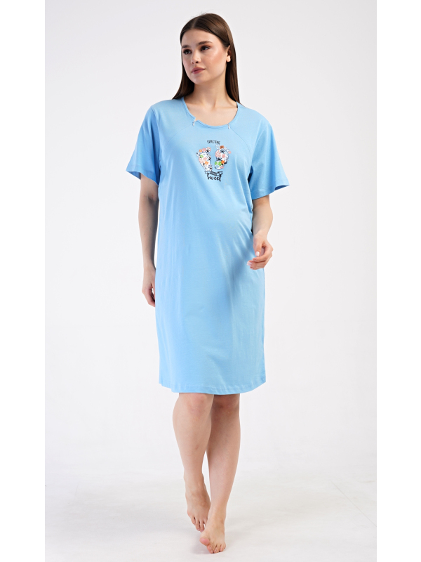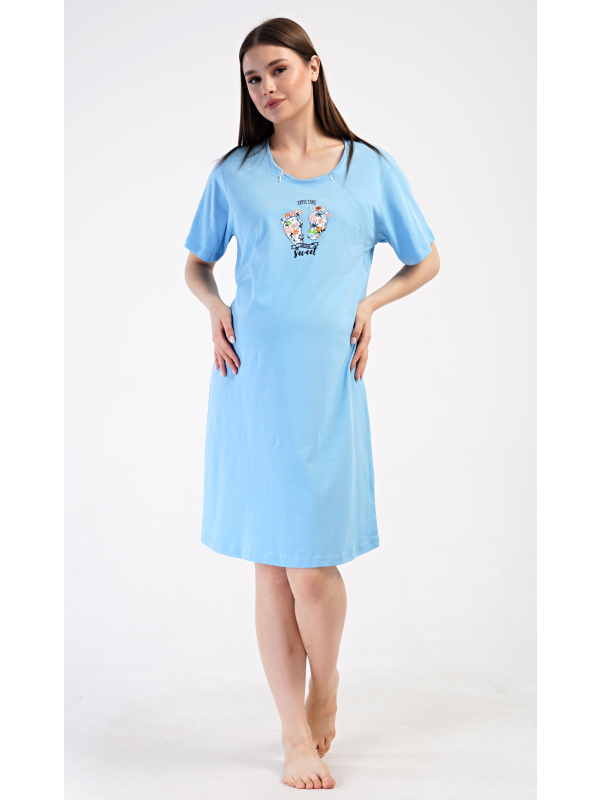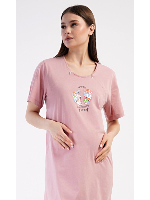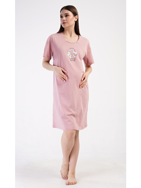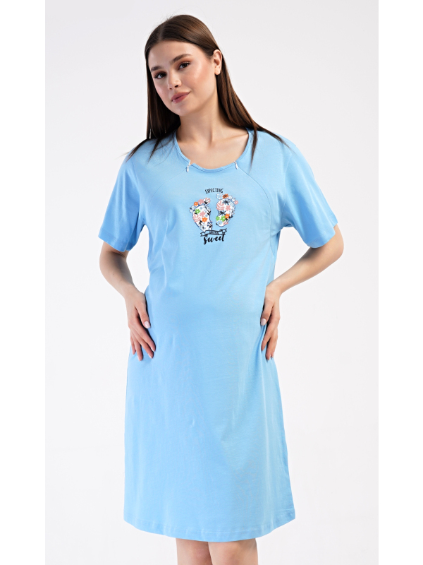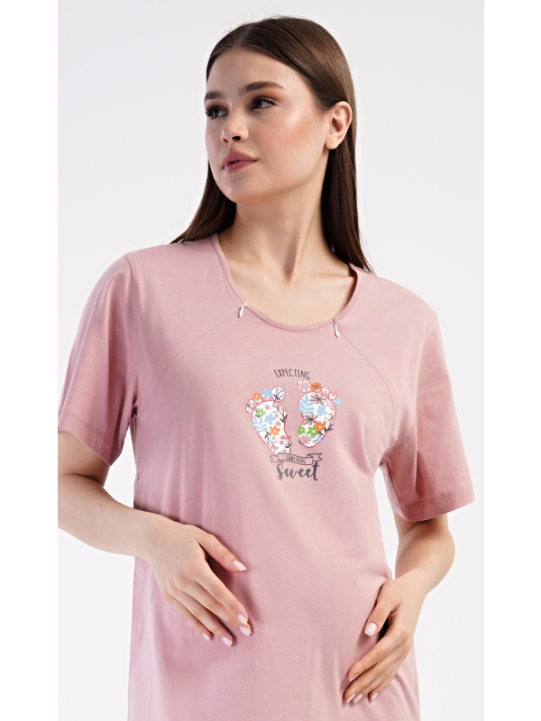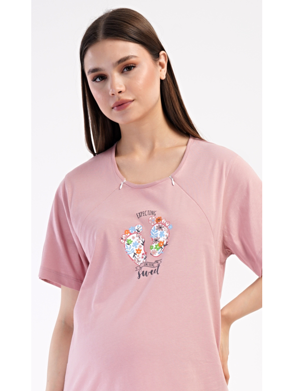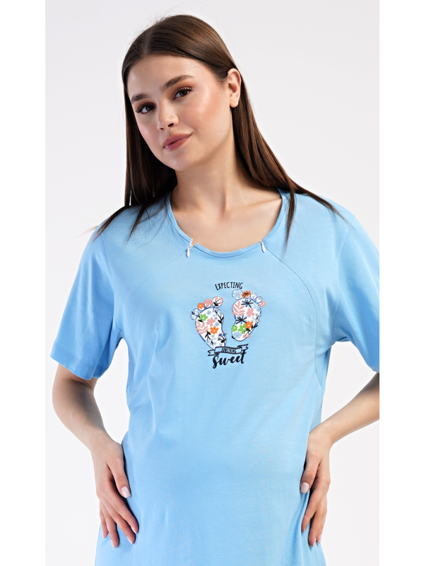 Dámská mateřská noční košile Sweet. Dámská bavlněná mateřská noční košile Sweet. Noční košile je svým střihem určená na dobu těhotenství, do porodnice i ke kojení. Ke kojení slouží průstřihy po stranách košile, které jsou uzavíratelné na zip. Přední díl košile zdobí obrázek dětských nožiček. Použitý materiál s podílem bavlny 100% je příjemný a poddajný na dotek. Pokyny pro údržbu: - 100% bavlna Míry naměřené na výrobku: