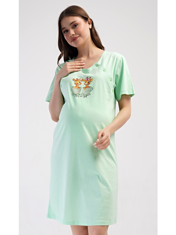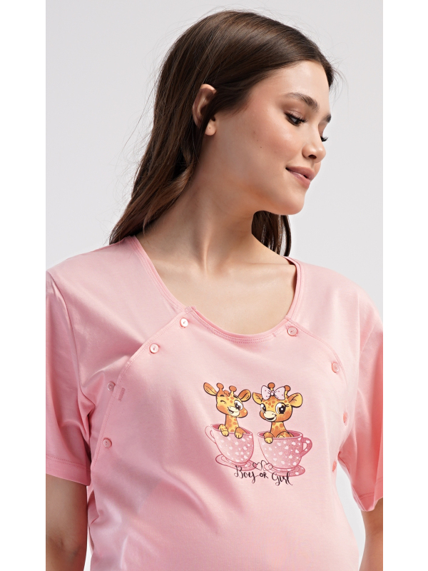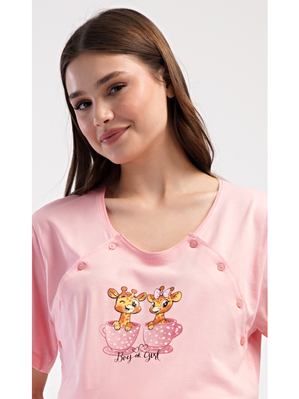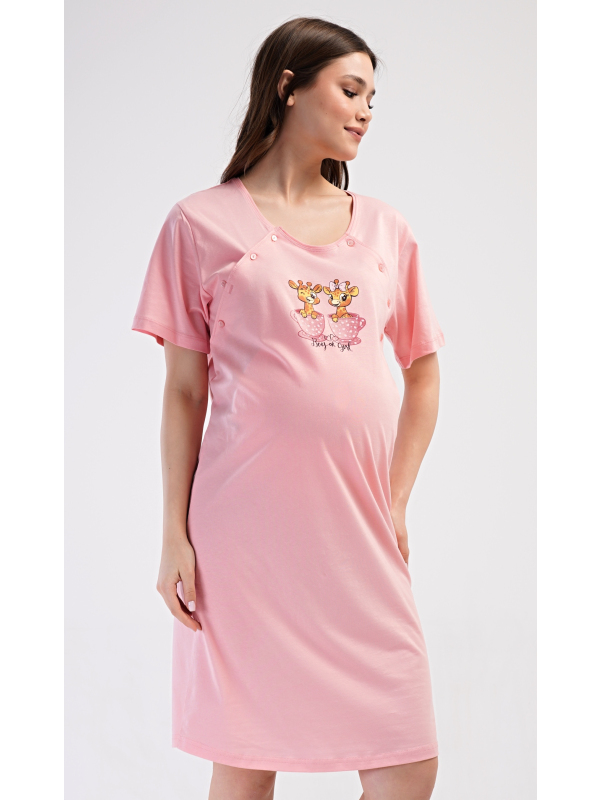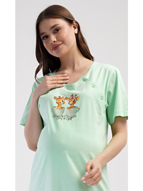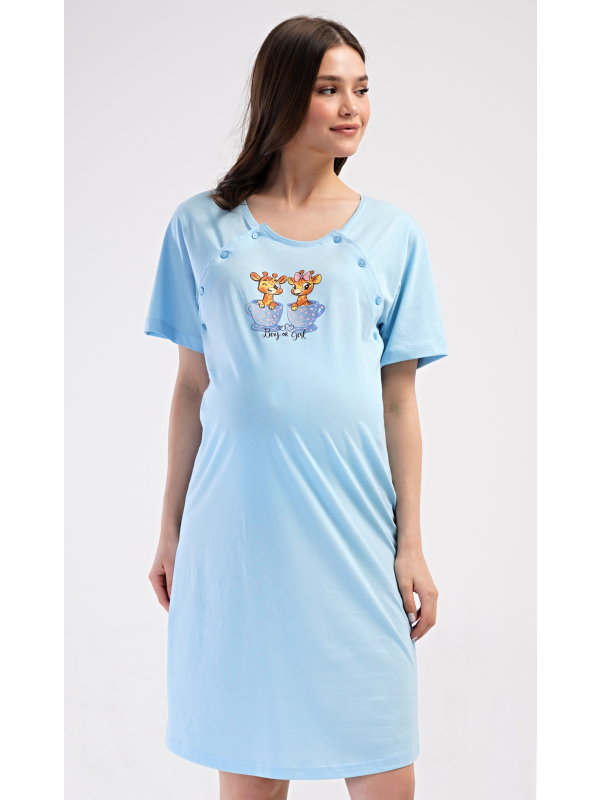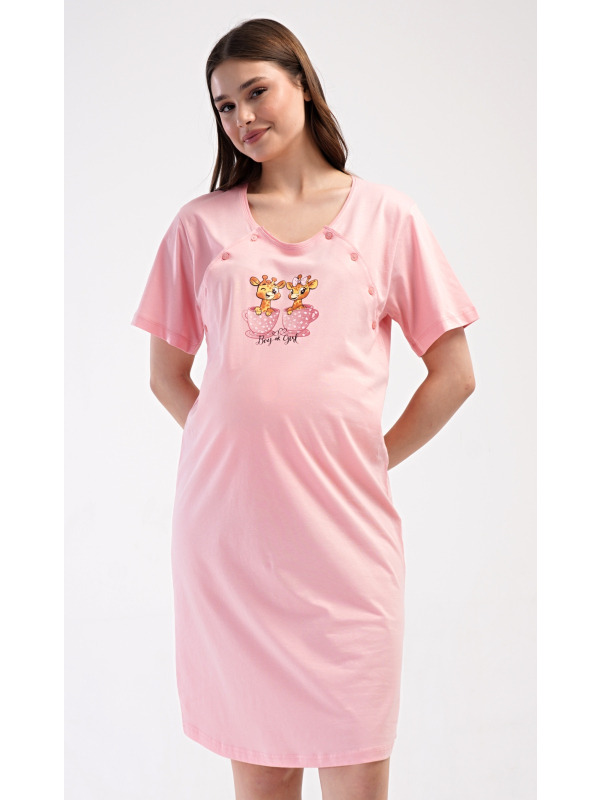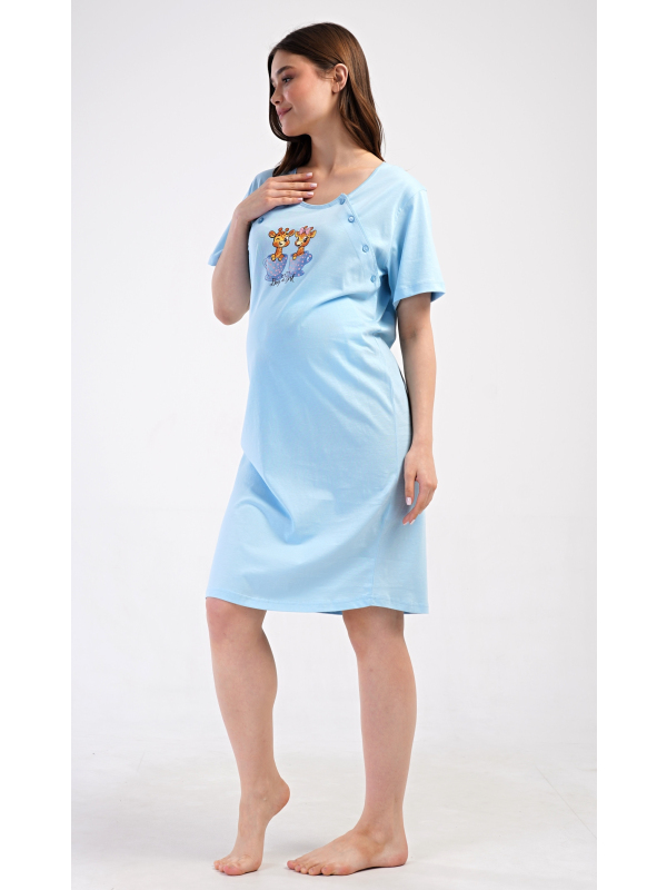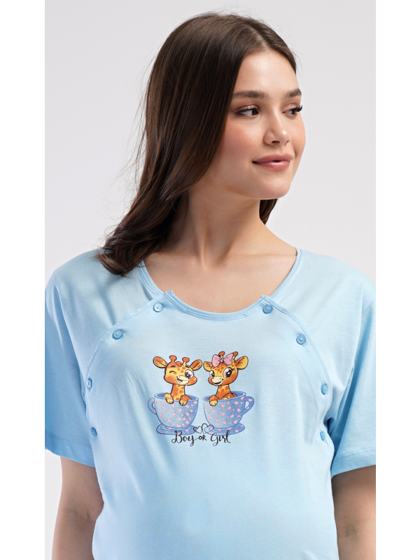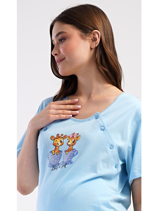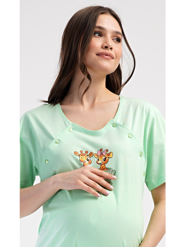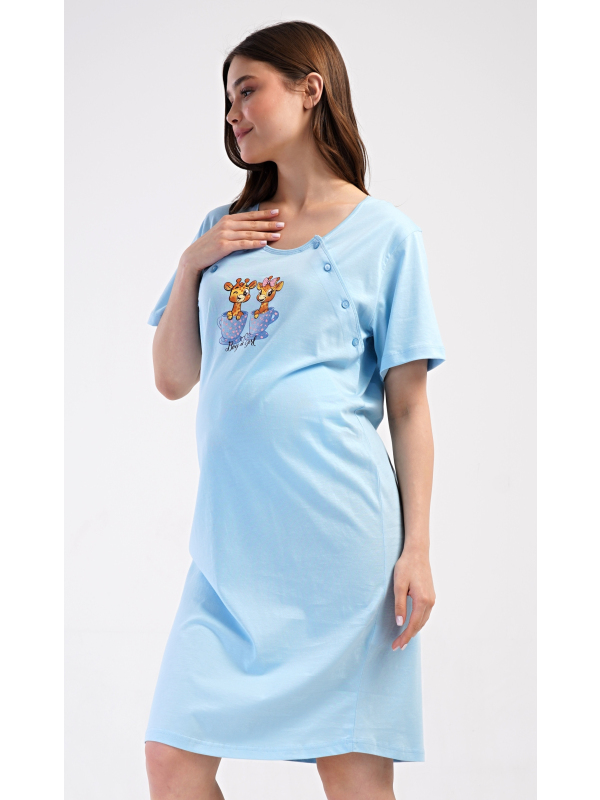 Dámská bavlněná mateřská noční košile Žirafy. Noční košile je svým střihem určená na dobu těhotenství, do porodnice i ke kojení. Ke kojení slouží průstřihy po stranách košile, které jsou uzavíratelné na knoflíky. Přední díl košile zdobí obrázek veselých žiraf. Použitý materiál s podílem bavlny 100% je příjemný a poddajný na dotek.