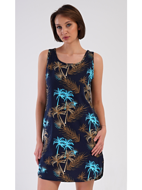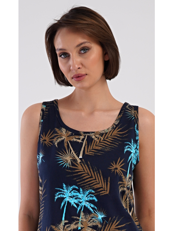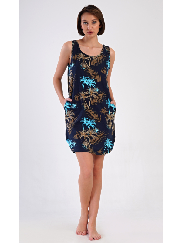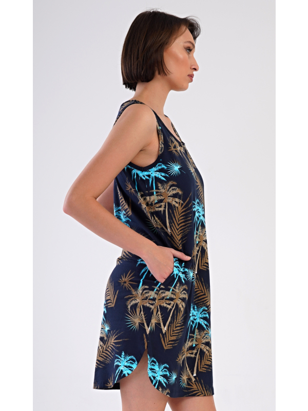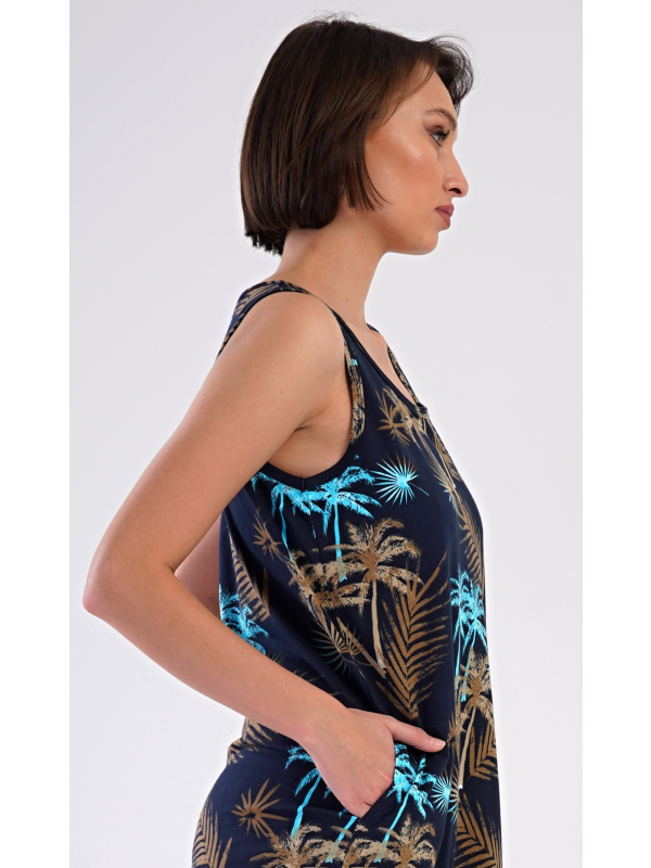 Dámská noční košile na ramínka Tropicana. Dámská bavlněná noční košile na ramínka Tropicana. Noční košile se širšími ramínky a kulatým výstřihem má praktické kapsy, je potištěna tropickými palmami. Použitý materiál s obsahem bavlny 100% je příjemný a poddajný na dotek. Košile je vhodná i na denní nošení, obvzlášť ji oceníte v horkých letních dnech. Pokyny pro údržbu: - 100% bavlna Míry naměřené na výrobku: