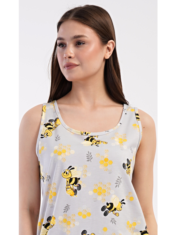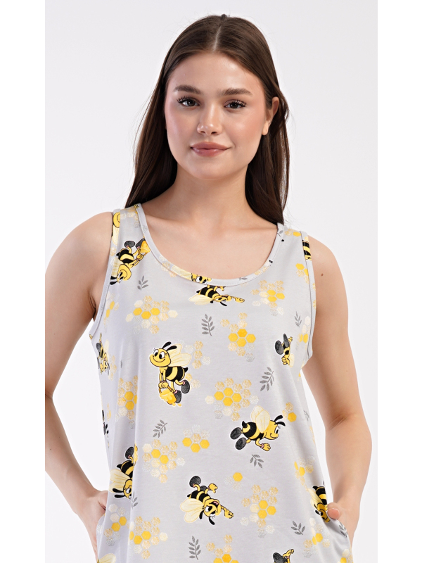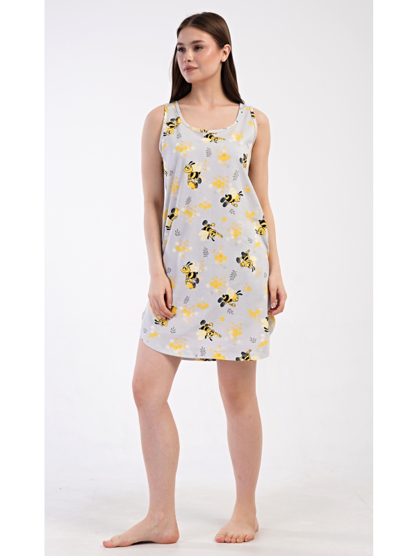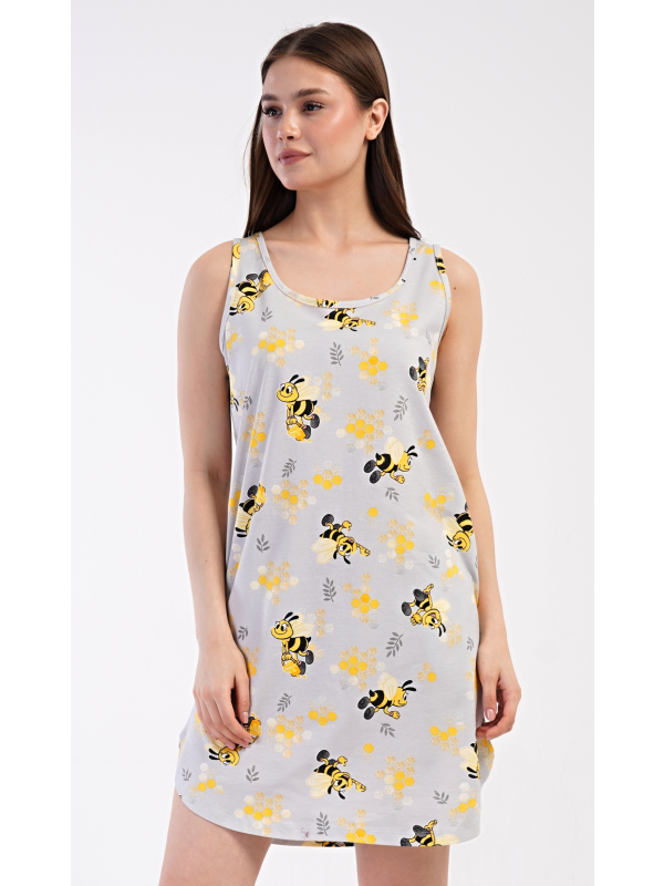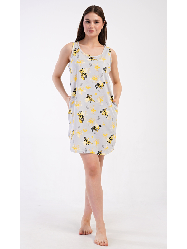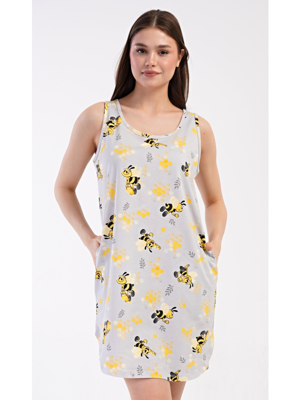 Dámská noční košile na ramínka Včelky. Dámská bavlněná noční košile na ramínka Včelky. Noční košile se širšími ramínky a kulatým výstřihem má praktické kapsy, je potištěna obrázky včelek. Použitý materiál s obsahem bavlny 100% je příjemný a poddajný na dotek. Košile je vhodná i na denní nošení, obvzlášť ji oceníte v horkých letních dnech. Pokyny pro údržbu: -100 % bavlna Míry naměřené na výrobku: