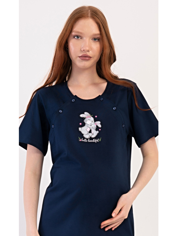 Dámská mateřská noční košile Zajíčci. Dámská bavlněná mateřská noční košile Zajíčci. Noční košile je svým střihem určená na dobu těhotenství, do porodnice i ke kojení. Ke kojení slouží průstřihy po stranách košile, které jsou uzavíratelné na knoflíky. Přední díl košile zdobí obrázek veselých zajíčků. Použitý materiál s podílem bavlny 100% je příjemný a poddajný na dotek. Pokyny pro údržbu: - 100% bavlna Míry naměřené na výrobku:
