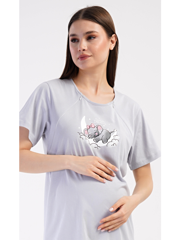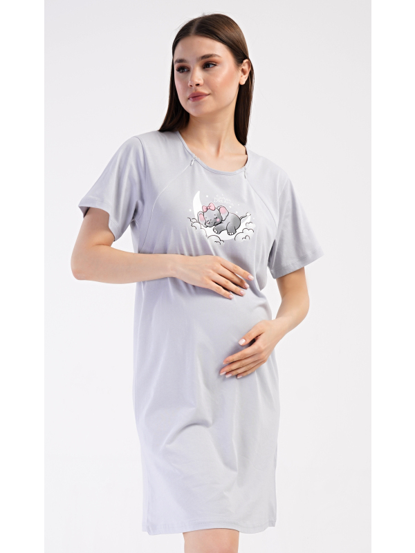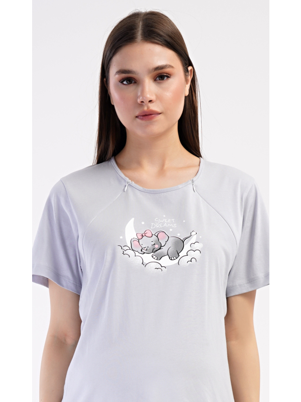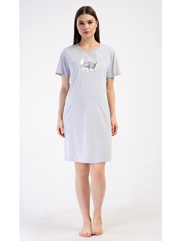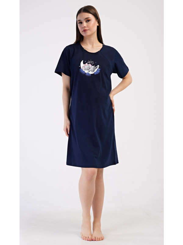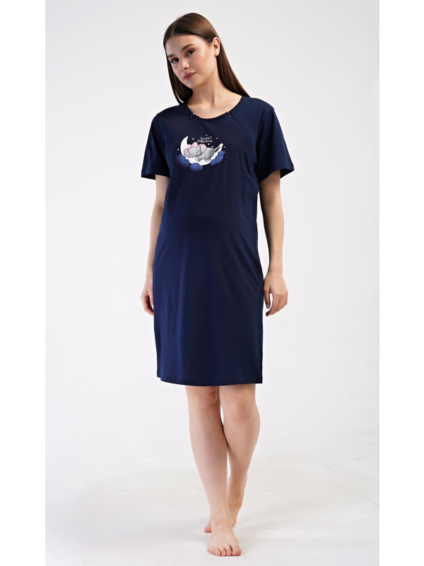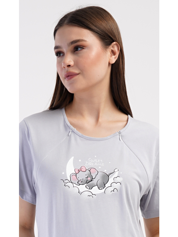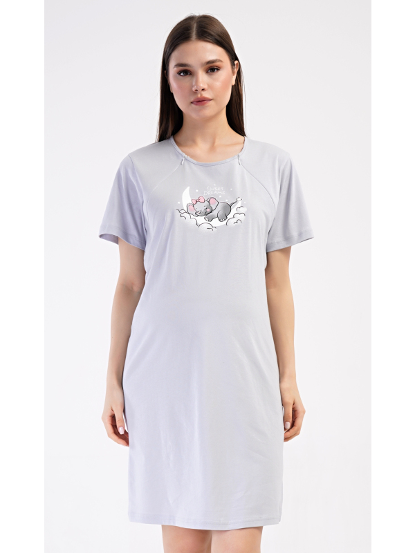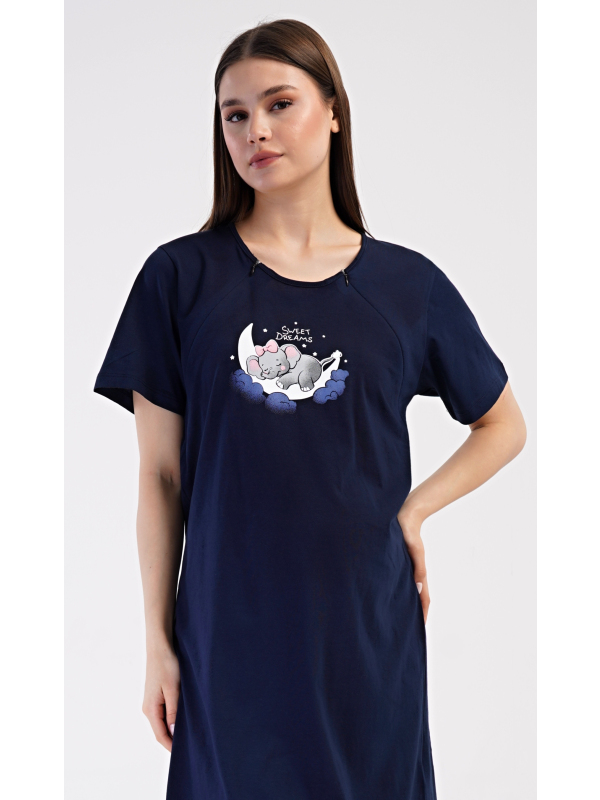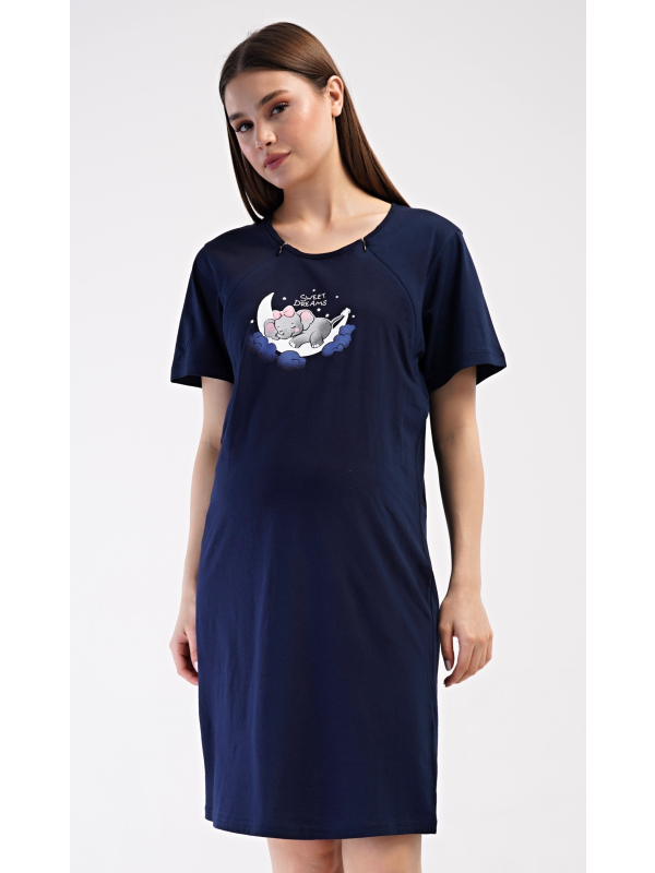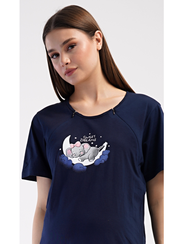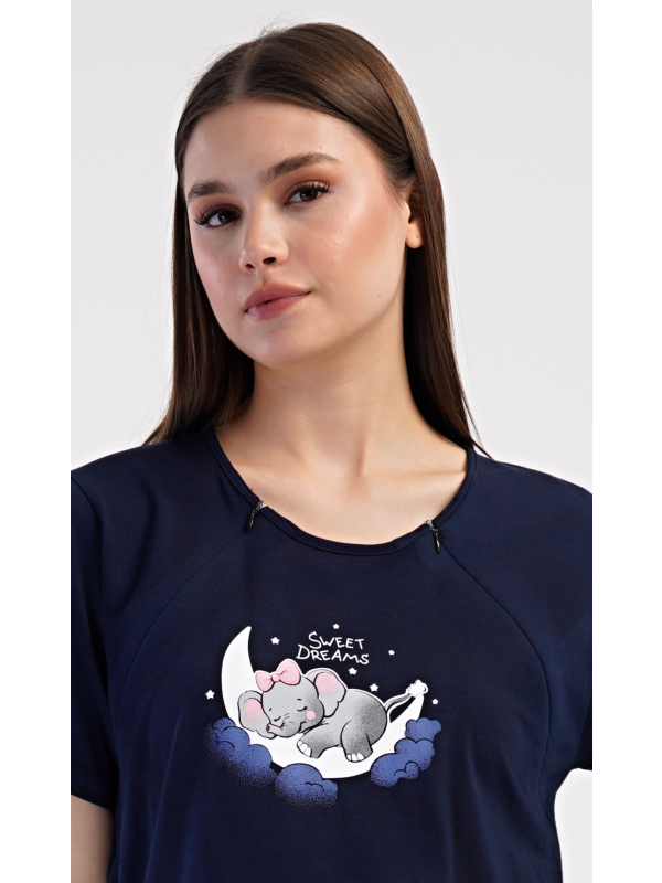 Dámská bavlněná mateřská noční košile Sweet dreams. Noční košile je svým střihem určená na dobu těhotenství, do porodnice i ke kojení. Ke kojení slouží průstřihy po stranách košile, které jsou uzavíratelné na zip. Přední díl košile zdobí obrázek slůněte, které odpočívá na měsíci. Použitý materiál s podílem bavlny 100% je příjemný a poddajný na dotek.