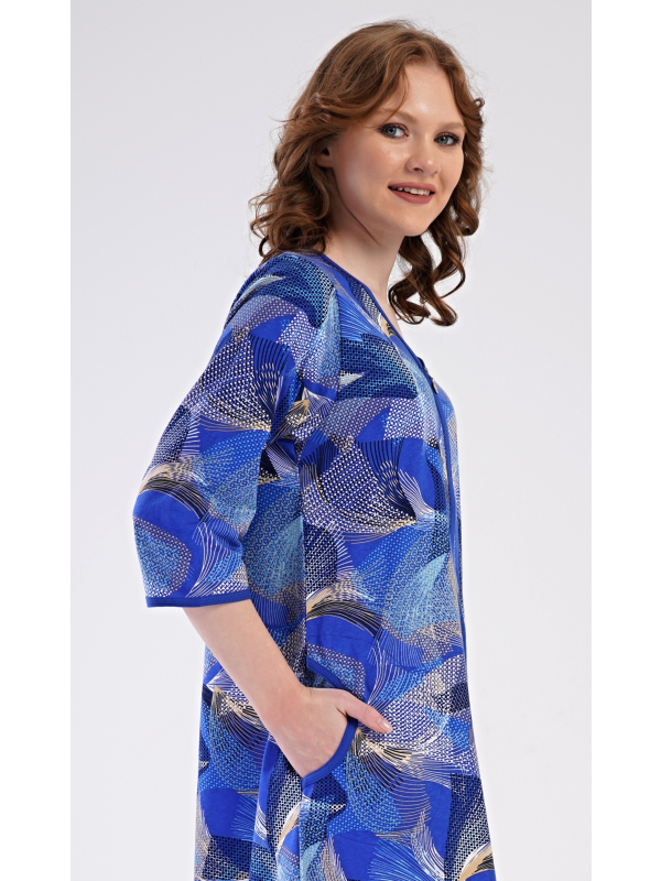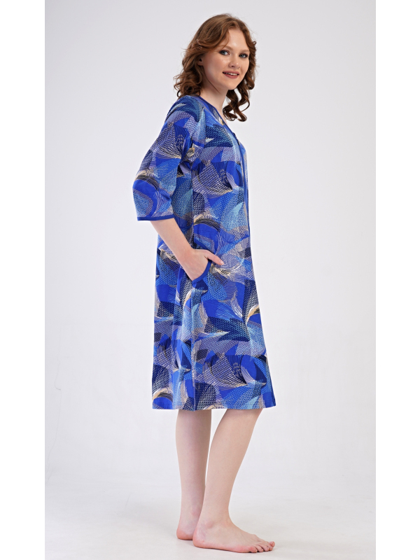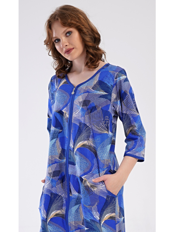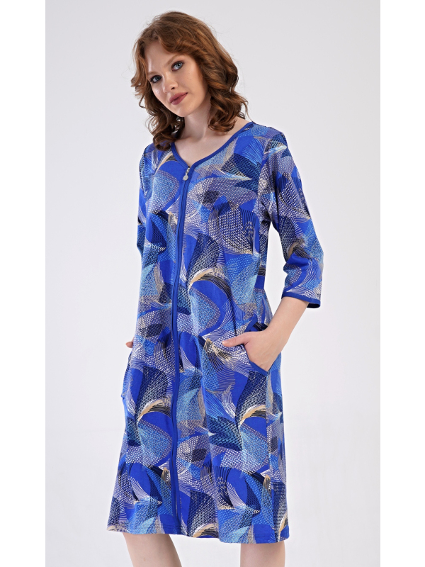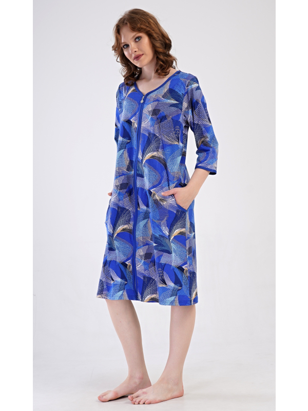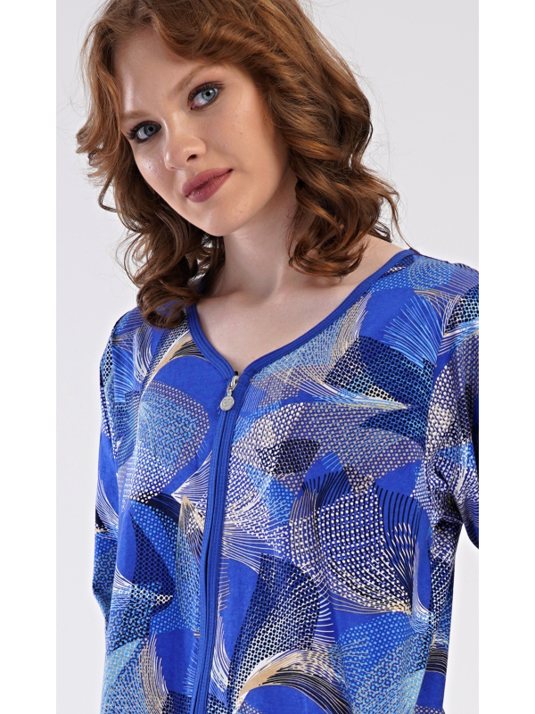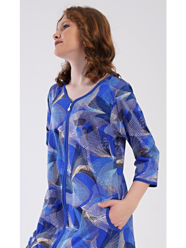 Dámské domácí šaty s tříčtvrtečním rukávem Eliza. Dámské bavlněné domácí šaty s tříčtvrtečním rukávem Eliza. Pohodlné rozepínací šaty v příjemné délce pod kolena využijete téměř při všech volnočasových aktivitách. Mají praktické kapsy a zapínání na zip. Šaty jsou potištěny geometrickými vzory. Použitý bavlněný materiál je příjemný a poddajný na dotek. Pokyny pro údržbu: -100 % bavlna Míry naměřené na výrobku: