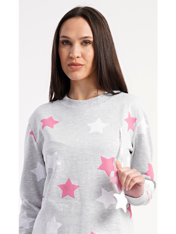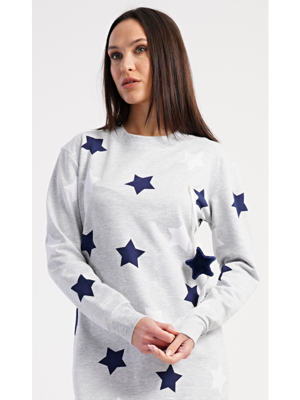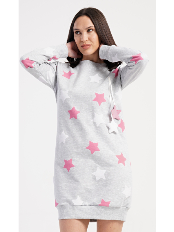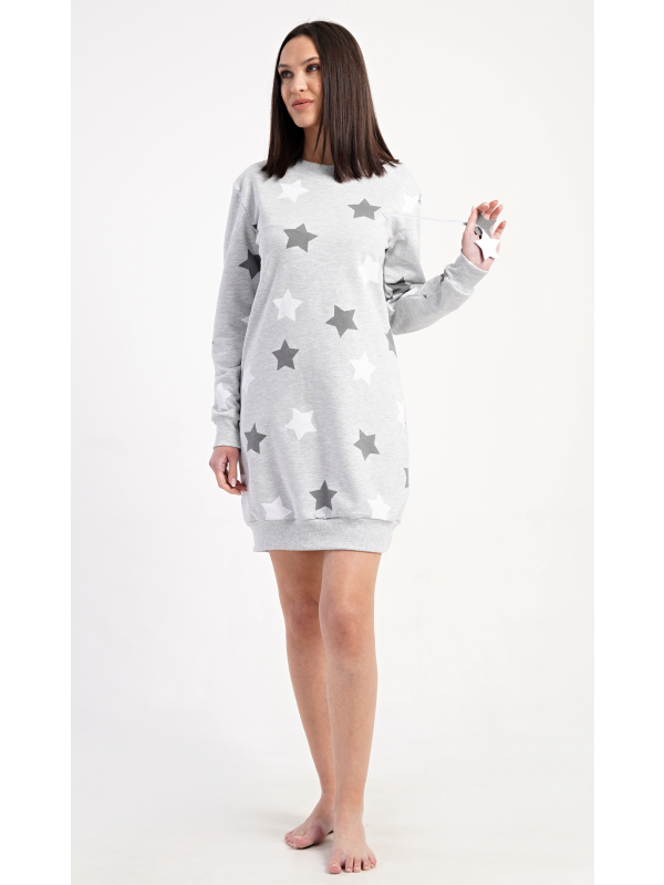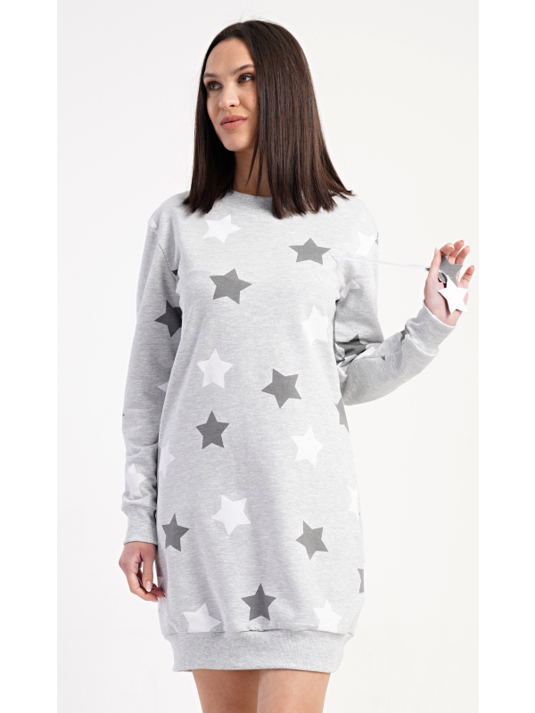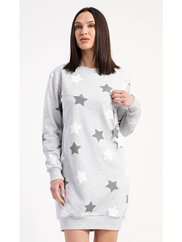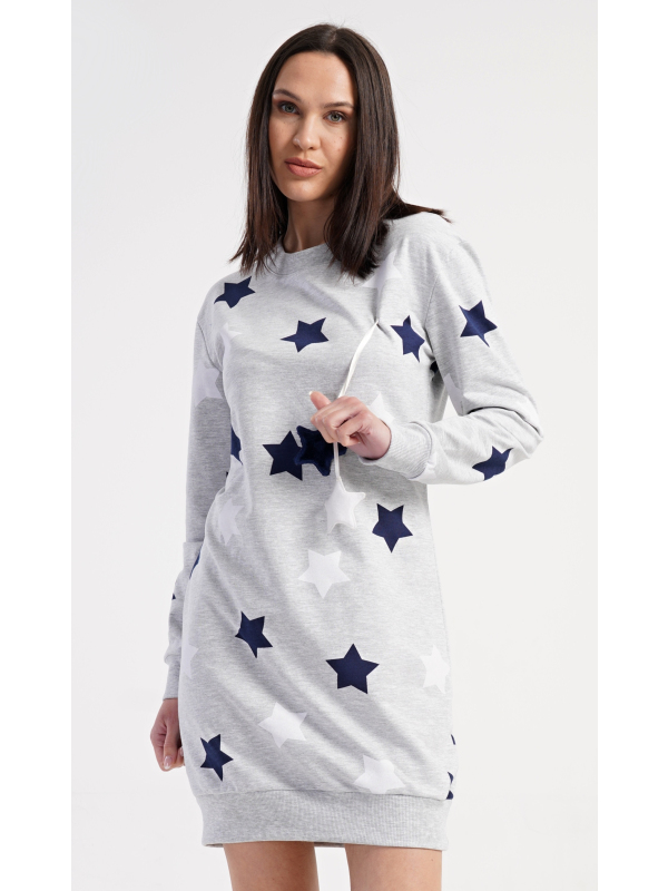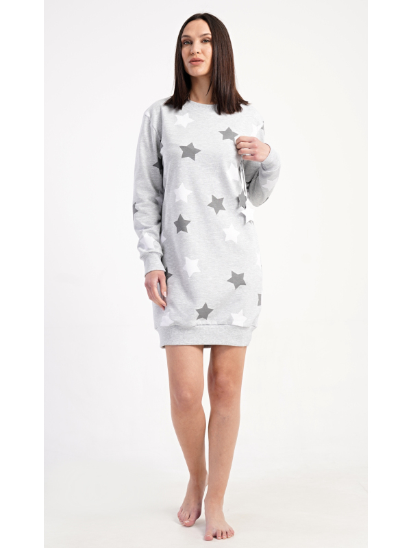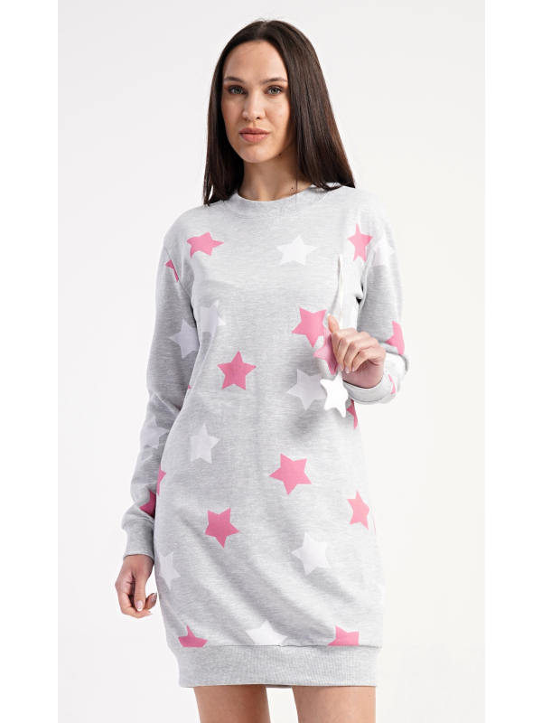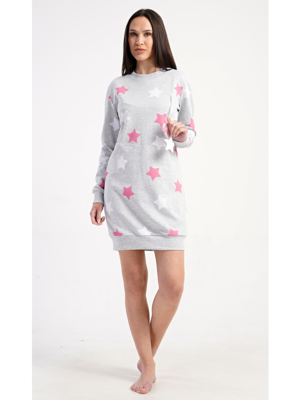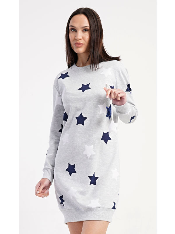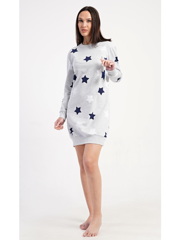 Dámské domácí šaty s dlouhým rukávem Hvězdy. Dámské domácí šaty s dlouhým rukávem Hvězdy. Pohodlné domácí šaty s dlouhým rukávem a kulatým výstřihem zdobí potisk hvězd. Použitý oteplený materiál s obsahem bavlny 70% je příjemný a poddajný na dotek. Pokyny pro údržbu: - 70% bavlna, 30% polyester Míry naměřené na výrobku: