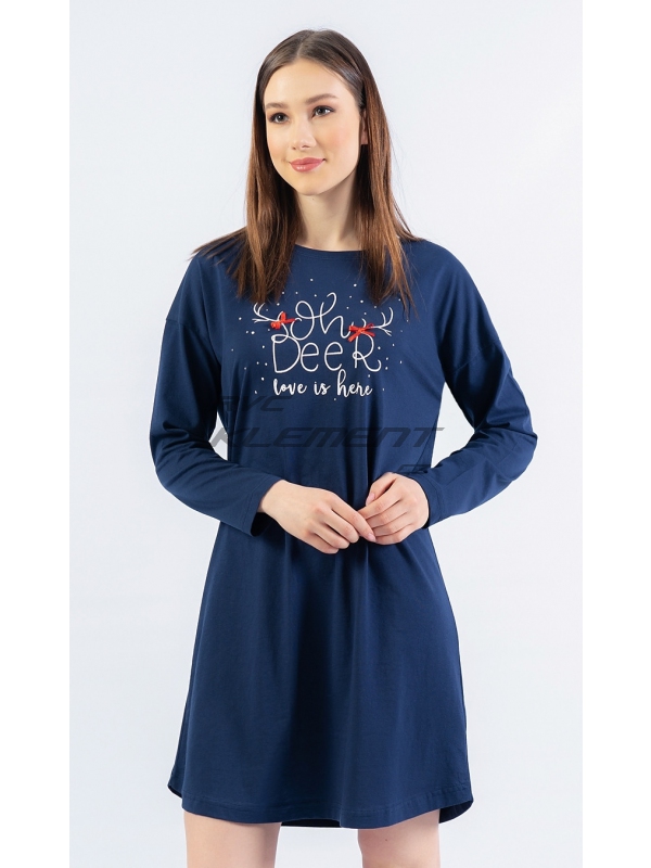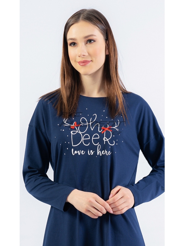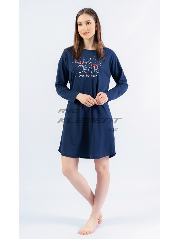 Dámská bavlněná noční košile s dlouhým rukávem Oh Deer. Dámská bavlněná noční košile s dlouhým rukávem Oh deer. Noční košile má na hrudi nápis ’Oh deer, love is here’. K nápisu jsou připojeny dva jelení parůžky a červené mašličky. Použitý bavlněný materiál je příjemný a poddajný na dotek. Pokyny pro údržbu: - 100% bavlna Míry naměřené na výrobku:
