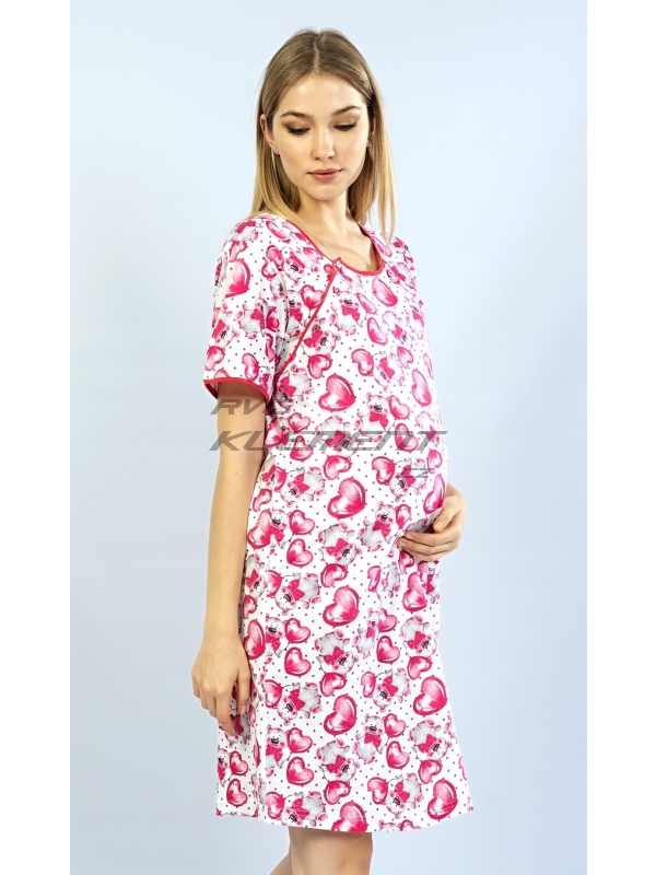 Dámská bavlněná mateřská noční košile Méďa se srdcem. Noční košile je svým střihem určená na dobu těhotenství, do porodnice i ke kojení. Ke kojení slouží průstřihy po stranách košile, které jsou uzavíratelné na knoflíky. Na puntíkatém podkladu košile jsou roztomilí medvídkové se srdíčkovými balonky. Použitý materiál s podílem bavlny 100% je příjemný a poddajný na dotek.
