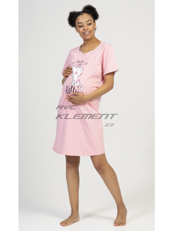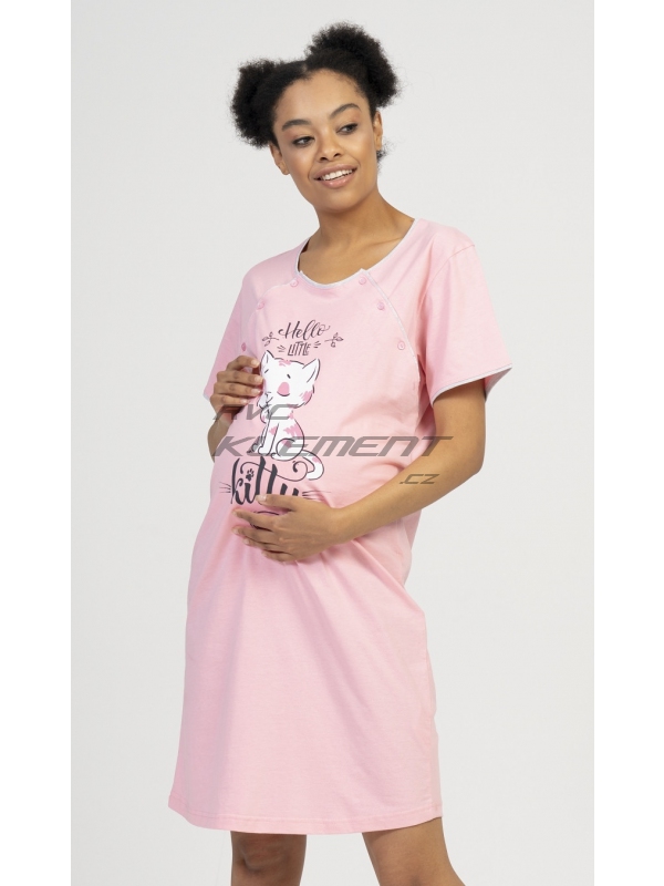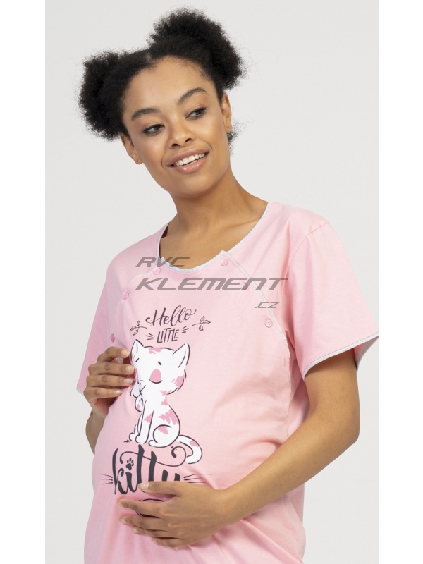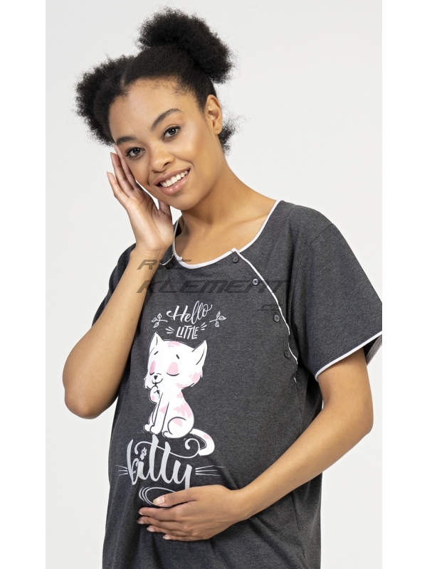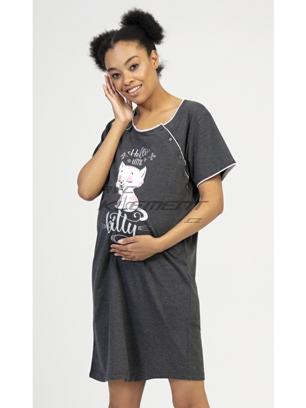 Dámská mateřská noční košile Little cat. Dámská mateřská noční košile Little cat. Mateřská noční košilka je svým střihem určená na dobu těhotenství, do porodnice i ke kojení. Ke kojení slouží průstřihy po stranách košile, které jsou uzavíratelné na knoflíky. Na hrudi je obrázek roztomilé kočičky s nápisem ’Hello Little kitty’. Použitý materiál s podílem bavlny 100% (70% u tmavě šedé barvy) je příjemný a poddajný na dotek. Pokyny pro údržbu: - 70% bavlna, 30% polyester Míry naměřené na výrobku: