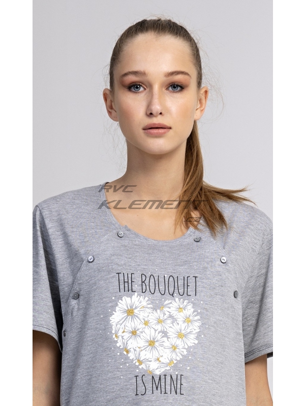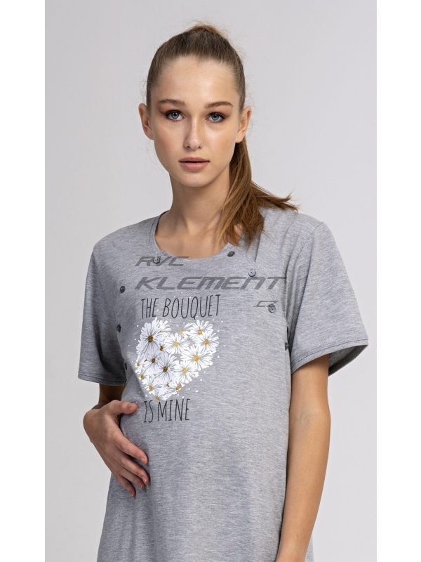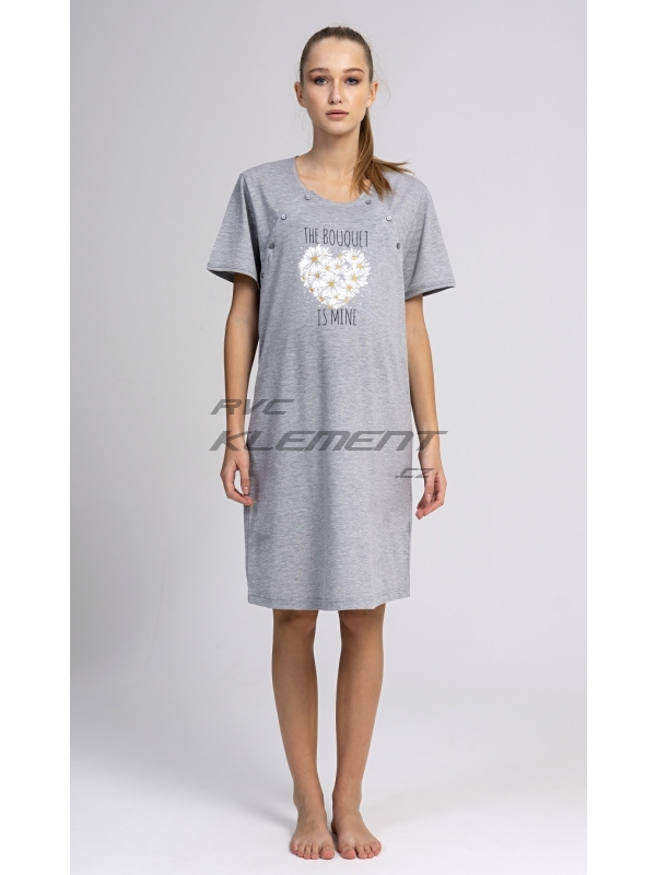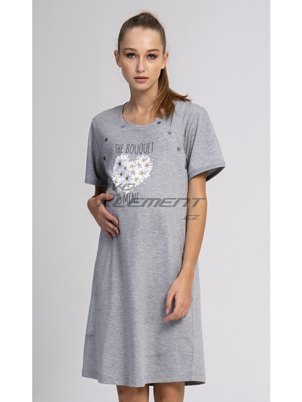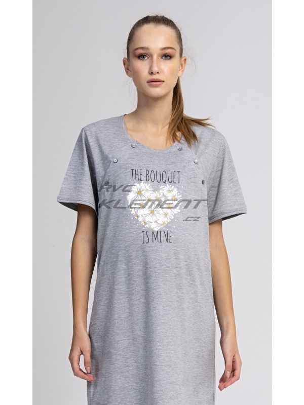 Dámská mateřská noční košile Srdce z kopretin. Dámská mateřská noční košile Srdce z kopretin. Dámská noční košile je svým střihem vhodná na období těhotenství, do porodnice, i ke kojení. Ke kojení slouží průstřihy po stranách košile, které jsou uzavíratelné na knoflíky. Na hrudi jinak jednobarevné košilky je srdíčko z kopretin s popisem ’The Bouguet is mine’. Použitý materiál s podílem bavlny 70% je příjemný a poddajný na dotek. Pokyny pro údržbu: - 70% bavlna, 30% polyester Míry naměřené na výrobku: