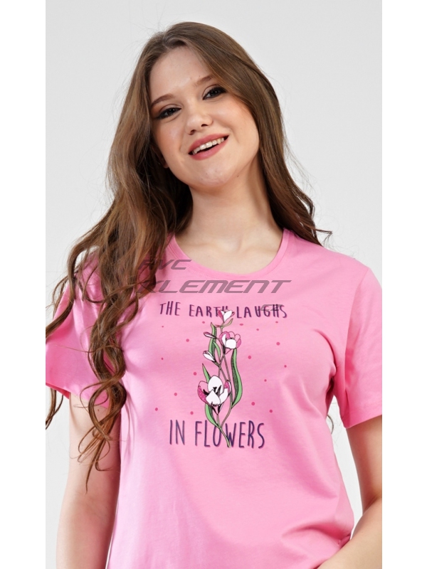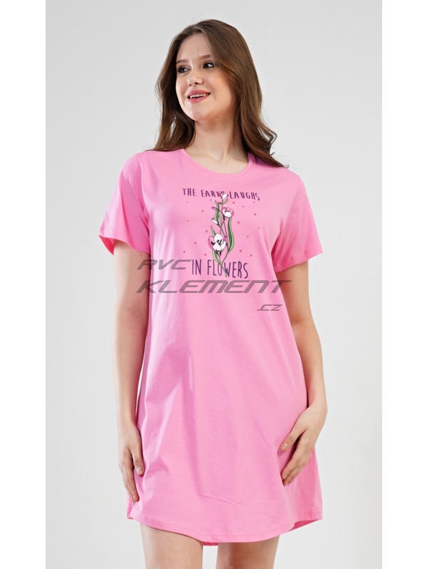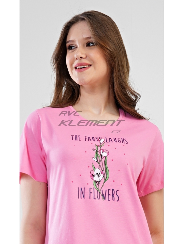 Dámská bavlněná noční košile s krátkým rukávem Flowers. Noční košile má na přední straně natištěný obrázek květin a nápis ’The Earth laughs in Flowers’. Použitý bavlněný materiál je příjemný a poddajný na dotek.