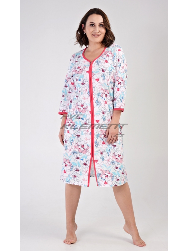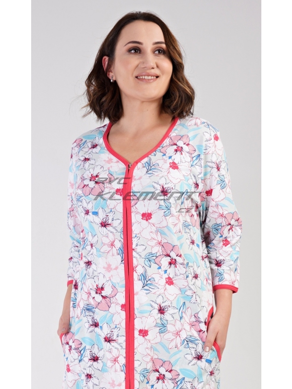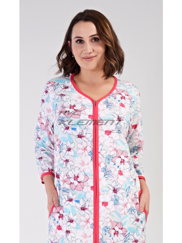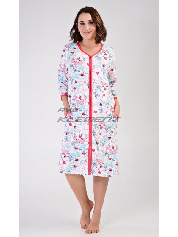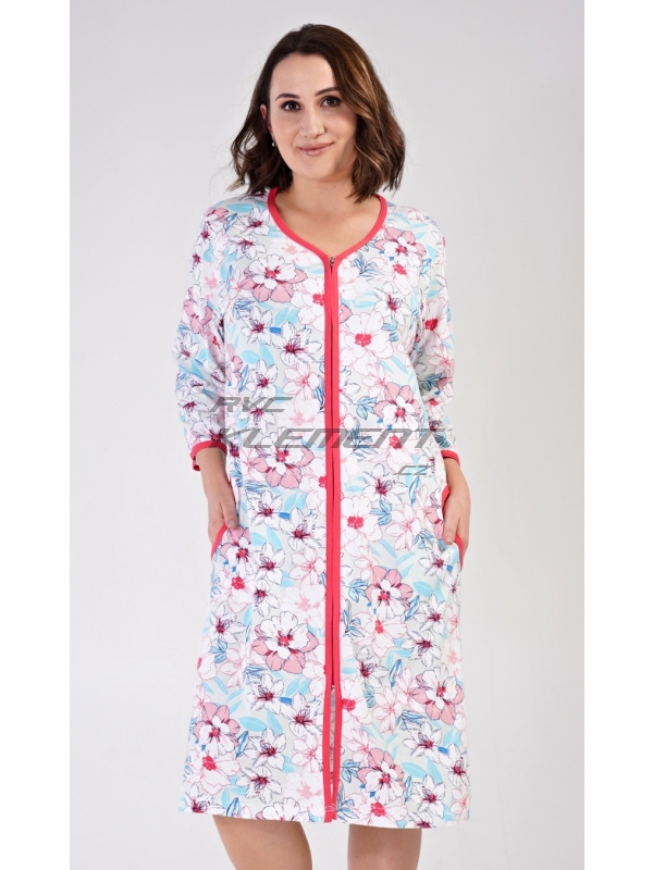 Dámské bavlněné domácí šaty s tříčtvrtečním rukávem Elen. Domácí šaty mají zapínání na zip a jsou ozdobené potiskem květin. Na předním díle jsou našité na bocích praktické kapsy. Bavlněný materiál je poddajný a příjemný na dotek.