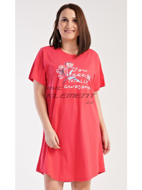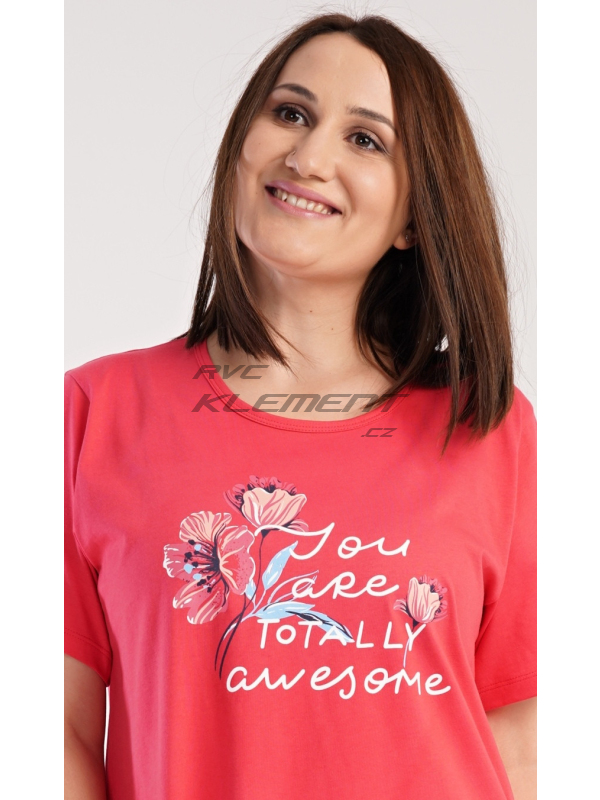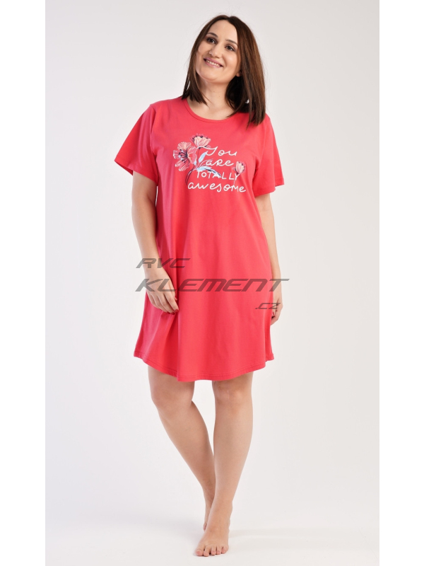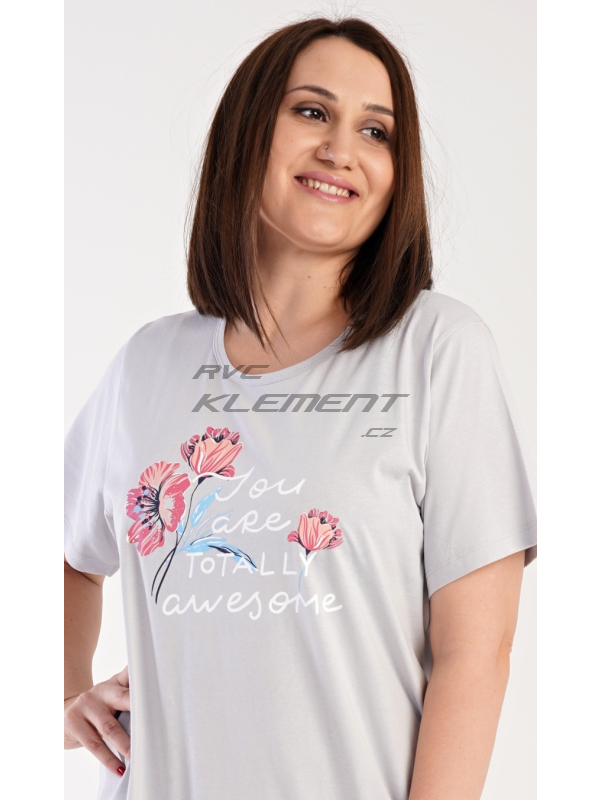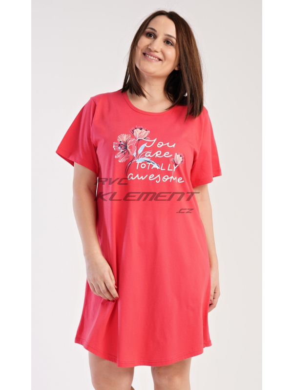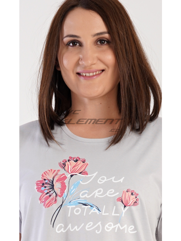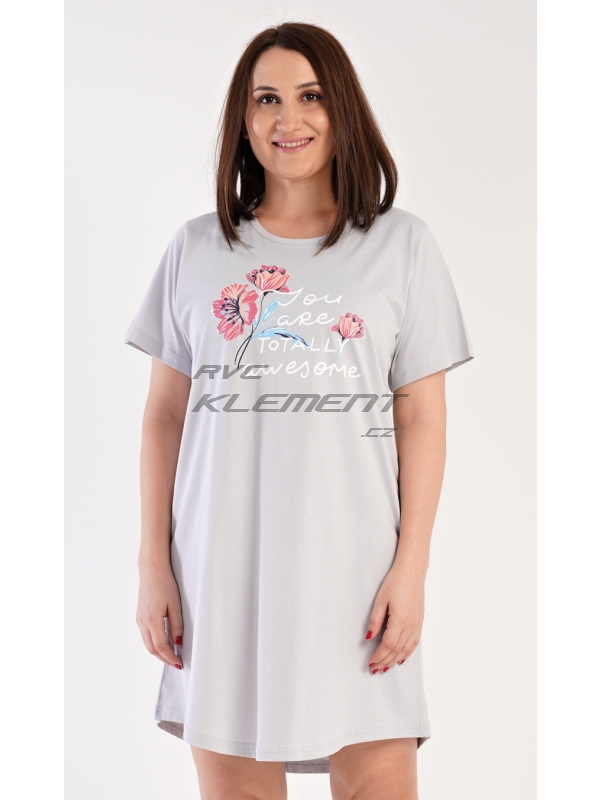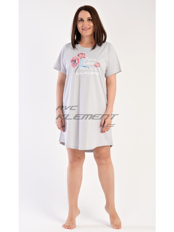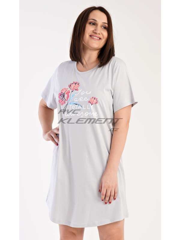 Dámská noční košile s krátkým rukávem Casandra. Dámská noční košile s krátkým rukávem Casandra. Noční košile s kulatým výstřihem má na hrudi obrázek květů a nápis ’You are totally awesome’. Použitý materiál je příjemný a poddajný na dotek. Obsah bavlny u korálové barvy je 100% a u světle šedé 70%. Pokyny pro údržbu: - 100% bavlna Míry naměřené na výrobku: