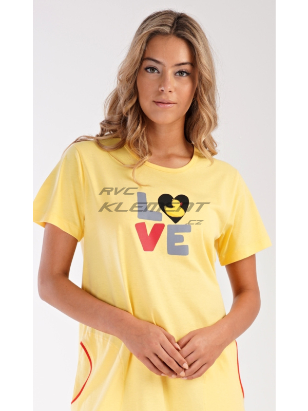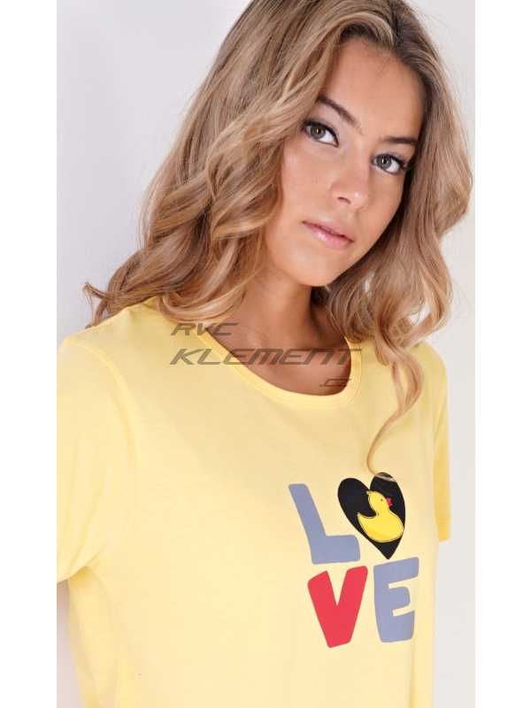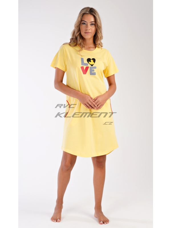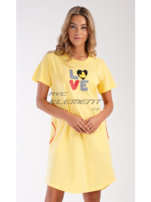 Dámské domácí šaty s krátkým rukávem Kačenka. Dámské bavlněné domácí šaty s krátkým rukávem Kačenka. Pohodlné jednobarevné domácí šaty s kulatým výstřihem jsou ozdobeny nápisem LOVE a obrázkem kačenky. Šaty mají praktické kapsy, které jsou olemovány kontrastní lemovkou. Použitý bavlněný materiál je příjemný a poddajný na dotek. Šaty jsou vhodné na spaní i na denní nošení. Pokyny pro údržbu: - 100% bavlna Míry naměřené na výrobku: