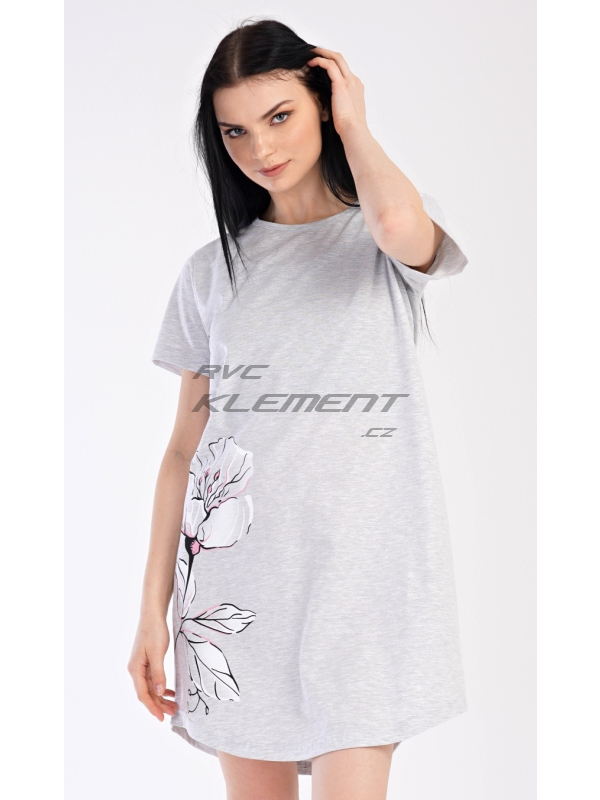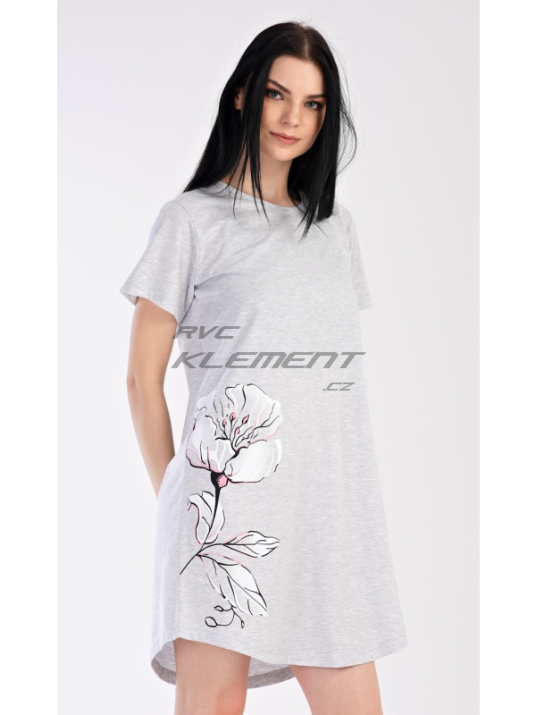Dámská noční košile s krátkým rukávem Nicolette. Noční košile s kulatým výstřihem má ve spodní části na boku obrázek květiny. Použitý materiál je příjemný a poddajný na dotek. Obsah bavlny u lososové barvy je 100% a u světle šedé 70%.