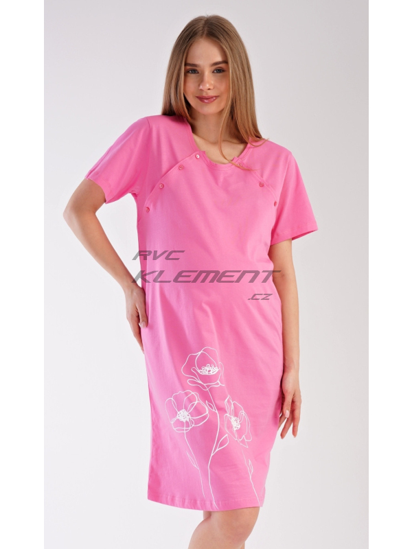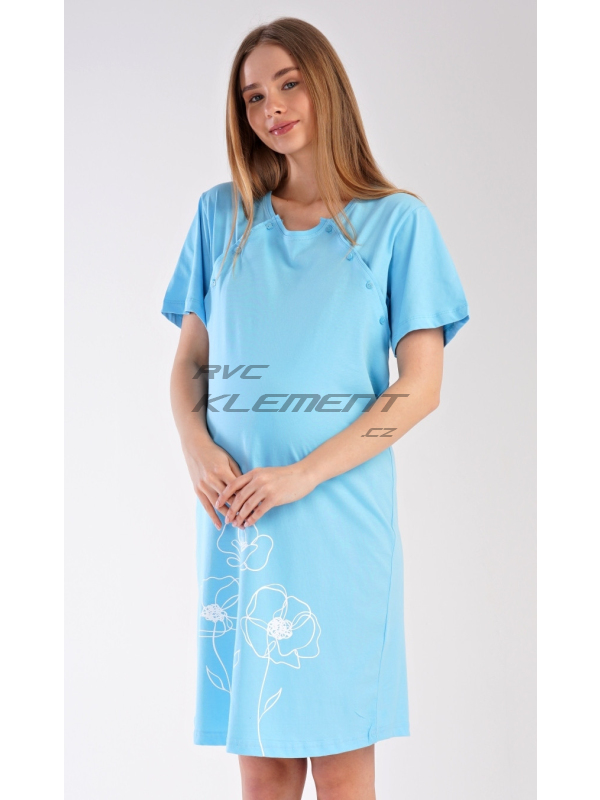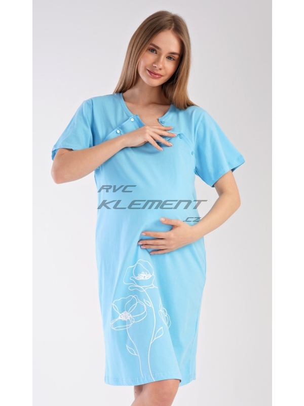 Dámská bavlněná mateřská noční košile Leontýna. Noční košile je svým střihem určená na dobu těhotenství, do porodnice i ke kojení. Ke kojení slouží průstřihy po stranách košile, které jsou uzavíratelné na knoflíky. Košile je ozdobena potiskem květů. Použitý materiál je příjemný a poddajný na dotek. Obsah bavlny u obou kombinací je 100%.