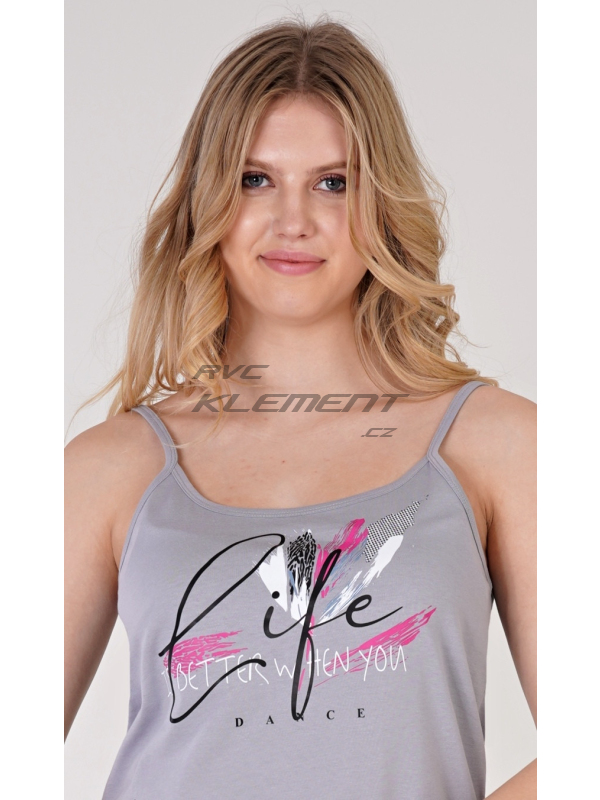 Dámská bavlněná noční košile na ramínka Life. Dámská bavlněná noční košile na ramínka Life. Dámská noční košilka na ramínka s barevným potiskem a nápisem ’Life is better when you dance’. Použitý materiál s obsahem bavlny 100% je příjemný a poddajný na dotek. Pokyny pro údržbu: -100 % bavlna Míry naměřené na výrobku: